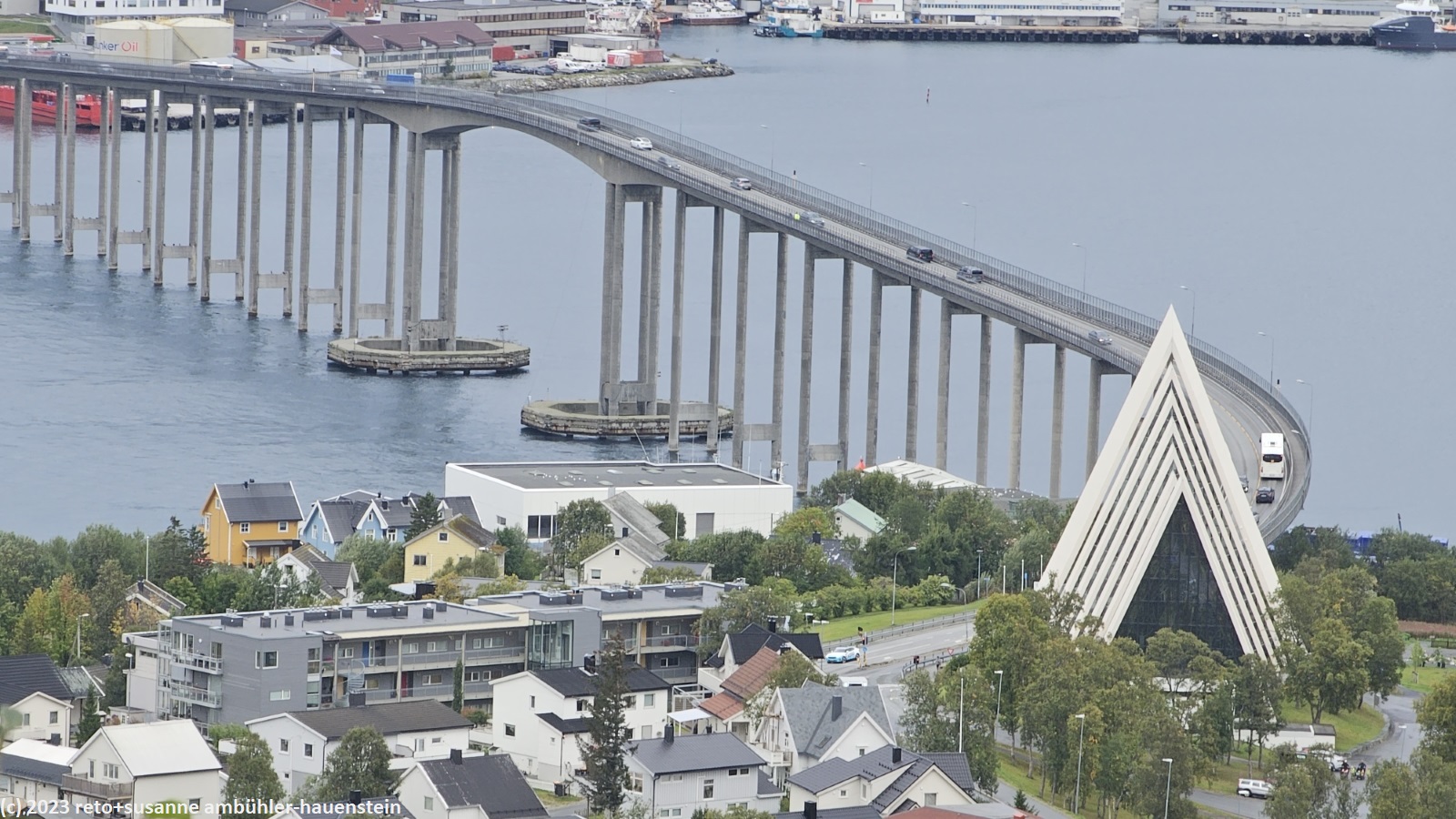 als wir um 8 uhr aufstehen fällt immer noch nieselregen und es ist ziemlich kühl, wir frühstücken daher im jogi. als wir gegen 09:45 uhr zu unserer kurzwanderung auf den storsteinen - den hausberg von tromsø - starten, ist es trocken. wir erklimmen die 1203 stufen der sherpatrappa. vom gipfel haben wir eine fantastische aussicht auf die stadt und die umgebung. wir erfrischen uns im sehr schönen restaurant bei der bergstation der luftseilbahn, danach geht es auf einem schmalen und stellen weise sehr steilen pfad zur tromsdalen kirke hinunter. für einen moment scheint die sonne und wir können ein paar schöne fotos von dieser speziellen kirche machen. anschliessend marschieren wir über die mächtige tromsøbrua auf die insel tromsøya, auf welcher sich das stadtzentrum befindet. wir spazieren an verschiedenen sehenswürdigkeiten und läden vorbei und essen schliesslich in einem hübschen restaurant zu mittag. danach besuchen wir unter anderem eine glasbläserei. bevor wir zum campingplatz zurückkehren, kaufen wir ein und erfrischen uns mit einem heissen tee. vor dem nachtessen geniessen wir eine sitzung in der sauna. den abend verbringen wir im jogi mit büchernachführen und erkunden von möglichkeiten in der verbleibenden zeit in finnland.