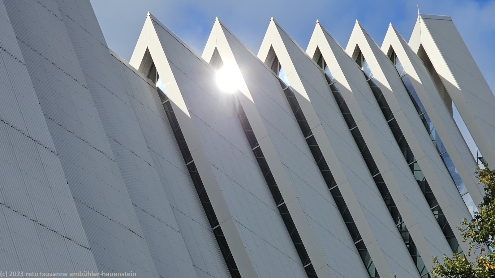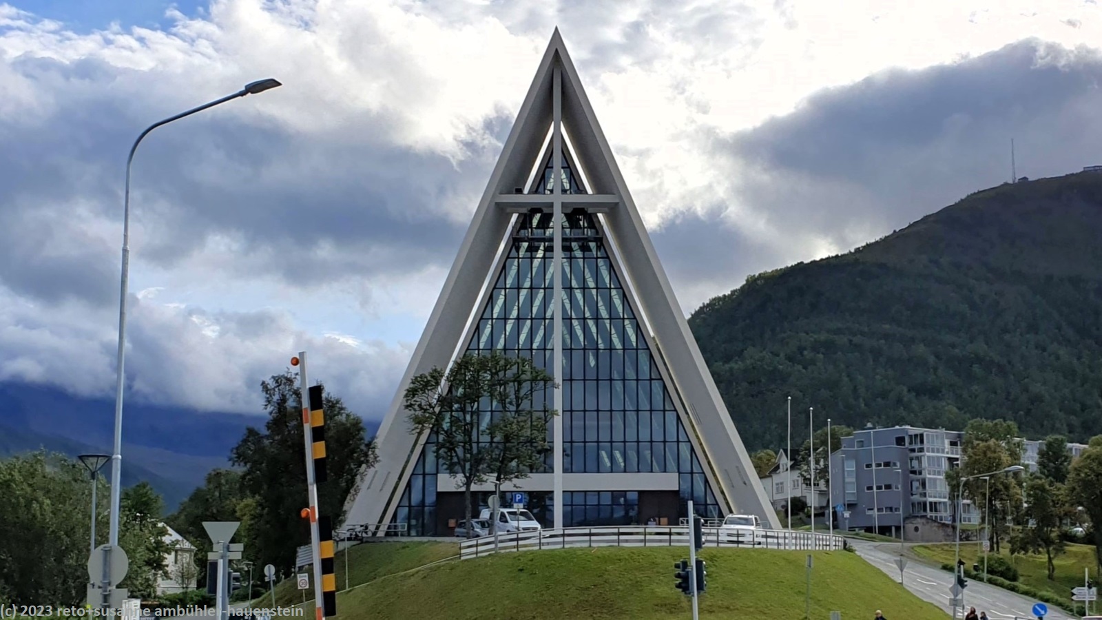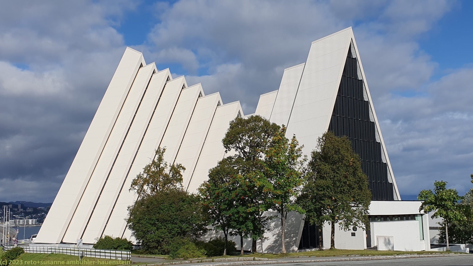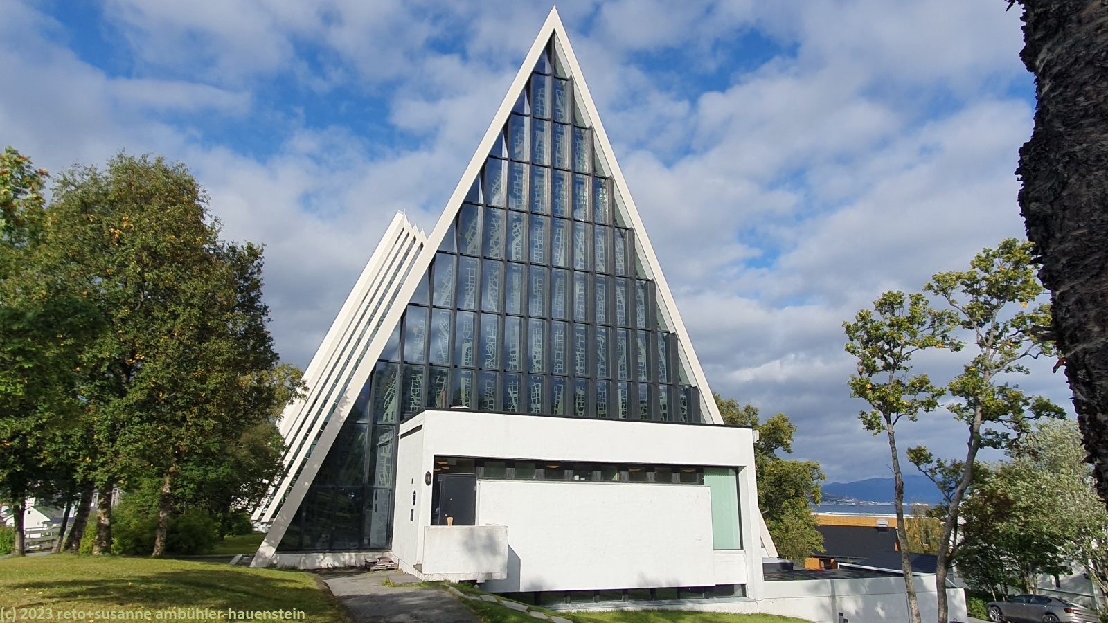 von dieser sind es nur wenige schritte bis zur tromsdalen kirke, auch als arctic cathedral bezeichnet. diese kirche fällt durch ihre ganz besondere architektur auf. wir haben das glück, dass sie für kurze zeit von der sonne beschienen wird, das gibt einige hübsche fotos. da gerade eine abdankung im gang ist, dürfen wir das gotteshaus allerdings nicht betreten.