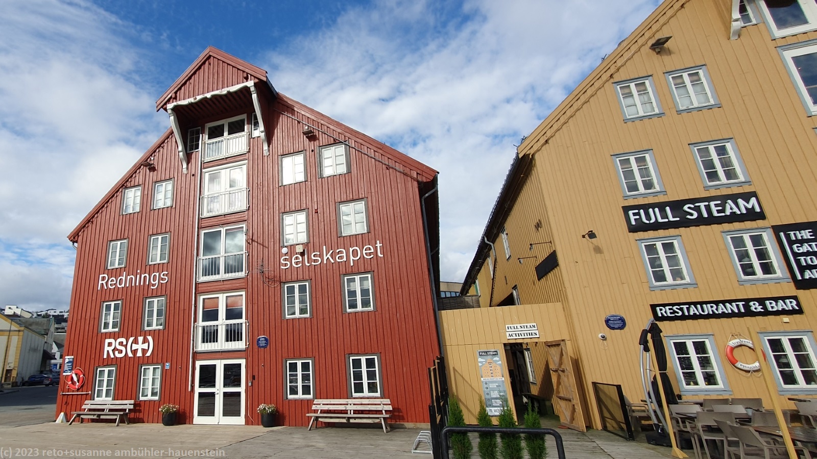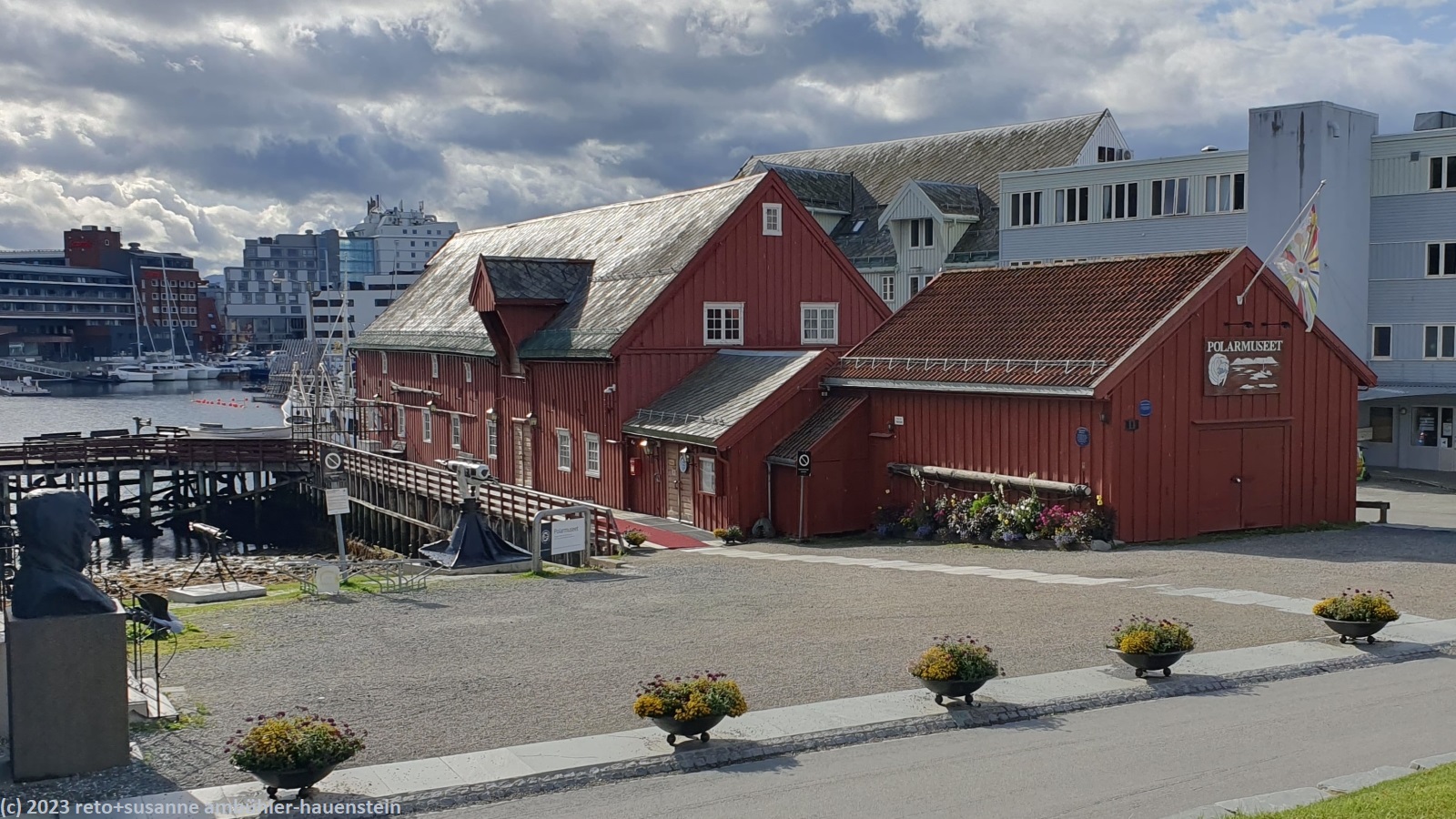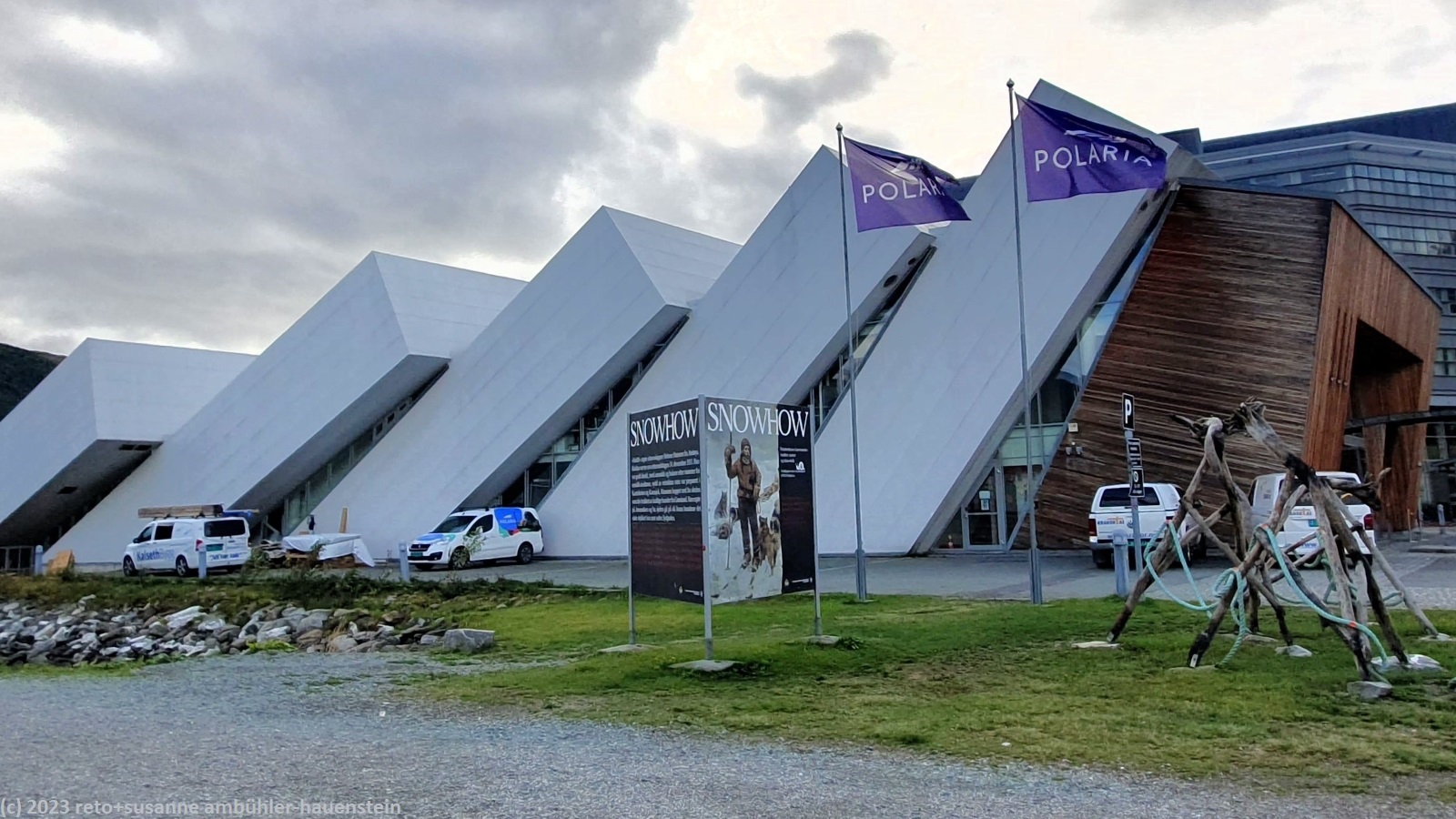 nun gehen wir über die mächtige tromsøbrua, welche uns auf die insel führt, auf der das stadtzentrum von tromsø liegt. wir besuchen skansen, das freilichtmuseum ist aber eher von bescheidenem format, auch wenn die häuser schön anzusehen sind. am polarmuseum vorbei gehen wir richtung fussgängerzone. die erste hälfte der stor gatan ist eine einzige baustelle. die läden sind zwar geöffnet, aber die strasse ist aufgerissen und mit lauten baumaschinen verstellt. die zweite hälfte der hauptstrasse ist frei von bauarbeiten. wir gehen bis zum polaria. dieses museum hat ebenfalls eine sehr auffällige architektur, aber da rund herum gebaut wird, kommt diese nicht wirklich zur geltung.