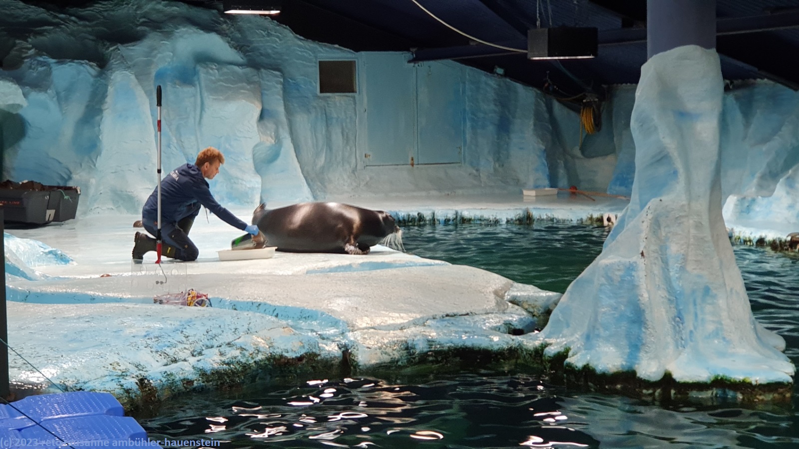 das museum hat nur bis 16 uhr geöffnet. als wir diskutieren, was wir machen wollen, meint die dame an der kasse, sie könne uns zu einem reduzierten preis den eintritt für die seal show und einen film unserer wahl anbieten. gerne nehmen wir das grosszügige angebot an. im relativ kleinen pool hat es ein grosses seehundpaar, jedes tier ist etwa 300 kg schwer, und ein kleines paar, jedes tier wiegt etwa 80 kg. das kleine pärchen hat im juli ein junges erhalten. dieses ist heute zum ersten mal während der show mit im pool. ziel sei es, dass es möglichst viel frist, was der kleine zumindest zu beginn auch gierig tut. die anderen vier seehunde zeigen diverse kunststücke, so bringen sie zum beispiel einen ball zurück.