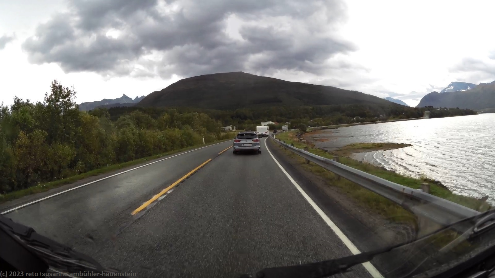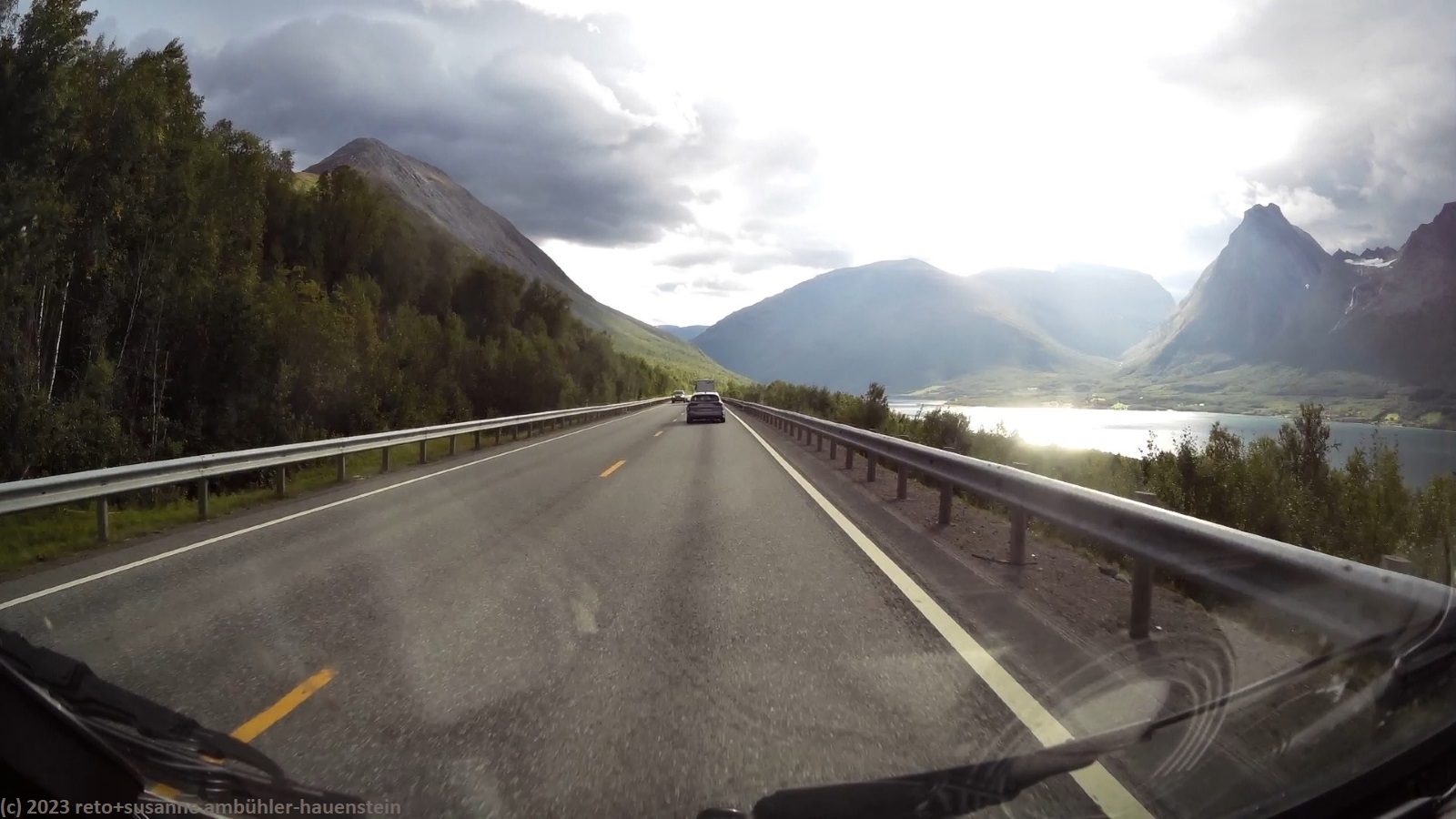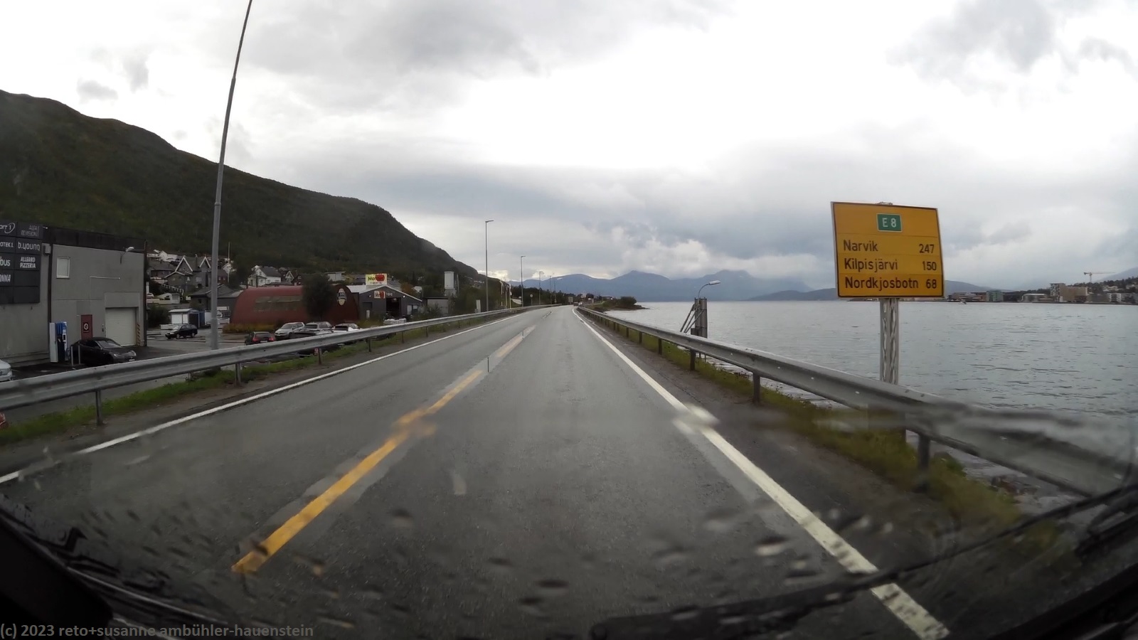 da es auch heute morgen regnet, müssen wir einmal mehr im jogi frühstücken. als wir um 10 uhr aufbrechen, ist es zwar trocken, aber noch ist der himmel sehr trüb. ausgangs tromsø kaufen wir einige lebensmittel und tanken unseren wagen auf, dann folgen wir der E8 entlang des balsfjorden. für einmal sind relativ viele autos unterwegs, was wohl daran liegt, dass heute samstag ist. aber selbst die womos sind mit der erlaubten höchstgeschwindigkeit unterwegs, so dass wir ganz gut vorankommen. während der fahrt scheint ab und zu die sonne, selten fallen regentropfen. am tagesziel finden wir den campingplatz erst im zweiten anlauf. dies liegt an den widersprüchlichen infos zwischen reiseführer und navi. der campingplatz ist zu unserer überraschung fast ausgebucht. wie sich herausstellt, findet dieses wochenende hier ein treffen des norwegischen camper clubs sowie ein konzert in der sporthalle statt. wir machen eine kurzwanderung bis zum nördlichen ende von skibotn, auf dem rückweg gibt es kaffee bzw. tee und ein stück kuchen in einem bistro. den abend verbringen wir im jogi. gegen 23 uhr schlüpfen wir unter die bettdecke.