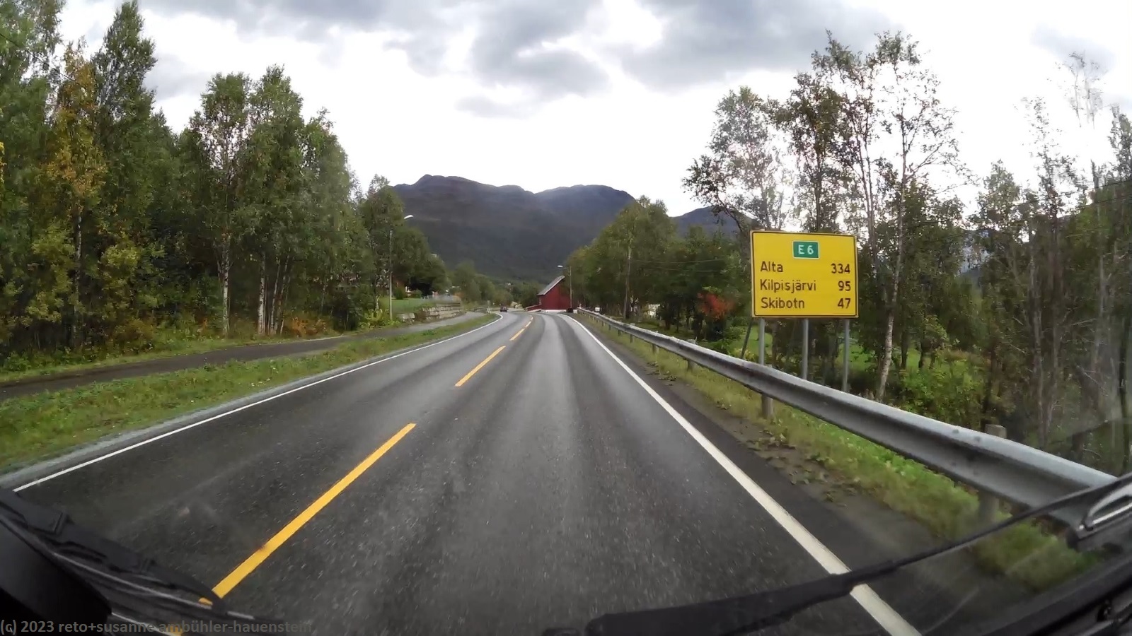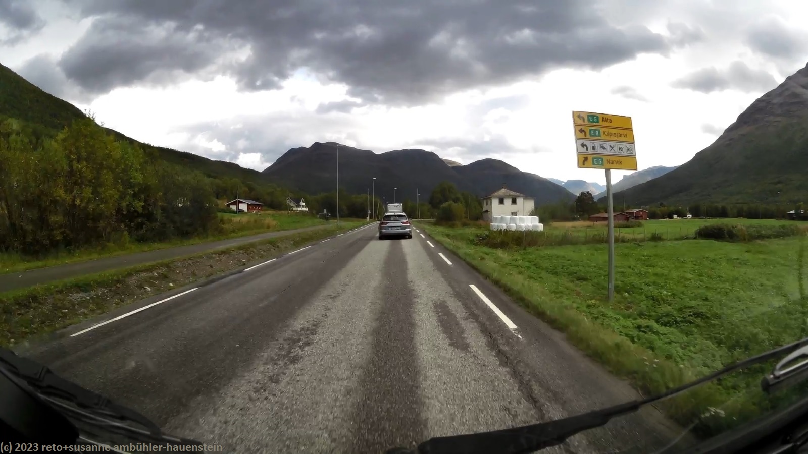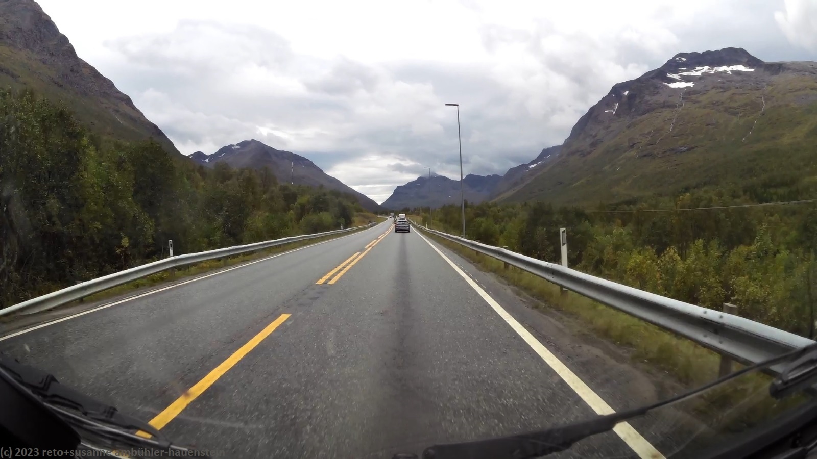 als wir um 8 uhr aufstehen, fällt entgegen der vorhersage leichter regen. es gibt daher ein weiteres frühstück im jogi. um 10 uhr sind wir startbereit. nun hat der regen aufgehört und man könnte sich einbilden, dass sich der himmel im osten etwas aufhellt. ausgangs tromsø kaufen wir noch einige lebensmittel und tanken unseren wagen auf. auf der E8 üben wir heute kollonnenfahren. allerdings ist selbst das womo vor uns mit der erlaubten geschwindigkeit unterwegs, so dass wir sehr gut vorankommen. manchmal gibt es kurze doppelspurige abschnitte, aber wir haben keinen anlass, diese zu nutzen. die fahrbahn ist in exzellentem zustand, da kommt man selbst mit grossen fahrzeugen problemlos voran. das wetter wird nun tatsächlich freundlicher. bei nordkjosbotn treffen die E6 und die E8 zusammen, dies hat aber wenig einfluss auf das verkehrsaufkommen. um mittag erreichen wir unser tagesziel skibotn. hier trennen sich die E6 und die E8 wieder. im ort gibt es drei campingplätze. den einen können wir ausschliessen, aber die anderen beiden sind irgendwie verwirrend, weil auf der karte des navi, die namen und adressen nicht mit den informationen des reiseführers übereinstimmen, bzw. vertauscht sind. dazu kommt ein wegweiser, den wir beide falsch interpretieren. so folgen wir der E8 richtung finnland, aber da kommt kein campingplatz. wir wenden und finden im zweiten anlauf den gesuchten platz, der eben doch an der E6 liegt.