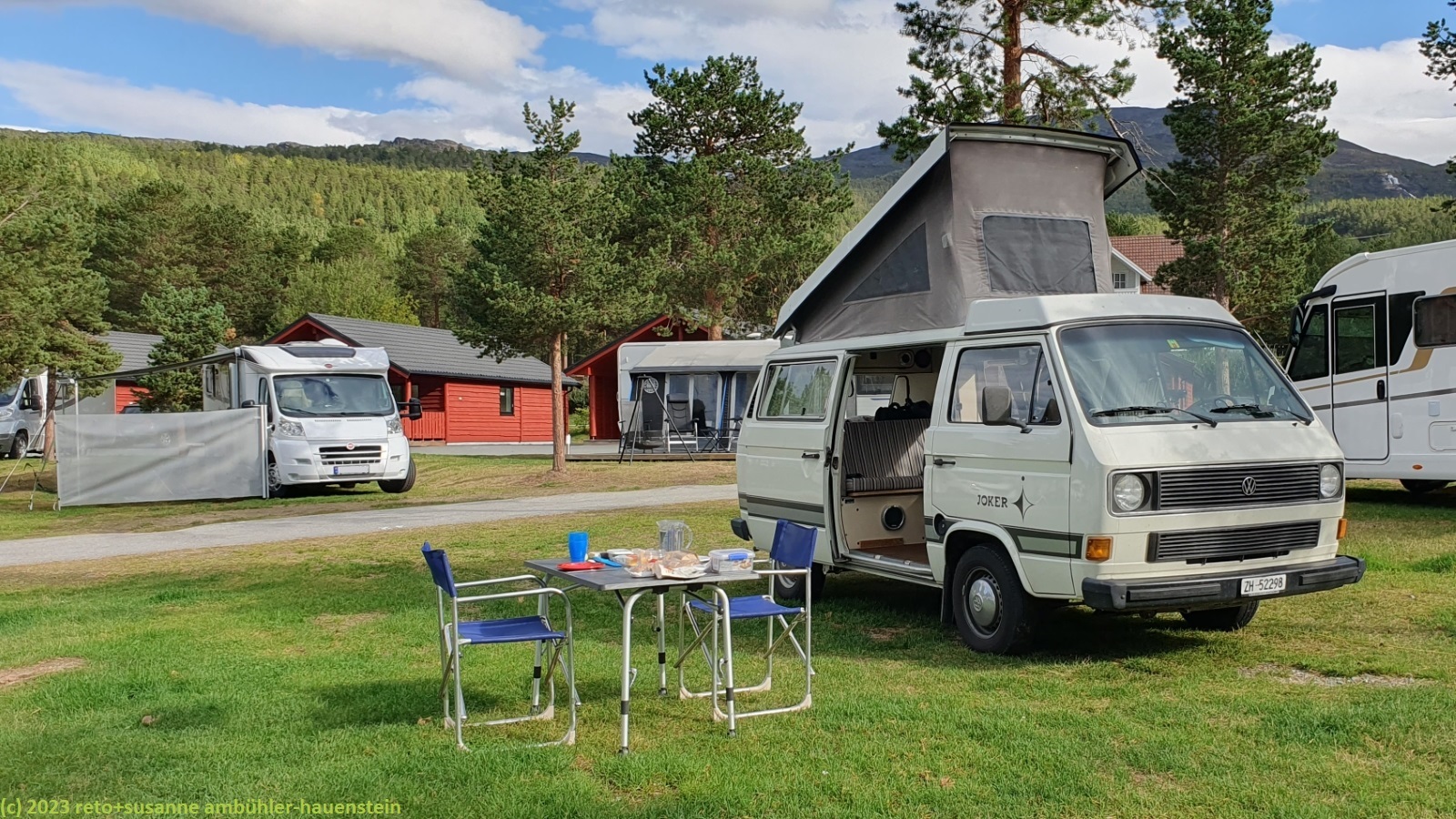 nach dem essen machen wir einen fussmarsch ins dorf. beim hafen am anderen ende der ortschaft soll es gemäss der karte auf dem navi ein cafe haben, aber mehr als ein fitnessstudio können wir nicht finden. auf der anderen strassenseite sehen wir ein hotel, dieses ist jedoch geschlossen. auf dem hinweg haben wir bei der kirche ein bistro gesehen, hier erhalten wir schliesslich doch noch kaffee, tee und ein stück kuchen. im restaurant steht eine musikanlage und auf einem bildschirm laufen videoclips von alan parson, bruce springsteen und anderen bands, die aus meiner musiksammlung stammen könnten - hier gefällt es mir. auf dem rückweg zum campingplatz finden wir schliesslich den grund, warum es hier nur so von norwegischen camper wimmelt: dieses wochenende findet ein treffen des norwegischen camper clubs statt. ausserdem gibt es heute abend in der sporthalle ein konzert. auf dem letzten kilometer beginnt es leicht zu regnen, aber nur für kurze zeit. im jogi führe ich die bücher nach, susanne beantwortet emails. gegen 18:30 uhr essen wir. die wolkendecke hat sich wieder gelichtet. sollte das wetter morgen freundlich sein, so bleiben wir eventuell einen tag länger und machen einen ausflug zum steindalsbreen. den abend verbringen wir im wagen. susanne liest, ich setze die sichtung der inzwischen über 1500 fotos fort. gegen 23 uhr gehen wir uns duschen und schlüpfen dann unter die bettdecke.