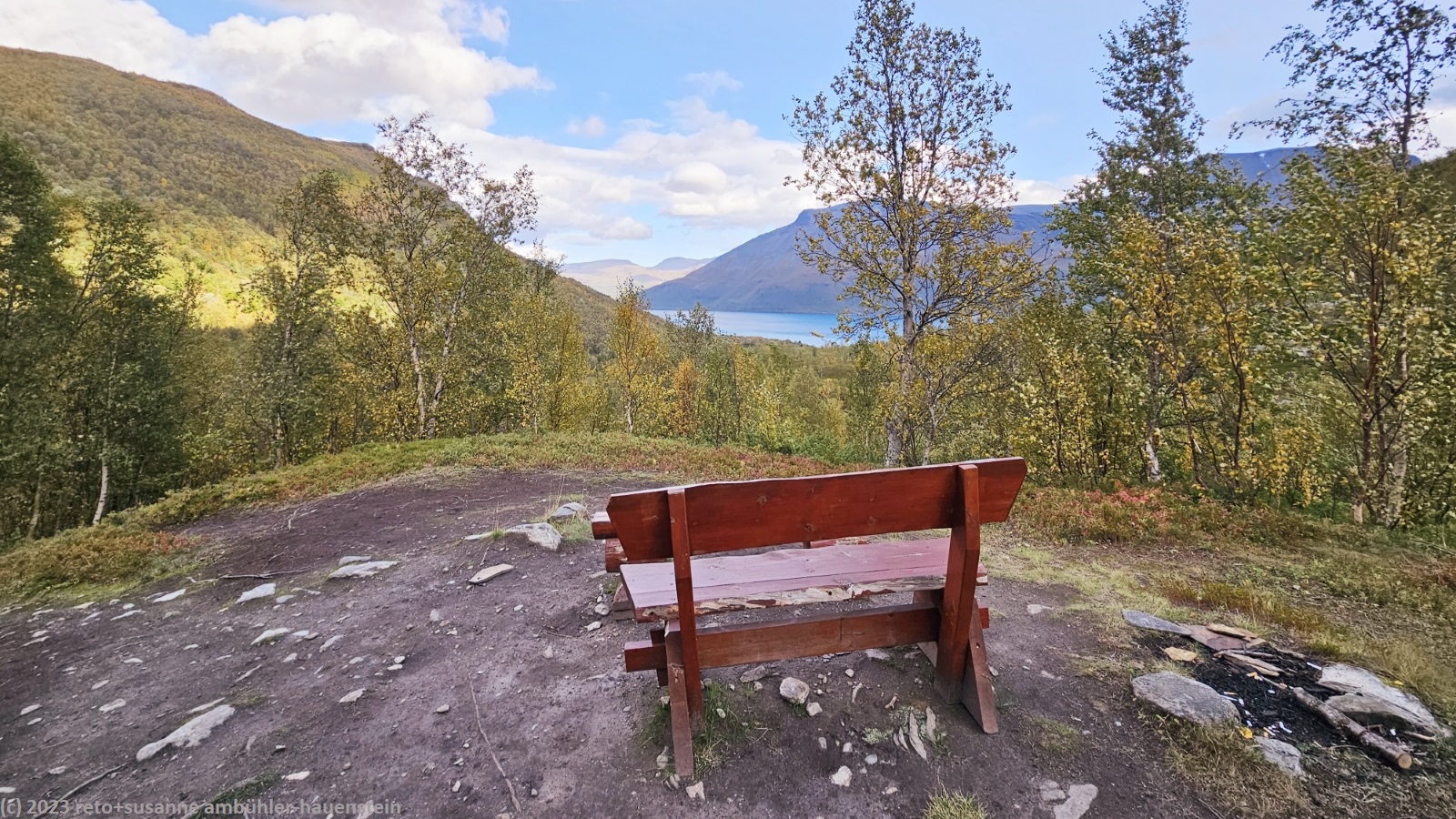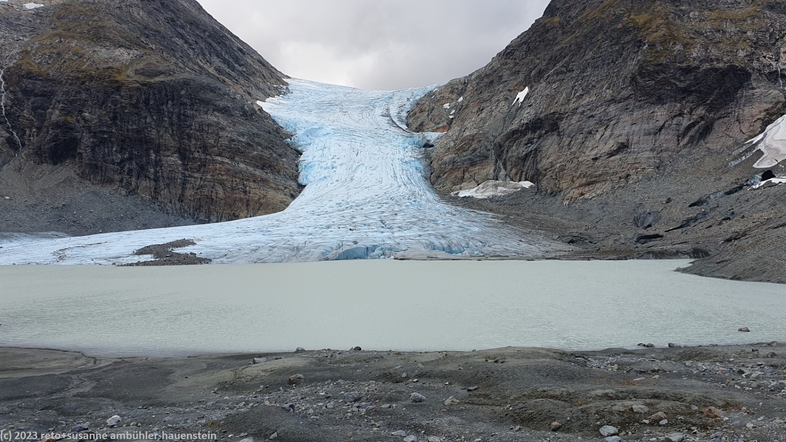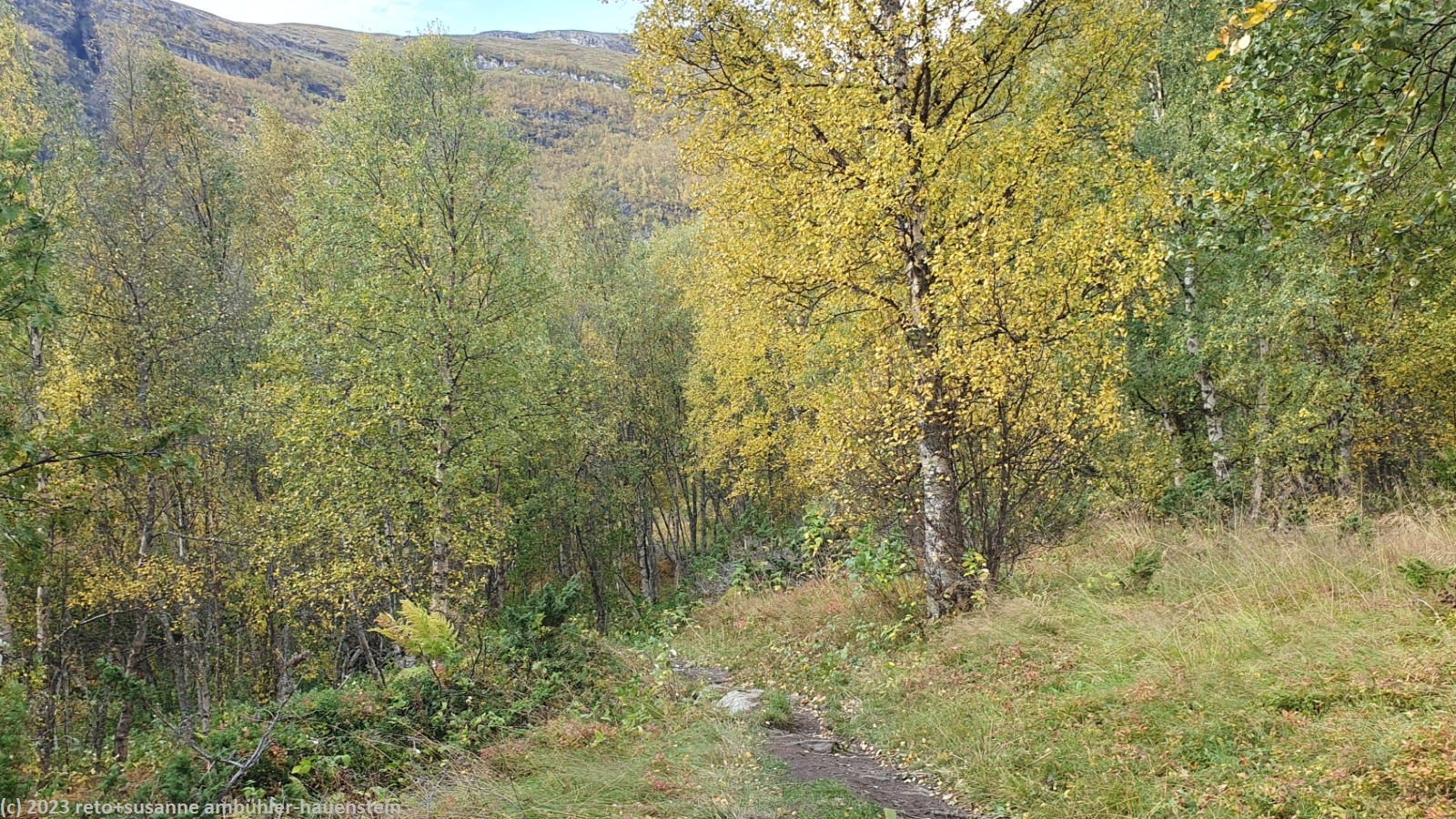 als uns unser handy um 7:30 uhr weckt, regnet es ziemlich heftig. wir haben uns für heute zwei optionen offen gehalten: entweder wir fahren weiter nach levi, oder wir bleiben noch einen tag länger hier und machen eine wanderung zum steindalsbreen. wir vertagen den entscheid bis nach dem frühstück. während wir im jogi essen, wird der himmel etwas freundlicher, man sieht sogar gelegentlich winzig kleine blaue flecken. wir entscheiden uns daher für die wanderung. die reception öffnet erst um 11 uhr, wir nehmen daher auch den tisch und die kabelrolle mit und registrieren uns am abend neu. der ausgangspunkt unserer wanderung liegt auf der anderen seite des storfjorden. luftlinie ist der parkplatz nur 10 km entfernt. wir müssen aber um den fjord herum fahren. dies bedeutet, erst auf der E6 27 km zurück in südwestlicher richtung - den weg, denn wir gestern gekommen sind, dann 17 km auf der strasse 868 in nordöstlicher richtung. kurz vor 11 uhr sind wir beim parkplatz. dieser ist - wie fast alle parkplätze in norwegen, egal wie abgelegen - kostenpflichtig. zum glück kann man überall mit der easypark app bezahlen. diese habe ich schon in kiel installiert und damit konnten wir auf dieser reise jeden gebührenpflichtigen parkplatz bezahlen, egal ob in deutschland, schweden oder norwegen. das ist schon fast genial. wir ziehen unsere wanderschuhe an und machen uns auf den weg. der himmel ist bewölkt, die wolken ziehen rasend schnell. entsprechend geht ein kräftiger wind. wenn ein bisschen sonne durch eines der seltenen löcher in der wolkendecke durchdringt, so ist dieses so schnell vorüber, dass wir kaum ein foto machen können. der weg steigt steil an und ist sehr steinig und holperig. er führt durch einen schönen birkenwald. die blätter der laubbäume sind nun vorwiegend gelb, es ist definitiv herbst geworden. nach knapp 2 km gelangen wir an den ziemlich wilden geailu. uns scheint, dieser führt erstaunlich viel wasser für die jahreszeit. zu unserer rechten hat es einen eindrücklichen wasserfall. nach 55 minuten erreichen wir die steindalshytta. diese ist abgeschlossen, zum übernachten müsste man sich vorher anmelden. über eine kleine brücke setzen wir unsere wanderung fort. bald kommen wir aus dem wald heraus, nun geht es über den breiten talboden. das tal hat die typische U-form, wie von gletscher geformte täler eben sind. vor uns sehen wir die mächtige schlussmoräne des steindalsbreen. der gletscher selbst ist eher klein. schilder markieren, wie weit das eis in früheren jahren gereicht hat. der aufstieg über die endmoräne ist sehr steil. vom gletscher weht ein eisiger wind. wir wandern bis zum see am ende des eises.