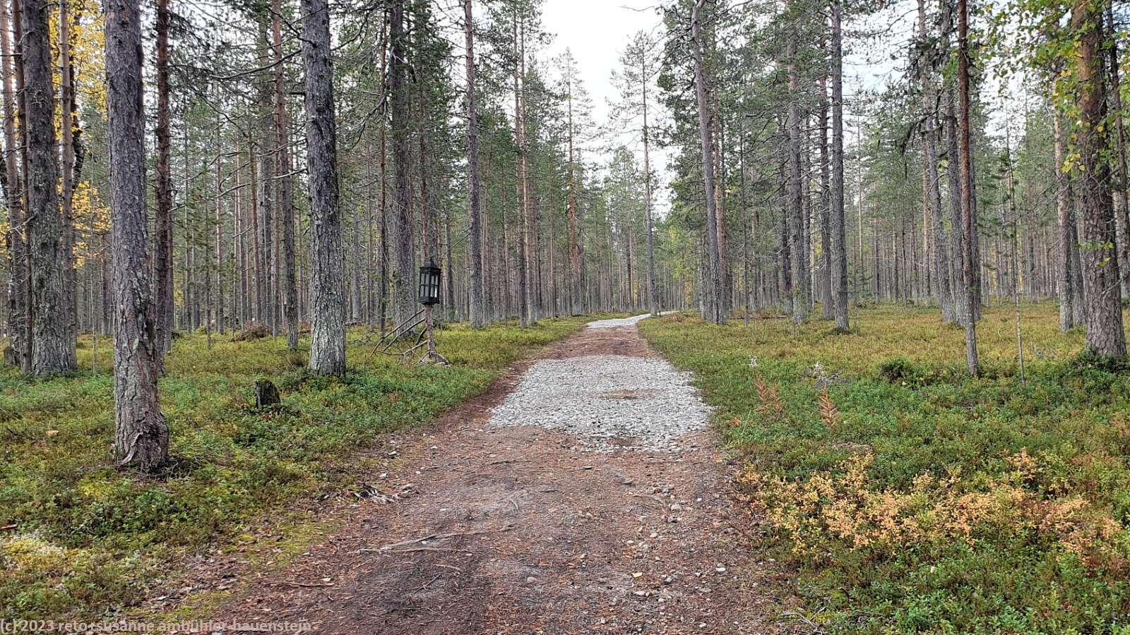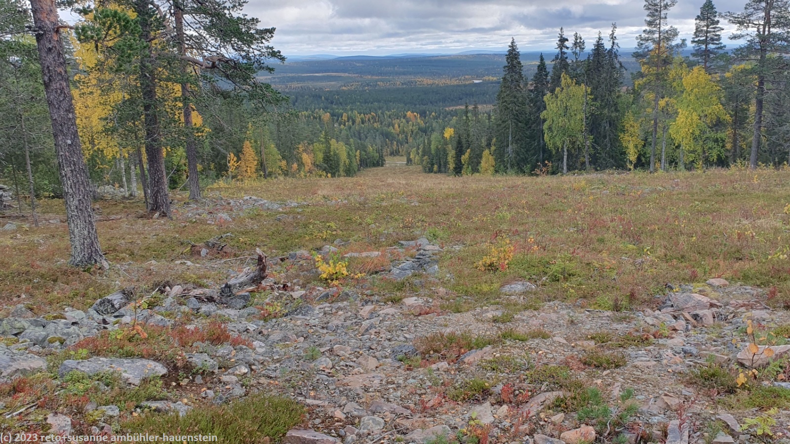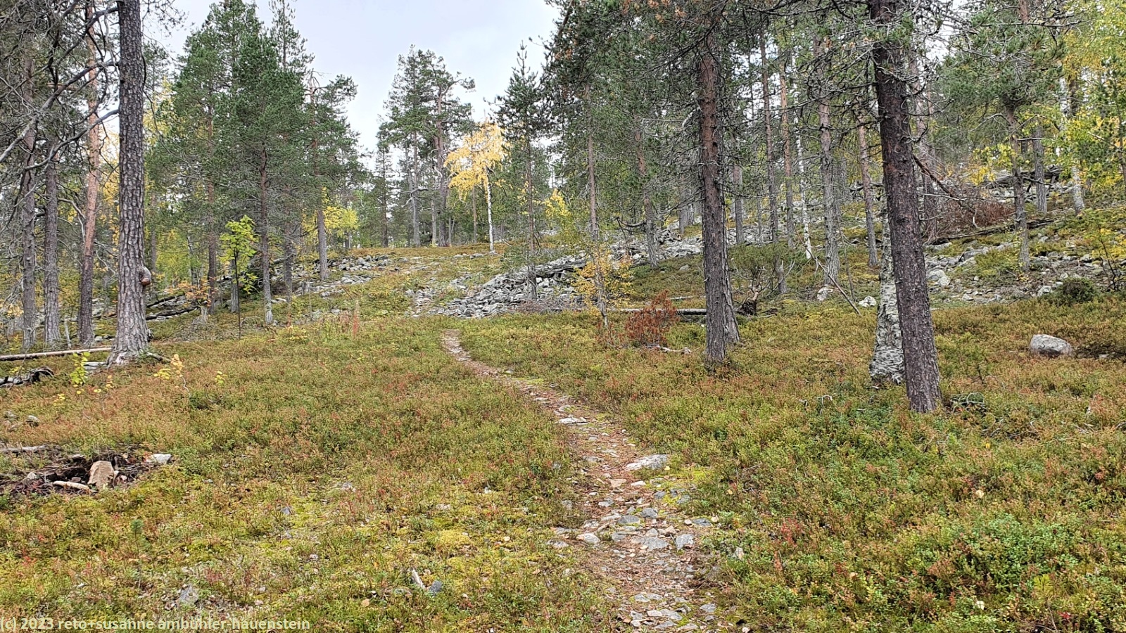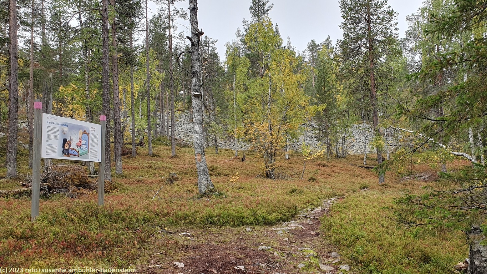 heute hätte gemäss wettervorhersage eigentlich ein sonniger tag sein sollen, aber als wir um 8:45 uhr aufstehen, regnet es. doch während wir im jogi frühstücken, zeichnet sich bereits eine wetterbesserung ab. um 10:20 uhr brechen wir zu unserer wanderung auf. quer durchs dorf geht es richtung golfplatz. ein schöner weg führt durch einen herrlichen herbstwald. wir kommen an den talstationen der skilifte vorbei, mit welchen wir im märz 2022 gefahren sind, siehe tagebücher vom 02-mär-2022 und 03-mär-2022. ab dem golfplatz ist der wanderweg gesperrt, zum glück gibt es parallel dazu einen biketrail/wanderweg. dieser steigt nun etwas an. kurz vor der strasse, die um den levi herumführt, trennen sich biketrail und radweg wieder. der pfad ist nun sehr steinig und holperig. um 12:20 uhr erreichen wir sammun tupa, eine samensiedlung mit einem cafe.