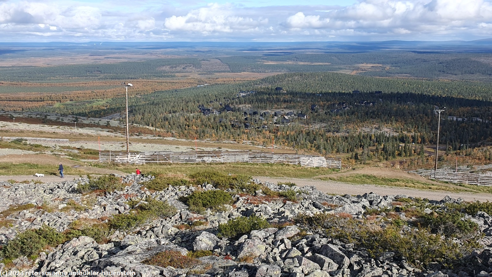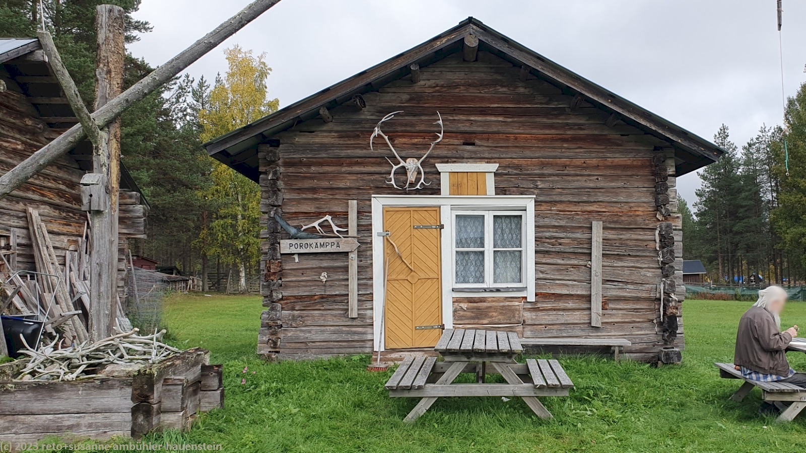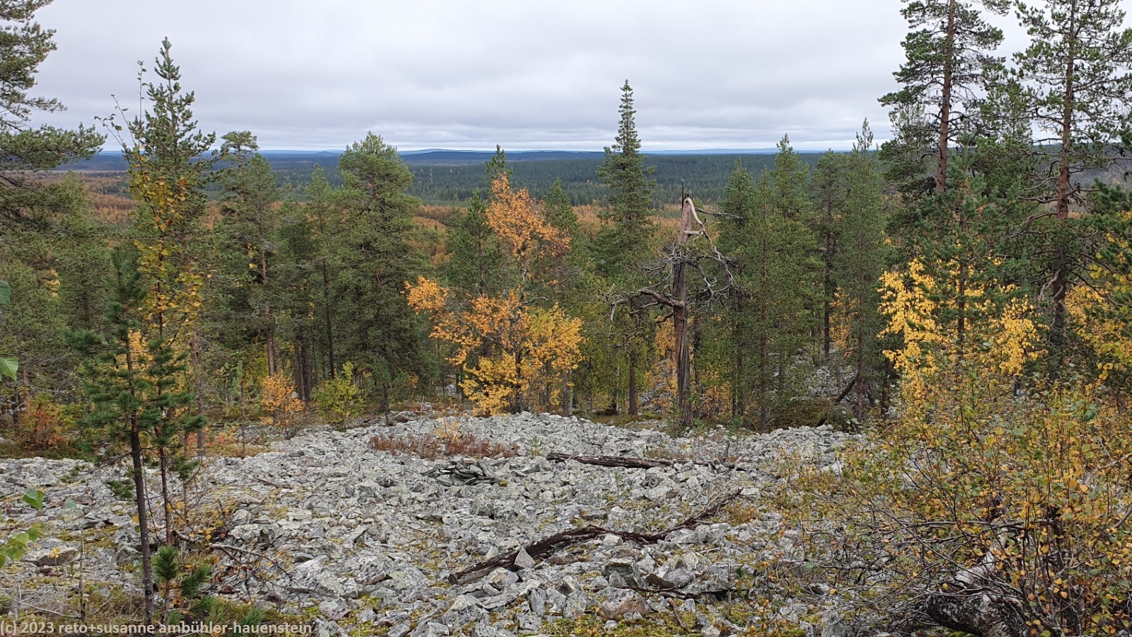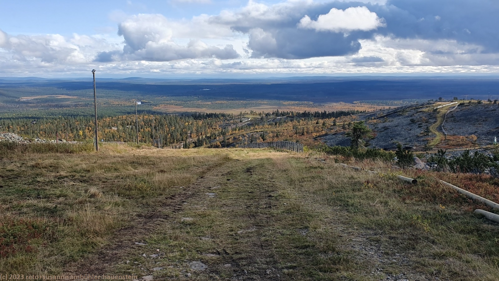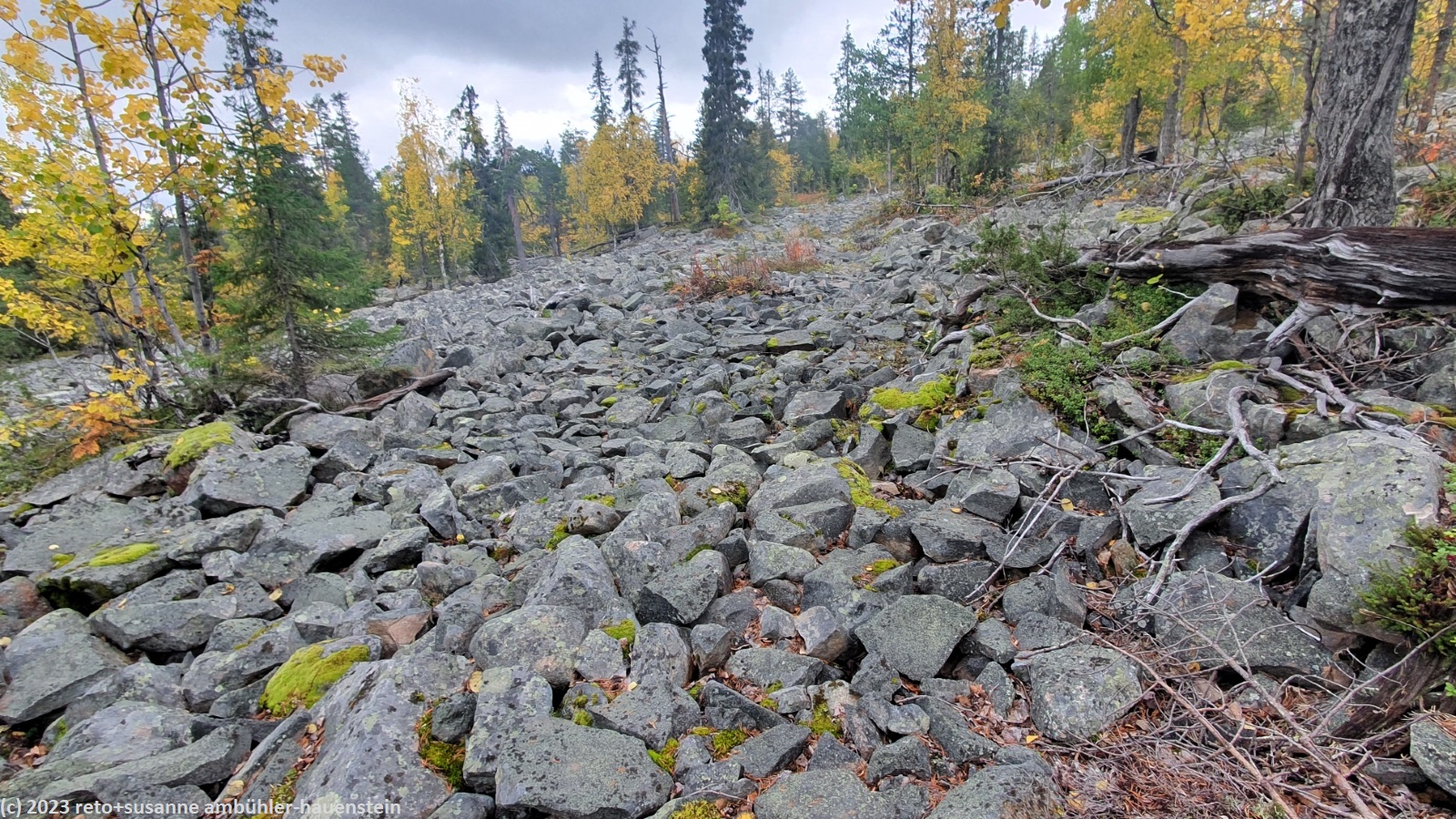 heute hätte gemäss wettervorhersage eigentlich ein sonniger tag sein sollen, aber als wir um 8:45 uhr aufstehen, regnet es. doch während wir im jogi frühstücken, zeichnet sich bereits eine wetterbesserung ab. um 10:20 uhr brechen wir zu unserer wanderung auf. quer durchs dorf geht es richtung golfplatz. ein schöner weg führt durch einen herrlichen herbstwald. wir kommen an den talstationen der skilifte vorbei, mit welchen wir im märz 2022 gefahren sind, siehe tagebücher vom 02-mär-2022 und 03-mär-2022. ab dem golfplatz ist der wanderweg gesperrt, zum glück gibt es parallel dazu einen biketrail/wanderweg. dieser steigt nun etwas an. kurz vor der strasse, die um den levi herumführt, trennen sich biketrail und radweg wieder. der pfad ist nun sehr steinig und holperig. um 12:20 uhr erreichen wir sammun tupa, eine samensiedlung mit einem cafe.