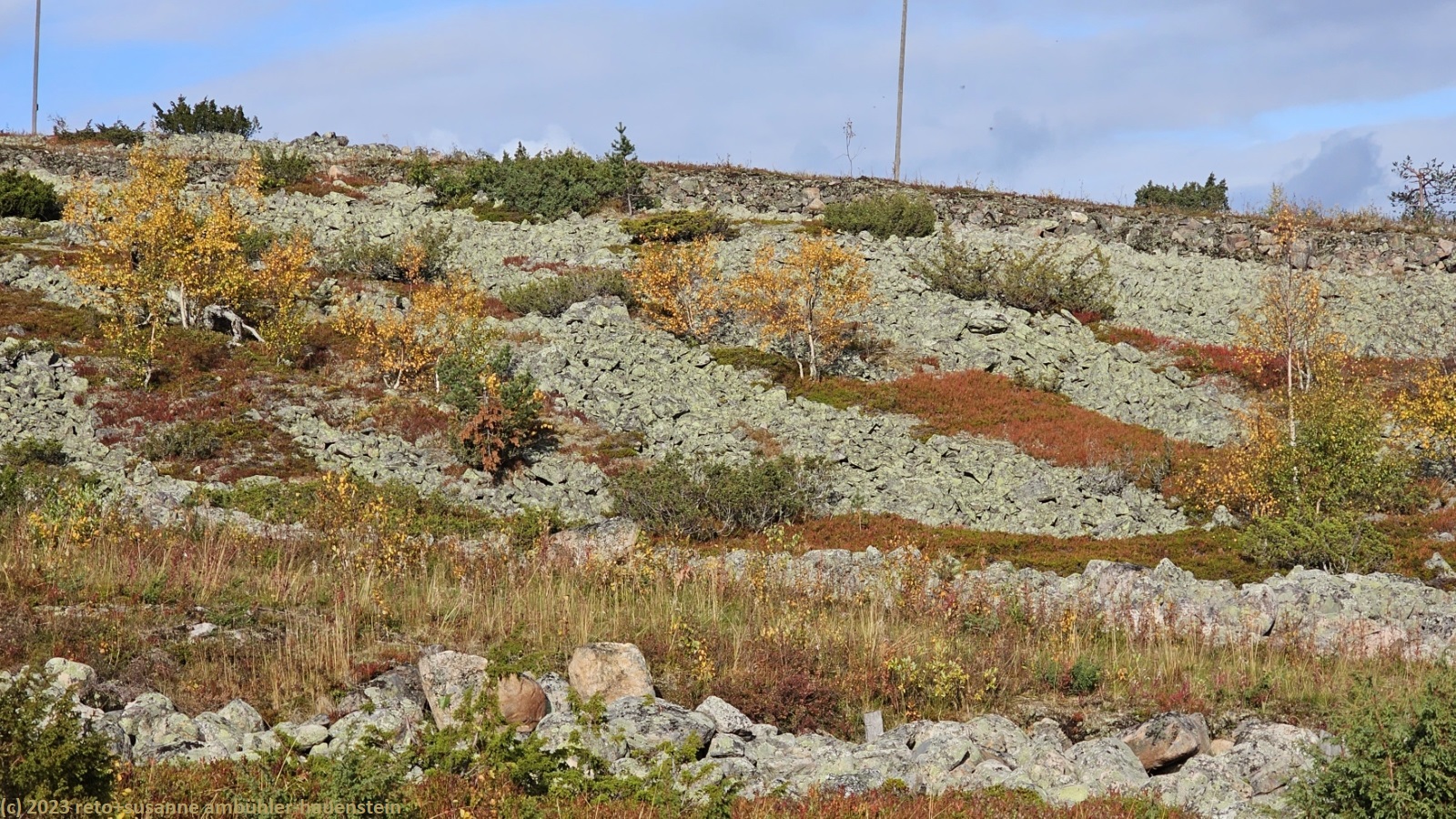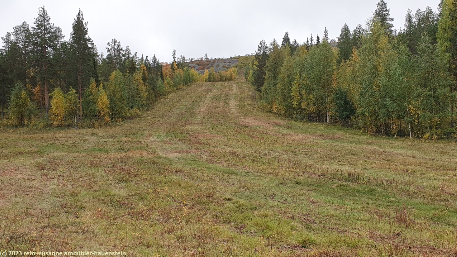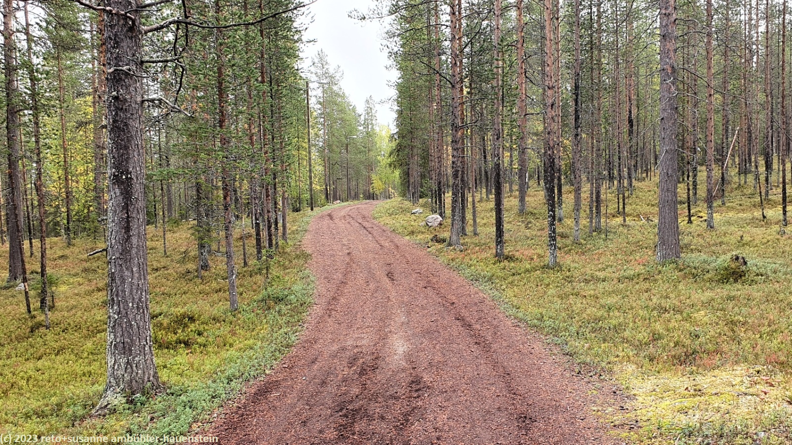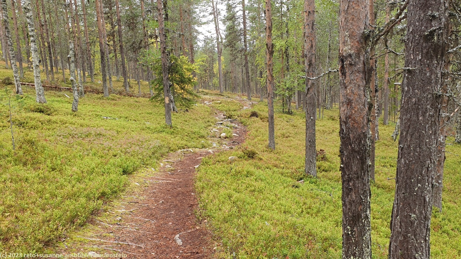 heute hätte gemäss wettervorhersage eigentlich ein sonniger tag sein sollen, aber als wir um 8:45 uhr aufstehen, regnet es. doch während wir im jogi frühstücken, zeichnet sich bereits eine wetterbesserung ab. um 10:20 uhr brechen wir zu unserer wanderung auf. quer durchs dorf geht es richtung golfplatz. ein schöner weg führt durch einen herrlichen herbstwald. wir kommen an den talstationen der skilifte vorbei, mit welchen wir im märz 2022 gefahren sind, siehe tagebücher vom 02-mär-2022 und 03-mär-2022. ab dem golfplatz ist der wanderweg gesperrt, zum glück gibt es parallel dazu einen biketrail/wanderweg. dieser steigt nun etwas an. kurz vor der strasse, die um den levi herumführt, trennen sich biketrail und radweg wieder. der pfad ist nun sehr steinig und holperig. um 12:20 uhr erreichen wir sammun tupa, eine samensiedlung mit einem cafe.