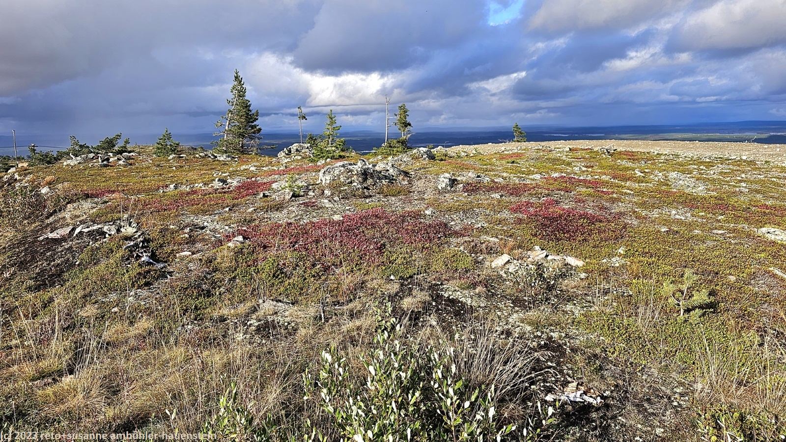 ein junges pärchen brät gerade würste am feuer. wir setzen uns auf eine der freien bänke und verzehren unsere brote. wieder zeigt sich gelegentlich die sonne. nach dem mittagessen geht es erst auf einer skipiste ziemlich steil aufwärts, dann führt der wanderweg in einem weiten bogen zum gipfel. wir umrunden diesen auf dem holzsteg. richtung süden haben wir eine schöne fernsicht, im westen verbreiten dunkelgraue wolken weltuntergang-stimmung und aus norden sind regenschauer im anzug. wir schaffen es gerade noch bis zum restaurant tuikku, bevor uns die ersten regenzellen erreichen.
