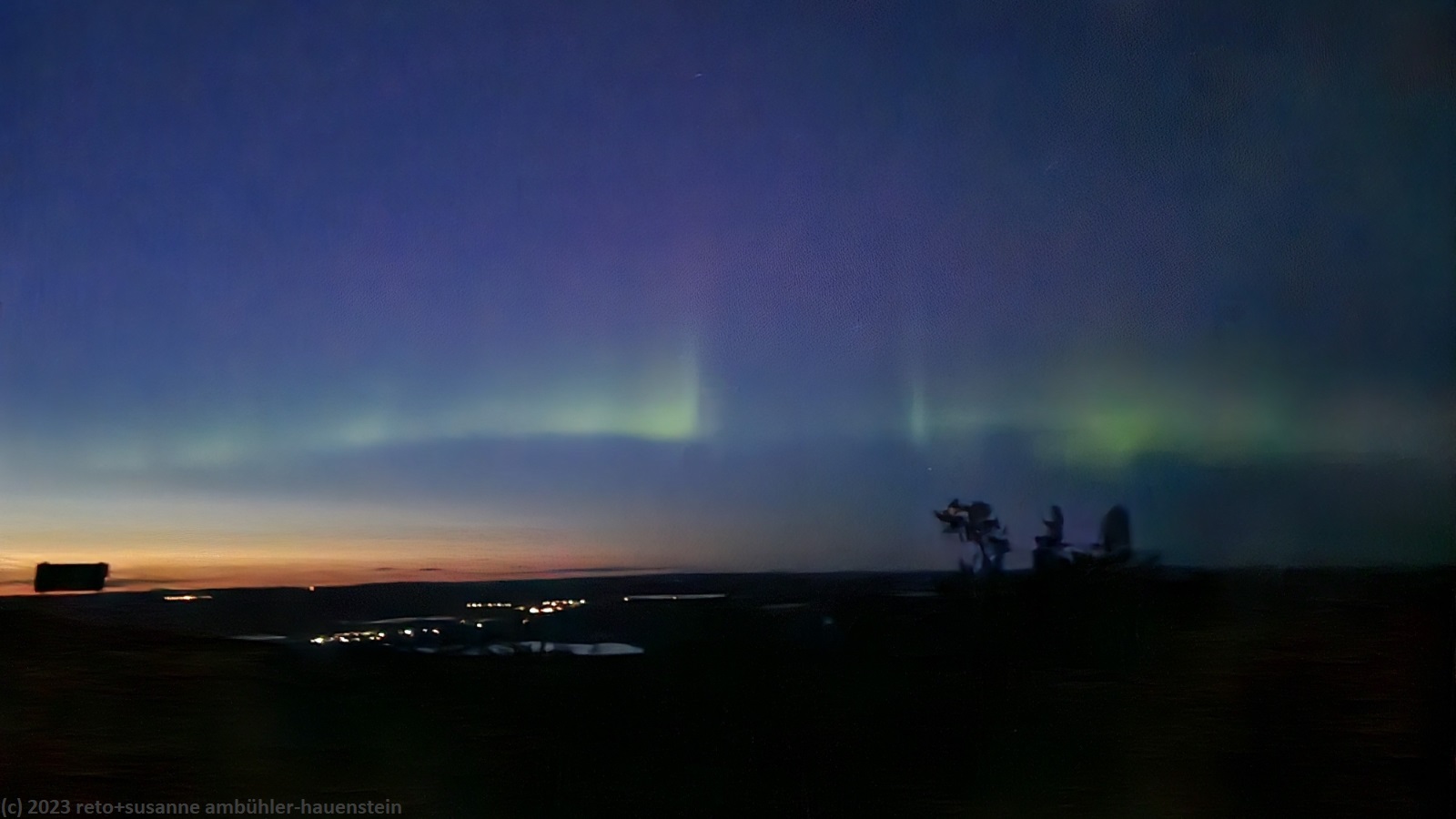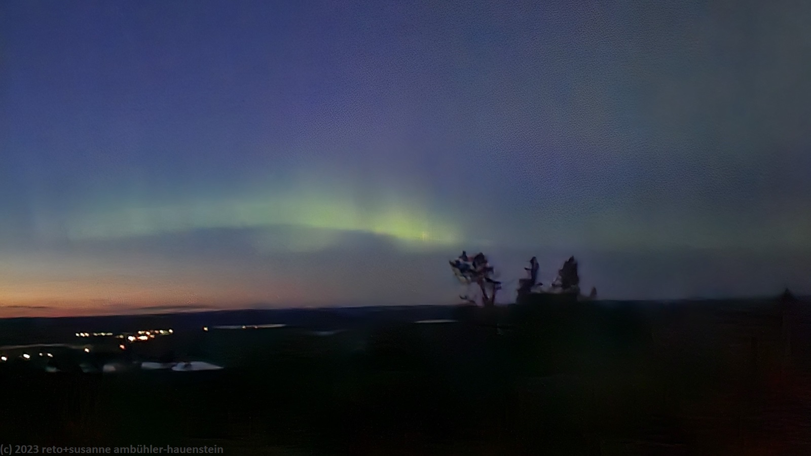 wir trinken einen tee und essen etwas süsses auf der gedeckten terrasse. da es sich abzeichnet, dass sich der regen einlässt, ziehen wir die regenjacken an und brechen um 16:15 uhr wieder auf. während dem abstieg nach levi regnet es mehr oder weniger ununterbrochen. im dorf kaufen wir noch einige lebensmittel ein, um 17 uhr sind wir wieder auf dem campingplatz. wir geniessen eine sitzung in der sauna und eine erfrischende dusche. als wir wieder beim jogi sind, hat der regen aufgehört und die sonne zeigt sich noch für ein paar minuten, bevor sie hinter einer wolkenbank verschwindet. nun ist es wirklich kühl geworden. bald sinkt die temperatur in den einstelligen bereich, in der nacht soll es 1°C kalt werden. nach dem essen fahren wir über die tunturitie wieder bis zum parkplatz beim restaurant tuikku hoch, in der hoffnung, polarlichter beobachten zu können. als wir kurz nach 20:45 uhr ankommen, ist es noch etwas zu hell, aber eine gute halbe stunde später wird es langsam dunkel. die bedingungen wären eigentlich perfekt - der himmel ist inzwischen weitgehend wolkenlos - aber polarlichter zeigen sich noch keine. ich schreibe im jogi tagebuch, susanne hält derweil ausschau nach polarlichter. nach 22 uhr fängt das naturschauspiel an. erst etwas zögerlich, dann immer intensiver beginnt der himmel zu leuchten. wir starren in den sternenübersäten nachthimmel, bis wir so durchfroren sind, dass wir uns im jogi mit einem heissen tee aufwärmen müssen. danach geniessen wir nochmals das fantastische schauspiel.