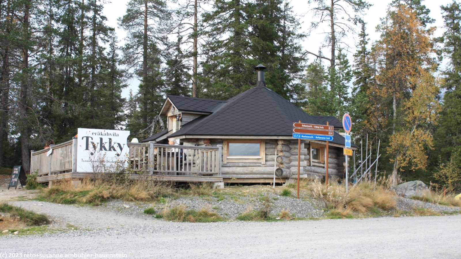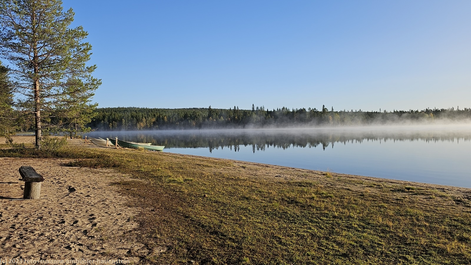 als wir um 8 uhr aufstehen, liegt die temperatur bei 1°C. über dem see liegt morgendunst, der himmel ist wolkenlos, ein fantastisch schöner morgen. nach dem frühstück fahren wir zum gut 25 km entfernten riisitunturin nationalpark. wir wandern den rundweg riisin rietas, ergänzt mit einem abstecher zum hevonharja. auf letzterem picknicken wir bei sonnigem wetter. sowohl vom riisitunturi als auch vom pikku riisitunturi haben wir jeweils eine wunderbare aussicht. kurz vor 16 uhr sind wir wieder beim ausgangspunkt und können uns gerade noch im cafe tykky mit getränk und gebäck erfrischen. zurück auf dem campingplatz geniessen wir erst das nachtessen und dann zwei erholsame sitzungen in der grosszügigen sauna am see. gegen 23 uhr sind wir im bett.