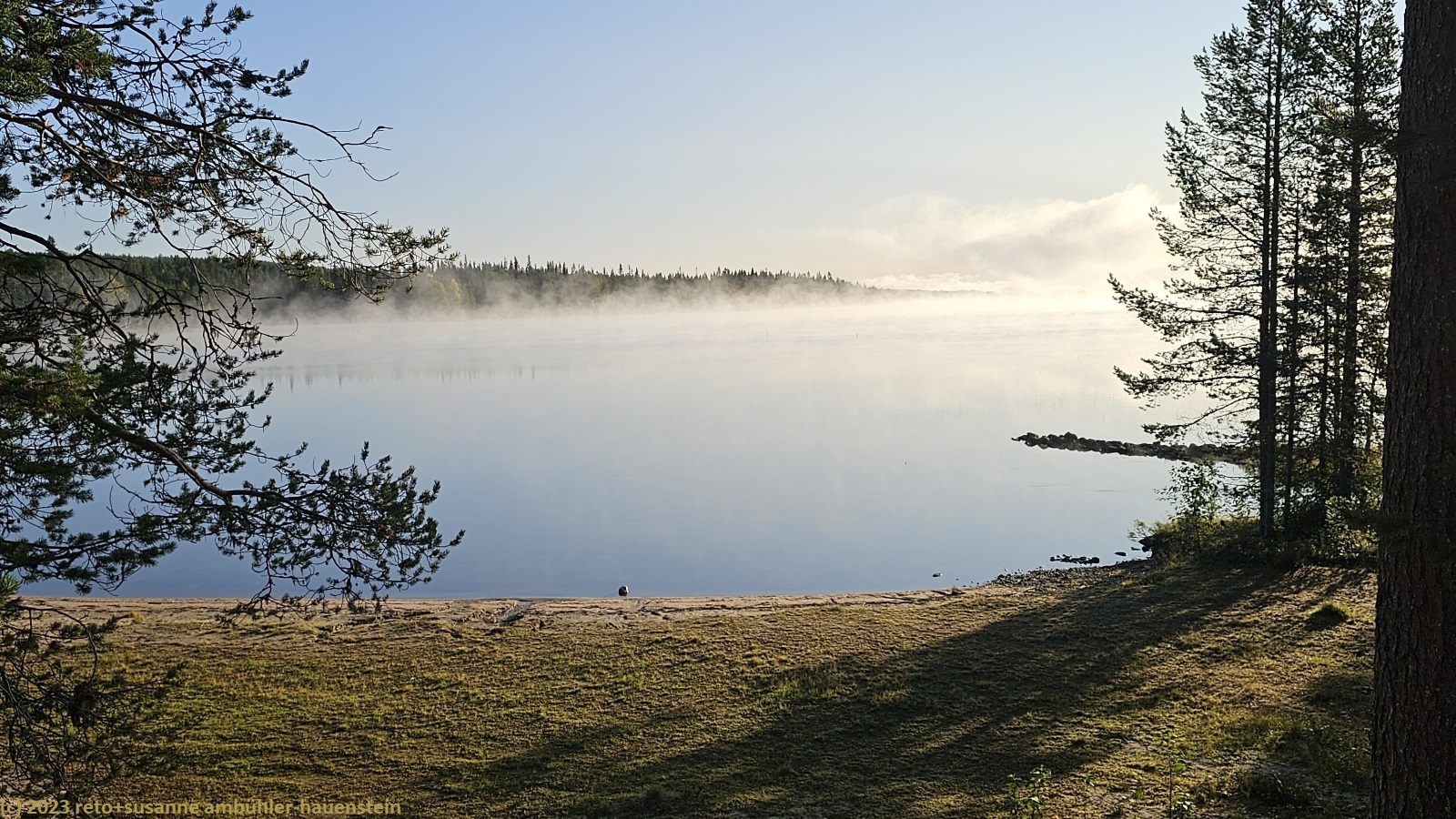 die nacht war sehr frisch. als wir um 8 uhr aufstehen, ist der himmel beinahe wolkenlos. über dem see liegt morgendunst, das sieht fantastisch aus. das schauspiel dauert allerdings nur ganz kurz, dann hat sich der wasserdampf aufgelöst.