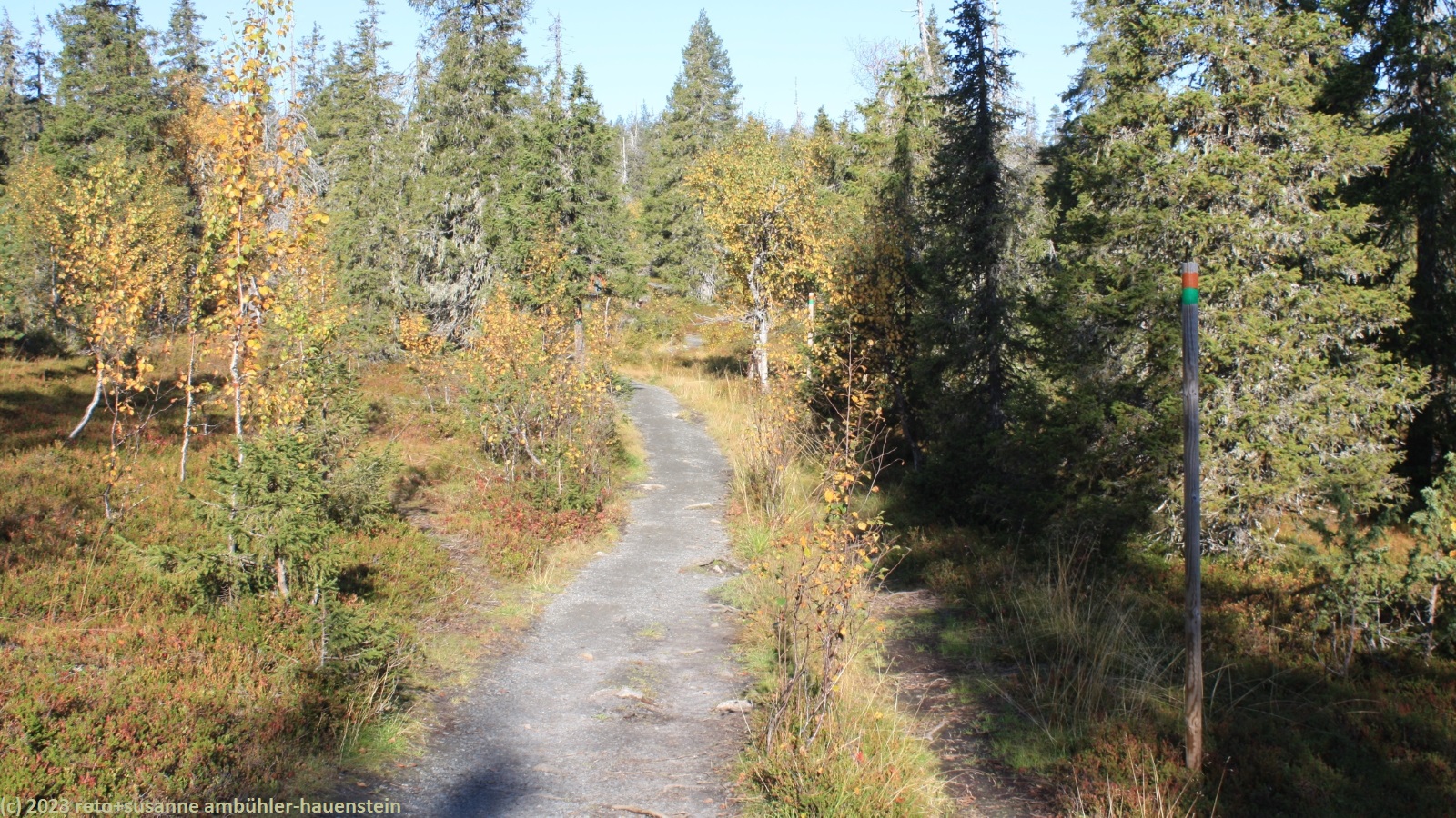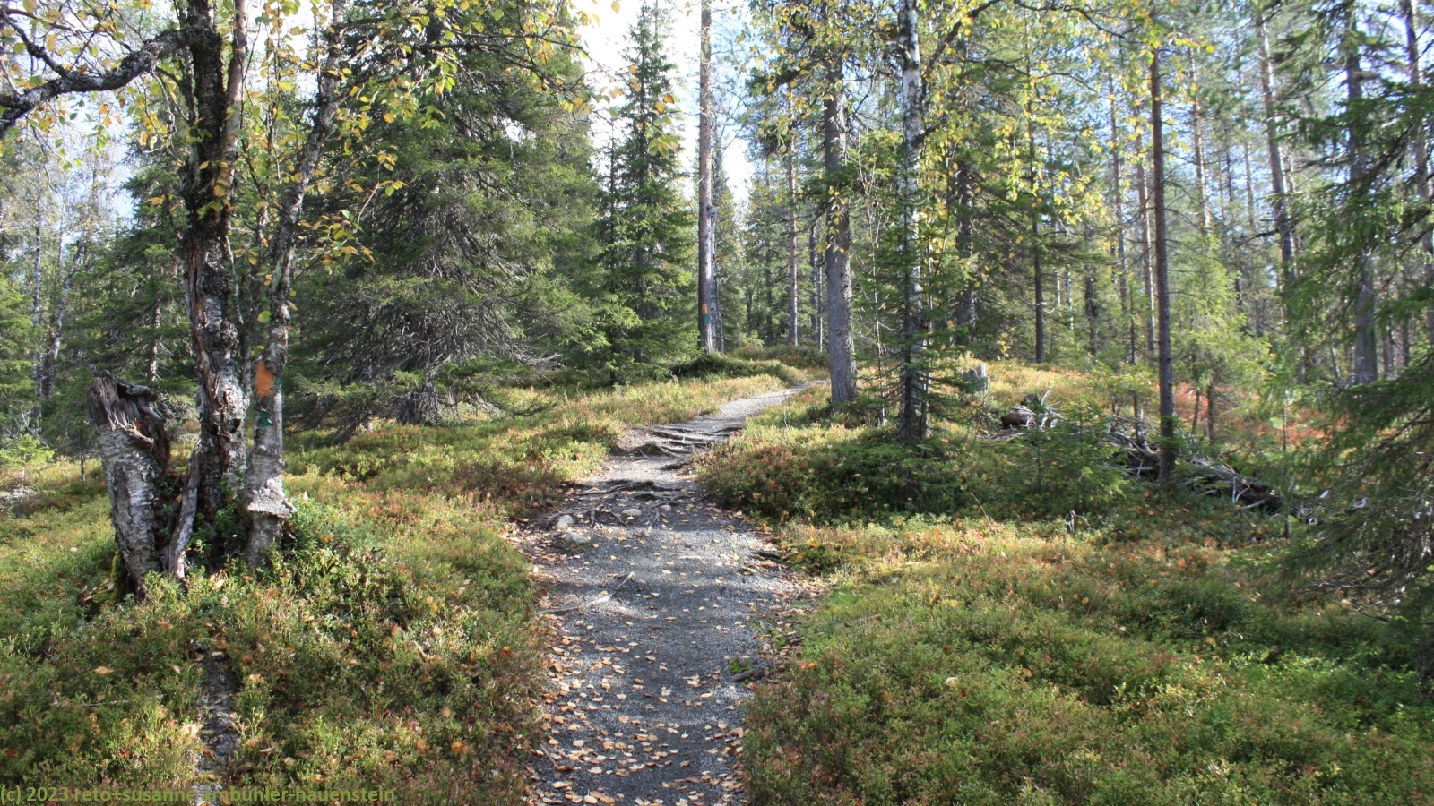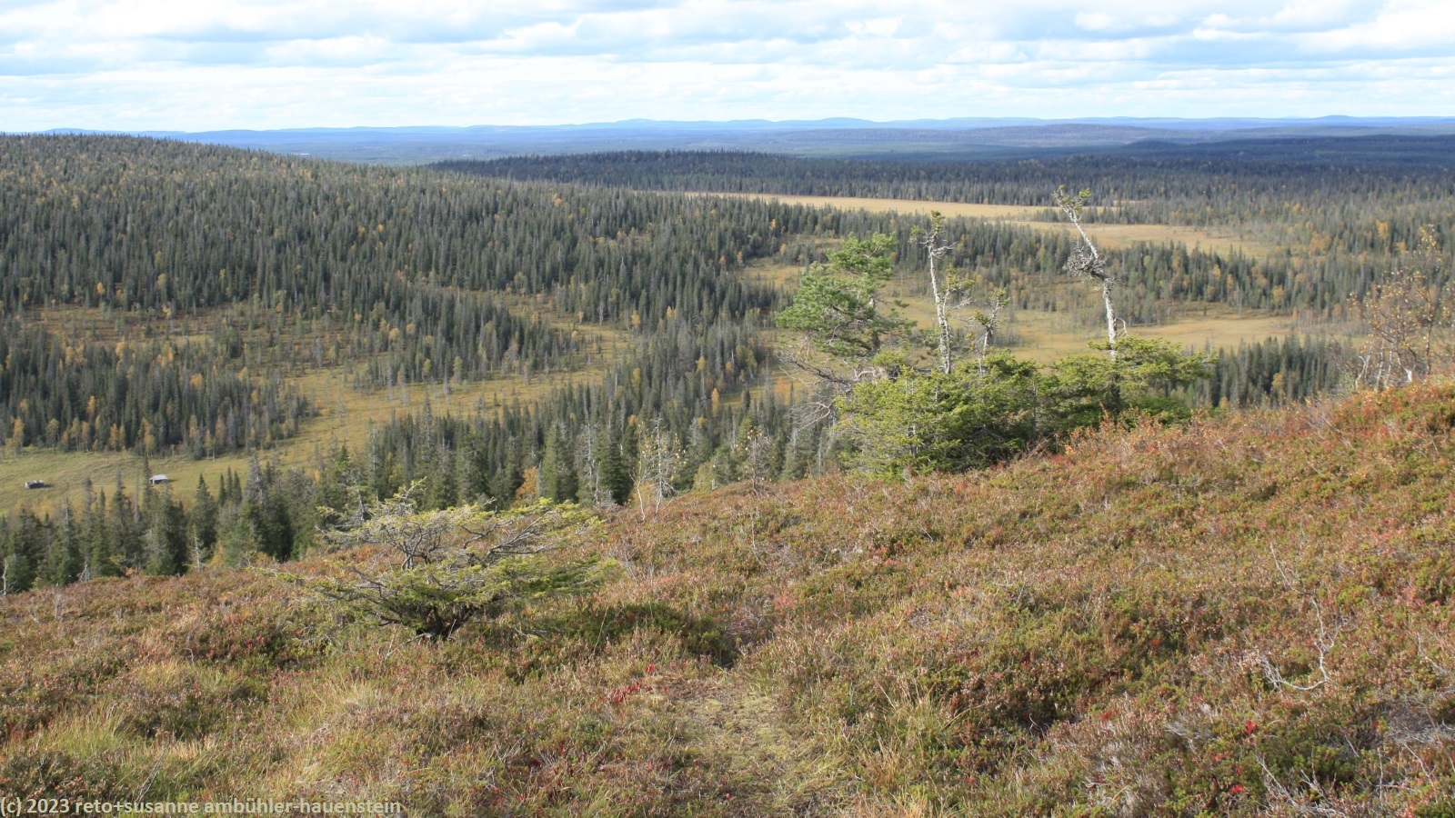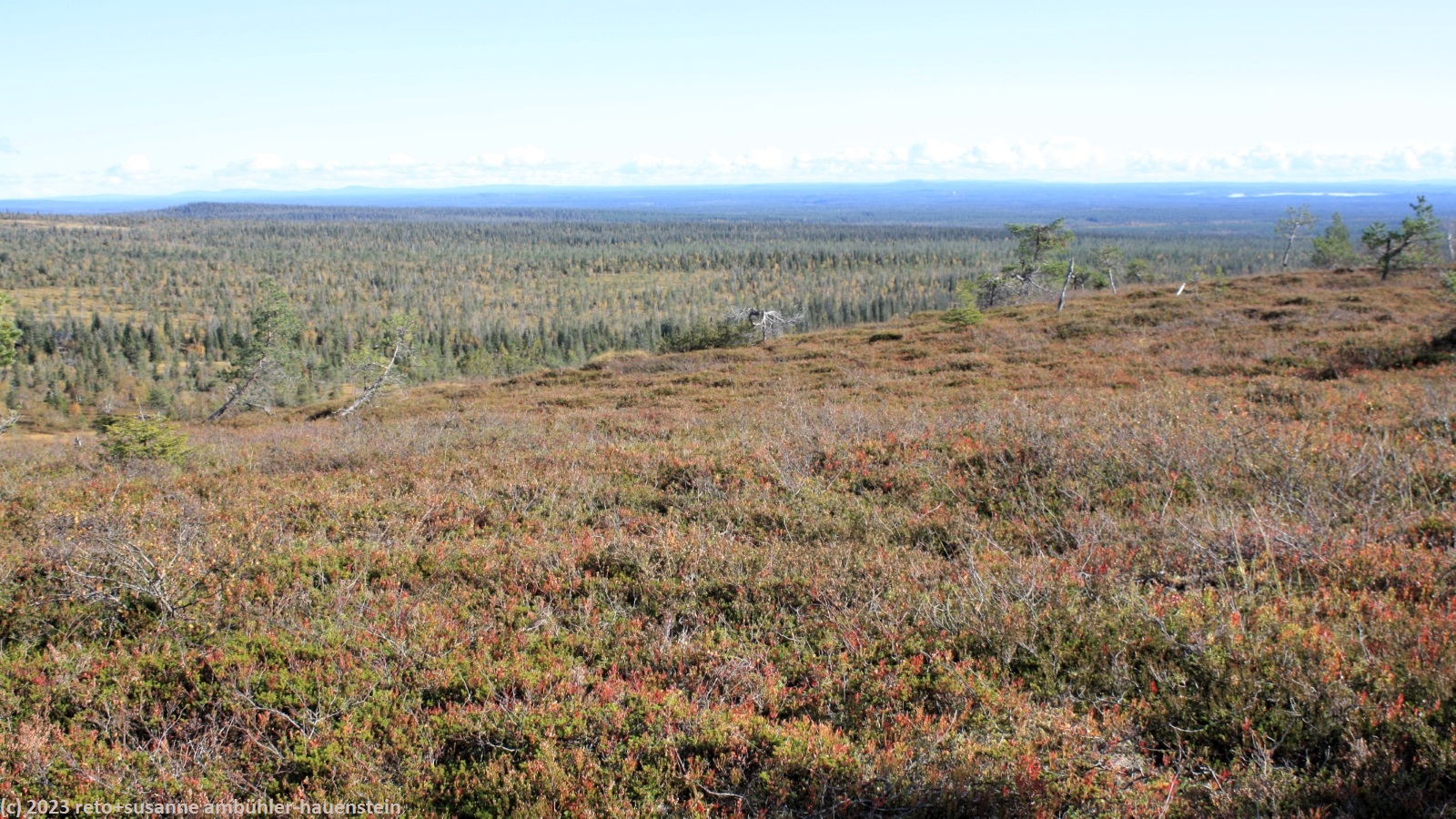 wir wollen den knapp 11 km langen rundweg riisin rietas wandern, allerdings mit einem zusätzlichen abstecher zum hevonharja. bis zum aussichtspunkt auf dem riisitunturi herrscht reges treiben. es sind vorallem einheimische, die nun ferien machen, ausländische touristen hat es fast keine mehr. allerdings ist wohl das eine oder andere fahrzeug ein mietwagen, so dass die reisenden trotz finnischem kontrollschild nicht zwingend finnen sind. aber auf dem wanderweg hören wir ausschliesslich finnisch. die aussicht vom riisitunturi ist fantastisch. wir sehen im südosten den mächtigen yli-kitka. im see hat es zahlreiche inseln, das sieht toll aus. nun folgen wir den grünen und orangen markierungen westwärts. hier sind etwas weniger leute unterwegs, aber immer noch erstaunlich viele. wir wandern durch einen wunderschönen herbstwald. um 11:50 uhr erreichen wir die schutzhütte uusilampi. zahlreiche menschen sitzen hier und picknicken. wir setzen unsere wanderung fort und sind zehn minuten später bei der verzweigung, bei welcher der mit grünen punkten markierte rundgang rechts abbiegen würde, während der mit orangen punkten markierte riisitunturin reitti nach links abbiegt. letzteres ist ein 26 km langer weg, welcher durch den südlichen teil des nationalparks sowie durch das südlich anschliessende naturschutzgebiet führt. letzterem folgen wir nun westwärts. auf dem schmalen pfad geht es weiterhin durch einen wunderschönen wald. hier sind keine anderen leute unterwegs. es fällt uns auf, dass es in diesem wald absolut still ist. nirgends raschelt ein tier und es singt kein vogel, das ist irgendwie seltsam. der weg verläuft durch ein tal mit einem kleinen bach und einer sumpfigen ebene, dann steigt er eher steil an. kurz vor 12:40 uhr erreichen wir den mit 326 m.ü.m. höchsten punkt des hevonharja.