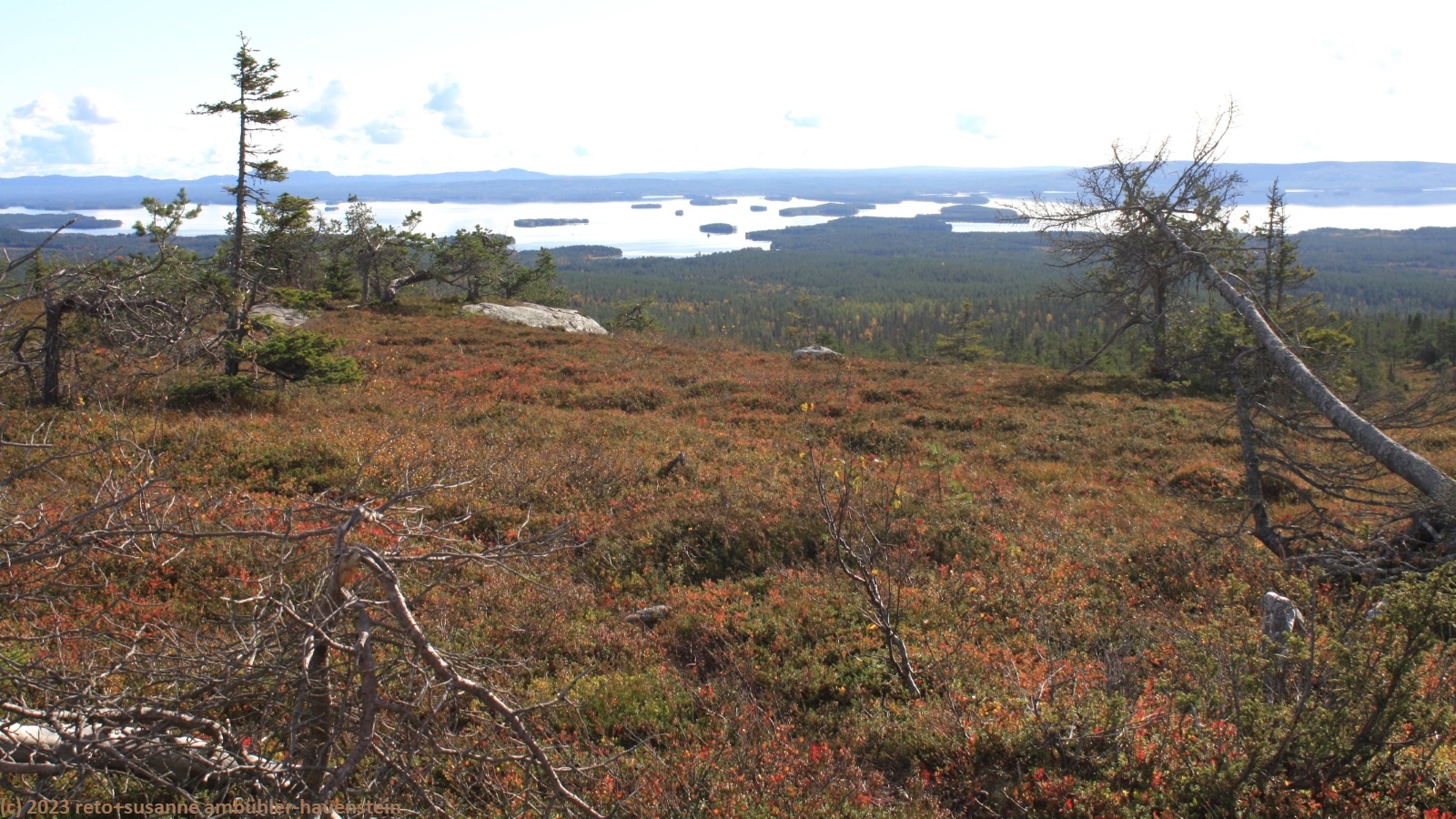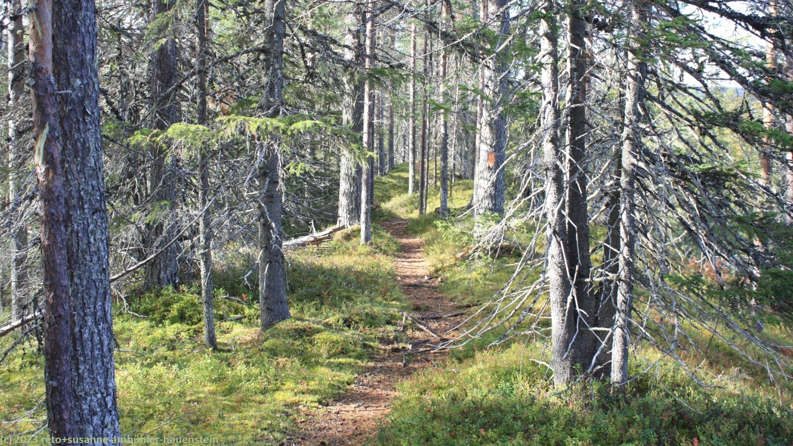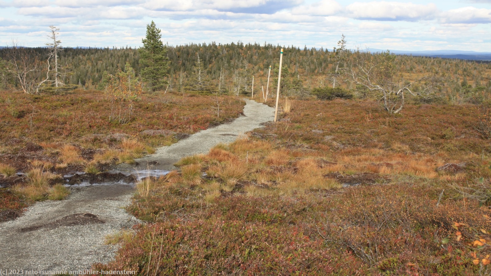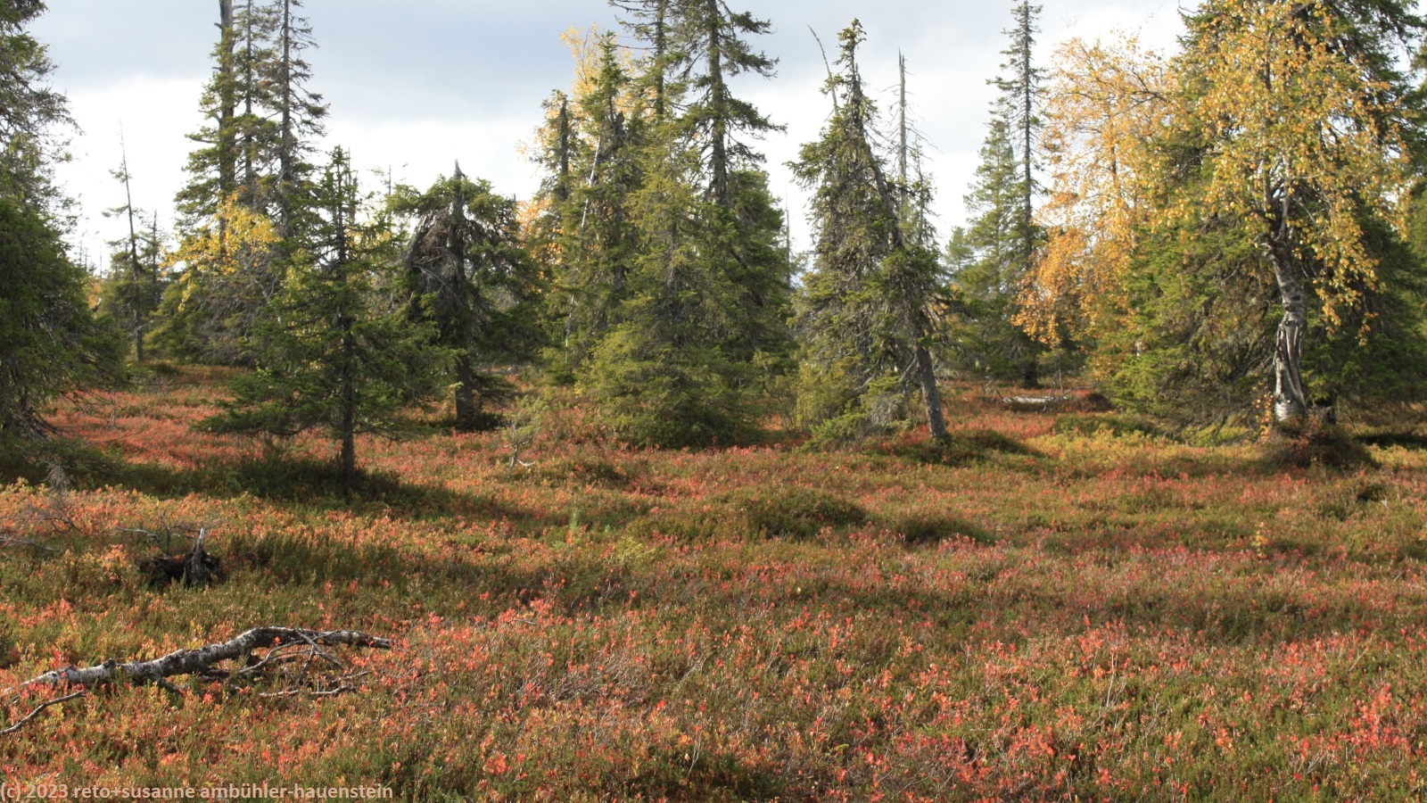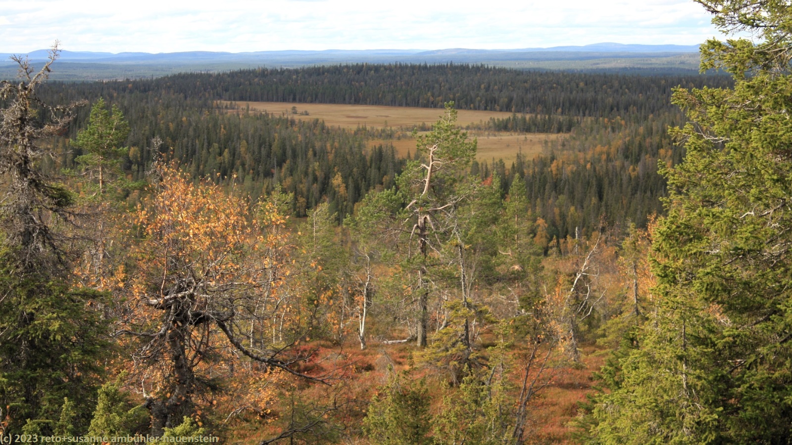 wir wollen den knapp 11 km langen rundweg riisin rietas wandern, allerdings mit einem zusätzlichen abstecher zum hevonharja. bis zum aussichtspunkt auf dem riisitunturi herrscht reges treiben. es sind vorallem einheimische, die nun ferien machen, ausländische touristen hat es fast keine mehr. allerdings ist wohl das eine oder andere fahrzeug ein mietwagen, so dass die reisenden trotz finnischem kontrollschild nicht zwingend finnen sind. aber auf dem wanderweg hören wir ausschliesslich finnisch. die aussicht vom riisitunturi ist fantastisch. wir sehen im südosten den mächtigen yli-kitka. im see hat es zahlreiche inseln, das sieht toll aus. nun folgen wir den grünen und orangen markierungen westwärts. hier sind etwas weniger leute unterwegs, aber immer noch erstaunlich viele. wir wandern durch einen wunderschönen herbstwald. um 11:50 uhr erreichen wir die schutzhütte uusilampi. zahlreiche menschen sitzen hier und picknicken. wir setzen unsere wanderung fort und sind zehn minuten später bei der verzweigung, bei welcher der mit grünen punkten markierte rundgang rechts abbiegen würde, während der mit orangen punkten markierte riisitunturin reitti nach links abbiegt. letzteres ist ein 26 km langer weg, welcher durch den südlichen teil des nationalparks sowie durch das südlich anschliessende naturschutzgebiet führt. letzterem folgen wir nun westwärts. auf dem schmalen pfad geht es weiterhin durch einen wunderschönen wald. hier sind keine anderen leute unterwegs. es fällt uns auf, dass es in diesem wald absolut still ist. nirgends raschelt ein tier und es singt kein vogel, das ist irgendwie seltsam. der weg verläuft durch ein tal mit einem kleinen bach und einer sumpfigen ebene, dann steigt er eher steil an. kurz vor 12:40 uhr erreichen wir den mit 326 m.ü.m. höchsten punkt des hevonharja.