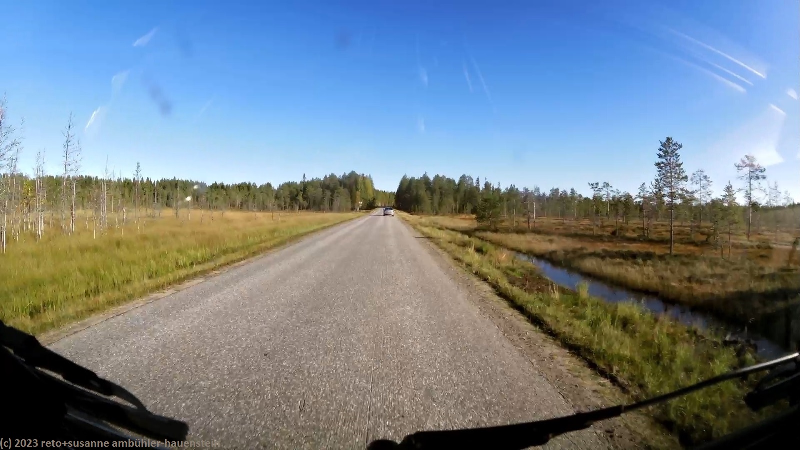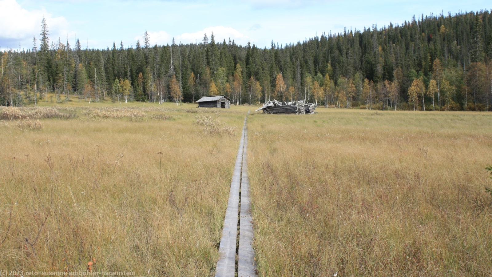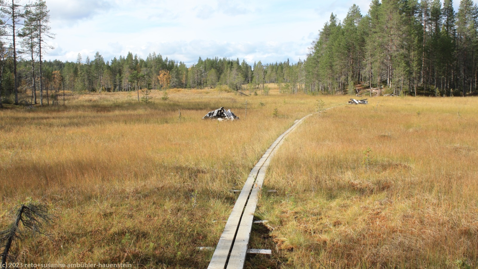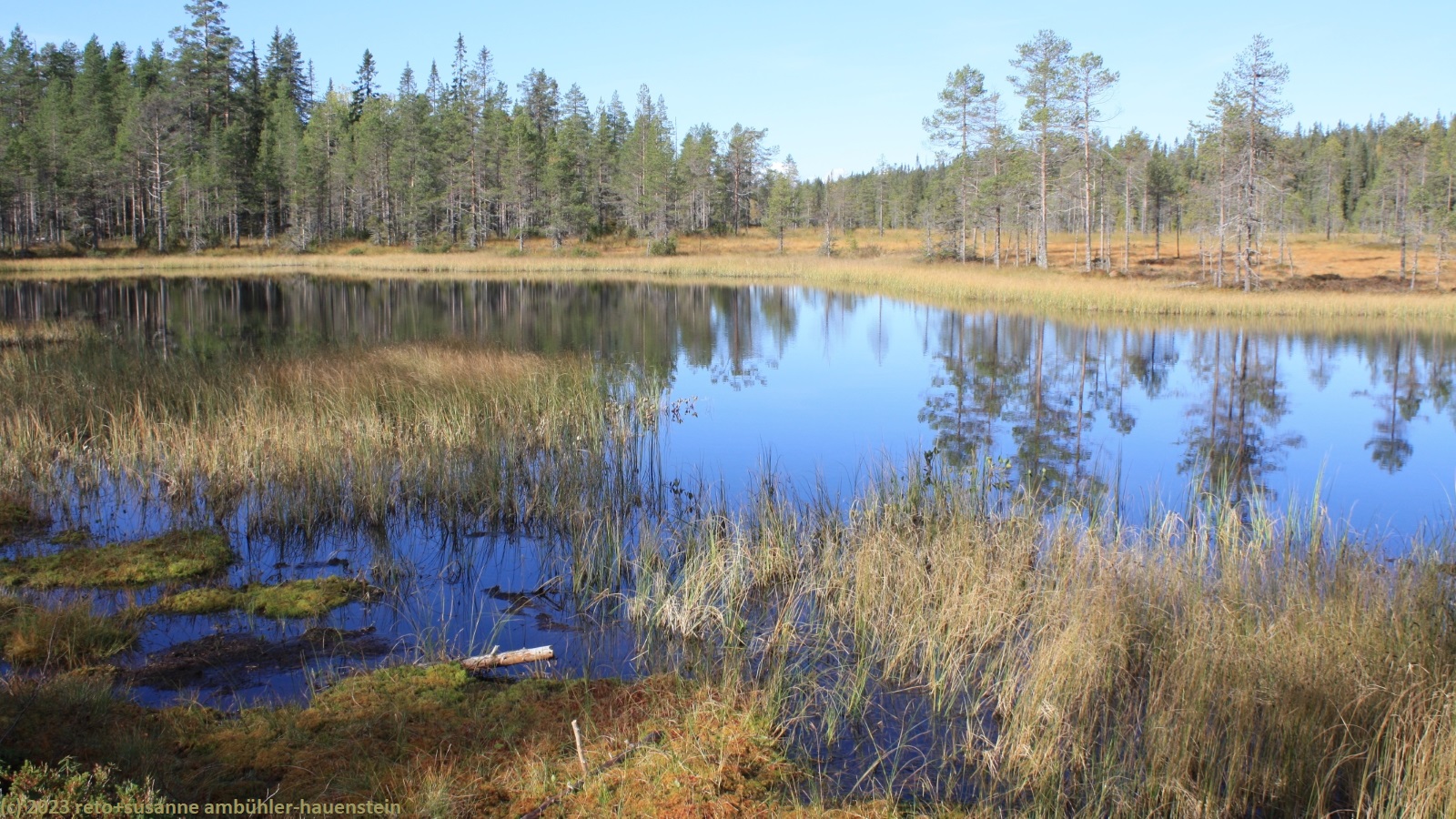 wir wollen den knapp 11 km langen rundweg riisin rietas wandern, allerdings mit einem zusätzlichen abstecher zum hevonharja. bis zum aussichtspunkt auf dem riisitunturi herrscht reges treiben. es sind vorallem einheimische, die nun ferien machen, ausländische touristen hat es fast keine mehr. allerdings ist wohl das eine oder andere fahrzeug ein mietwagen, so dass die reisenden trotz finnischem kontrollschild nicht zwingend finnen sind. aber auf dem wanderweg hören wir ausschliesslich finnisch. die aussicht vom riisitunturi ist fantastisch. wir sehen im südosten den mächtigen yli-kitka. im see hat es zahlreiche inseln, das sieht toll aus. nun folgen wir den grünen und orangen markierungen westwärts. hier sind etwas weniger leute unterwegs, aber immer noch erstaunlich viele. wir wandern durch einen wunderschönen herbstwald. um 11:50 uhr erreichen wir die schutzhütte uusilampi. zahlreiche menschen sitzen hier und picknicken. wir setzen unsere wanderung fort und sind zehn minuten später bei der verzweigung, bei welcher der mit grünen punkten markierte rundgang rechts abbiegen würde, während der mit orangen punkten markierte riisitunturin reitti nach links abbiegt. letzteres ist ein 26 km langer weg, welcher durch den südlichen teil des nationalparks sowie durch das südlich anschliessende naturschutzgebiet führt. letzterem folgen wir nun westwärts. auf dem schmalen pfad geht es weiterhin durch einen wunderschönen wald. hier sind keine anderen leute unterwegs. es fällt uns auf, dass es in diesem wald absolut still ist. nirgends raschelt ein tier und es singt kein vogel, das ist irgendwie seltsam. der weg verläuft durch ein tal mit einem kleinen bach und einer sumpfigen ebene, dann steigt er eher steil an. kurz vor 12:40 uhr erreichen wir den mit 326 m.ü.m. höchsten punkt des hevonharja.