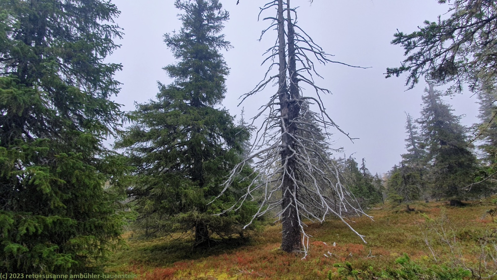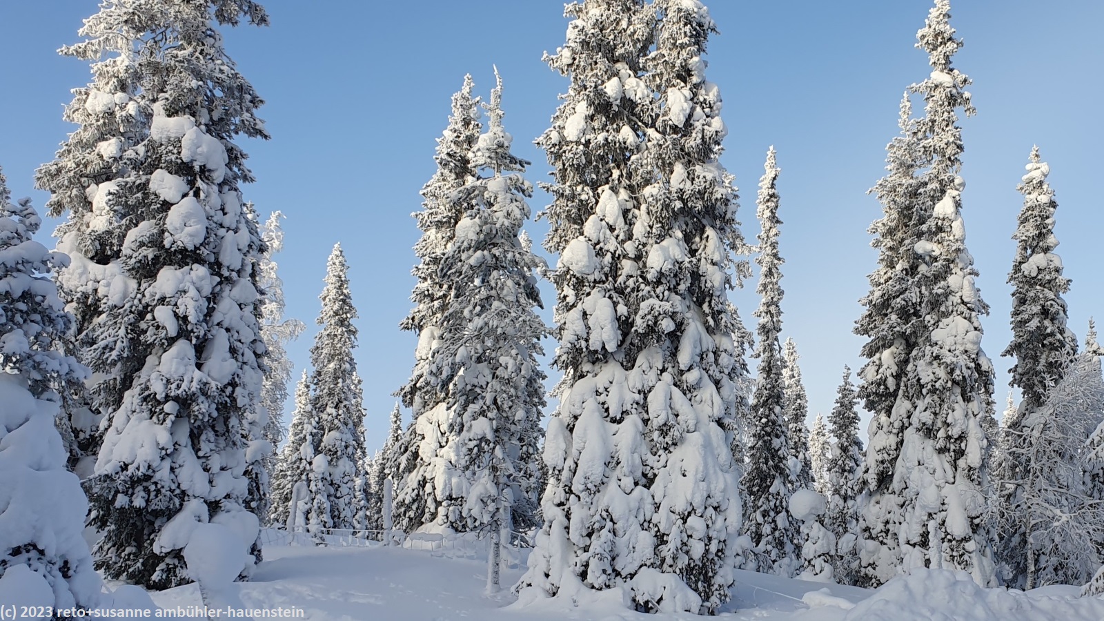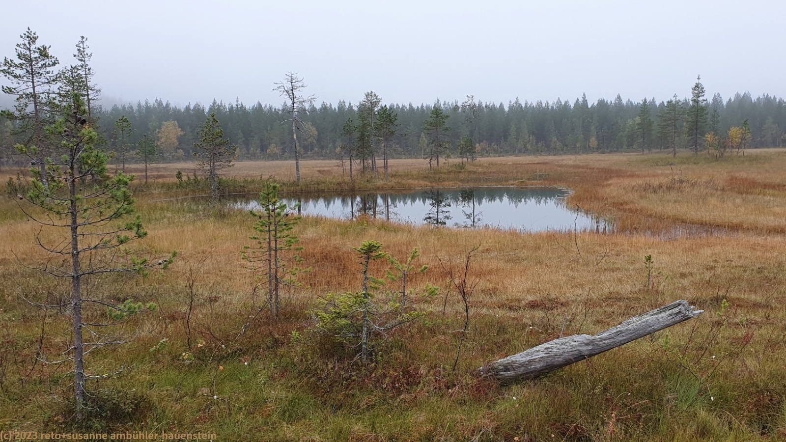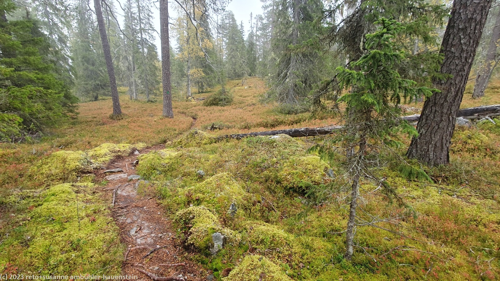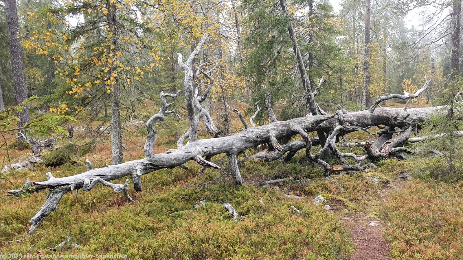 als wir heute morgen um 8 uhr aufstehen ist es spürbar weniger kalt als gestern, frisch fühlt es sich trotzdem an. wie vorhergesagt, gibt es heute keine sonne. das hält uns natürlich nicht davon ab, trotzdem eine wanderung zu machen. wir fahren zum nahen hotel kirintövaara und folgen dann den orangen und grünen markierungen nordwärts. dies ist das südliche ende des 26 km langen riisitunturin reitti, auf dessen nördlichem ende wir gestern unterwegs waren. anfangs geht es über einen gerodeten weg, vermutlich wurde hier für die loipe im winter platz geschaffen. danach führt ein schmaler pfad durch einen wunderschönen wald. wir sind nur knapp unter der wolkendecke, dies gibt der landschaft etwas mystisches. im gegensatz zu gestern sind keine anderen menschen unterwegs. unsere wanderung ist eine kombination der beiden wege kirinmatala und kirinkuoppa. beide folgen grundsätzlich dem riisitunturin reitti, enthalten aber kleine abstecher. nach etwa zwei kilometer erreichen wir das naturschutzgebiet. ziemlich genau um mittag sind wir bei der kuoppavaaran laavu. bevor wir hier zu mittag essen, wollen wir noch die schleife um den matalavaara laufen. wir folgen daher einen weiteren kilometer dem riisitunturin reitti nordwärts, dann biegen wir rechts ab. der pfad ist zwar nicht auf meiner karte eingezeichnet, aber sehr gut markiert, so dass man sich kaum verlaufen kann. am "gipfel" des matalavaara vorbei geht es wieder südwärts. mit 381 meter ist der hügel zu wenig hoch, als dass wir über die waldgrenze kommen würden, das heisst, es gibt keine aussicht. aber der wunderschöne wald ist jeden schritt wert. die fichten in diesem gebiet haben eine ganz besondere form. die äste zeigen alle nach unten, damit sie im winter unter der last des schnees nicht brechen, sondern sich gegenseitig unterstützen. daher sehen tief verschneite fichten aus wie säulen.