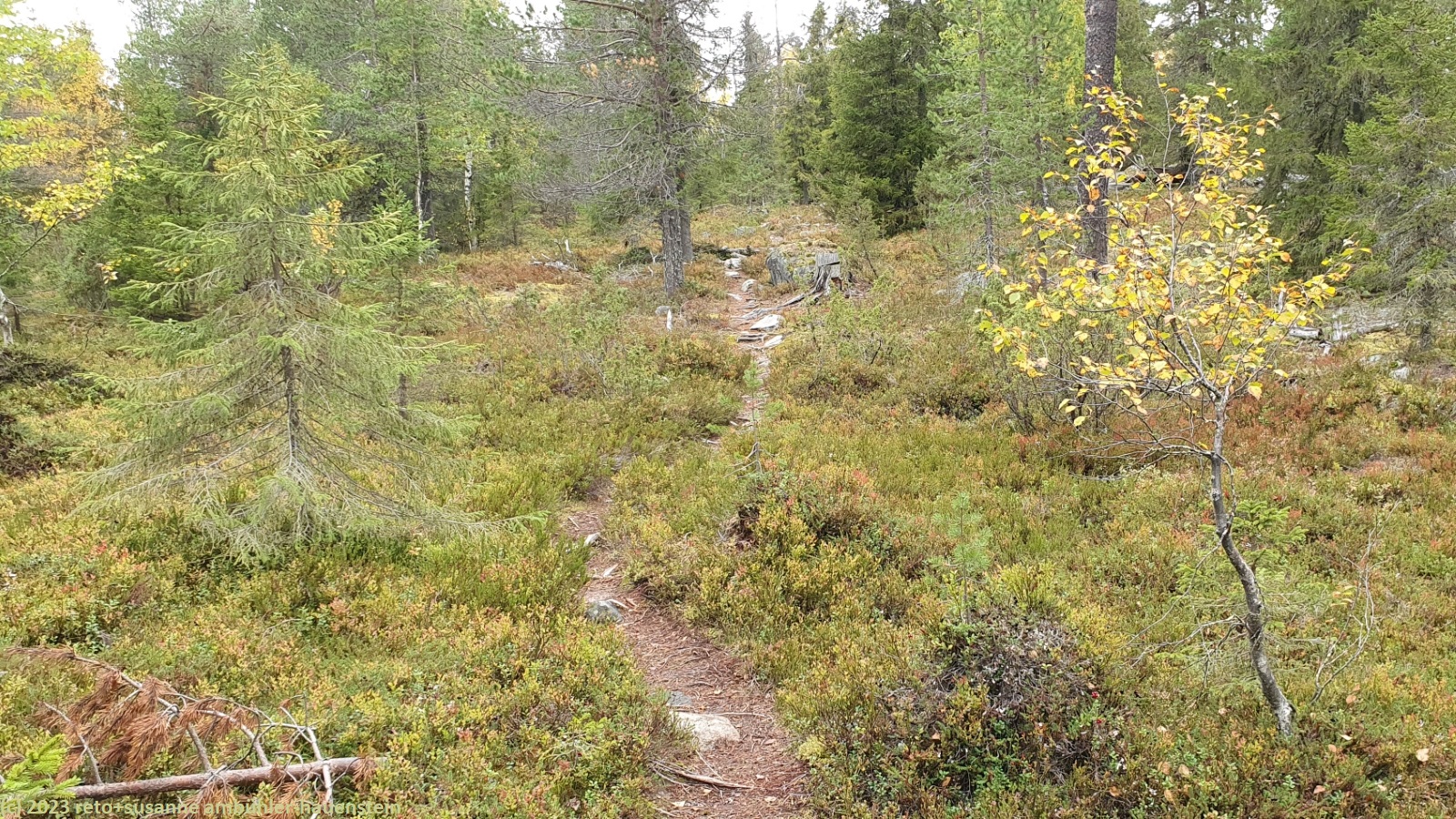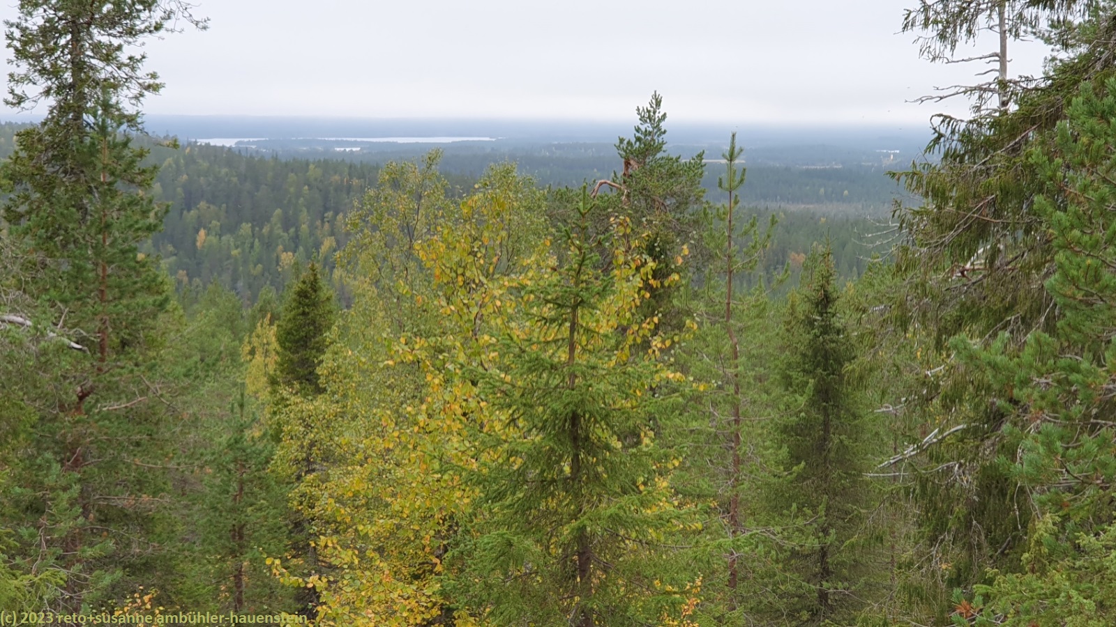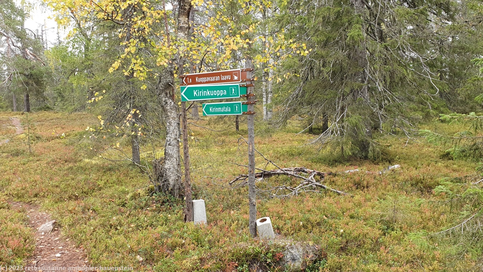 obwohl es heute morgen deutlich weniger kalt ist als gestern, frühstücken wir trotzdem im jogi. um 10:30 uhr fahren wir zum nahen hotel kirintövaara. unsere heutige wanderung ist eine kombination der beiden wege kirinmatala und kirinkuoppa. diese folgen weitgehend dem riisitunturin reitti mit kleinen abstechern. der pfad führt durch einen wunderschönen, herbstlichen wald. nachdem wir den matalavaara umrundet haben, picknicken wir in der kuoppavaaran laavu. über den kuoppavaara kehren wir zum ausgangspunkt zurück. wir fahren nach posio um lebensmittel einzukaufen. zurück auf dem campingplatz geniessen wir einen tee und einen berliner. nach dem abendessen planen wir erst die nächsten tage, dann liest meine frau, ich führe die bücher nach.