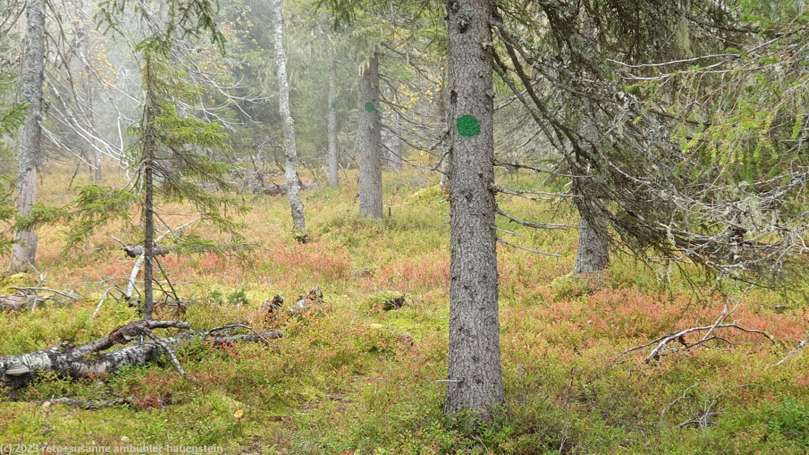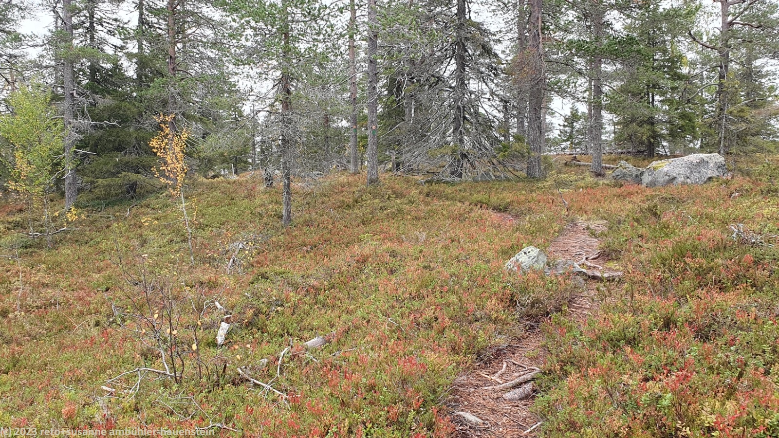bevor wir wieder aufbrechen, löschen wir das feuer aus. nun folgen wir nicht dem mit orangen punkten markierten riisitunturin reitti, sondern dem mit grünen punkten markierten kirinkuoppa zum kuoppavaara. auch diese kuppe ist zu wenig hoch, um über die waldgrenze zu gelangen, aber beim höchsten punkt sehen wir immerhin ein bisschen ins tal hinunter. wenig später trifft unser weg wieder mit dem riisitunturin reitti zusammen. kurz nach 15:15 uhr sind wir wieder beim jogi.