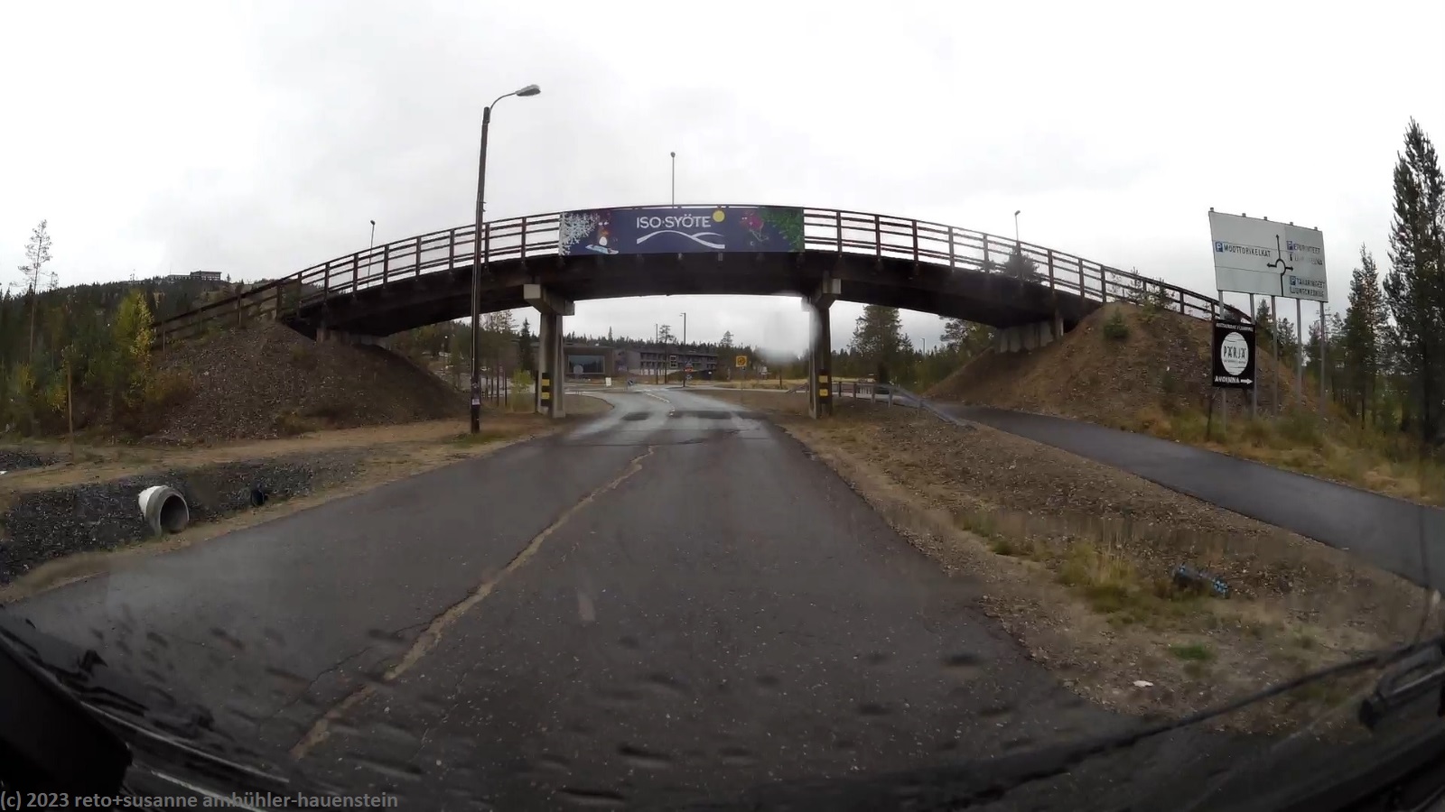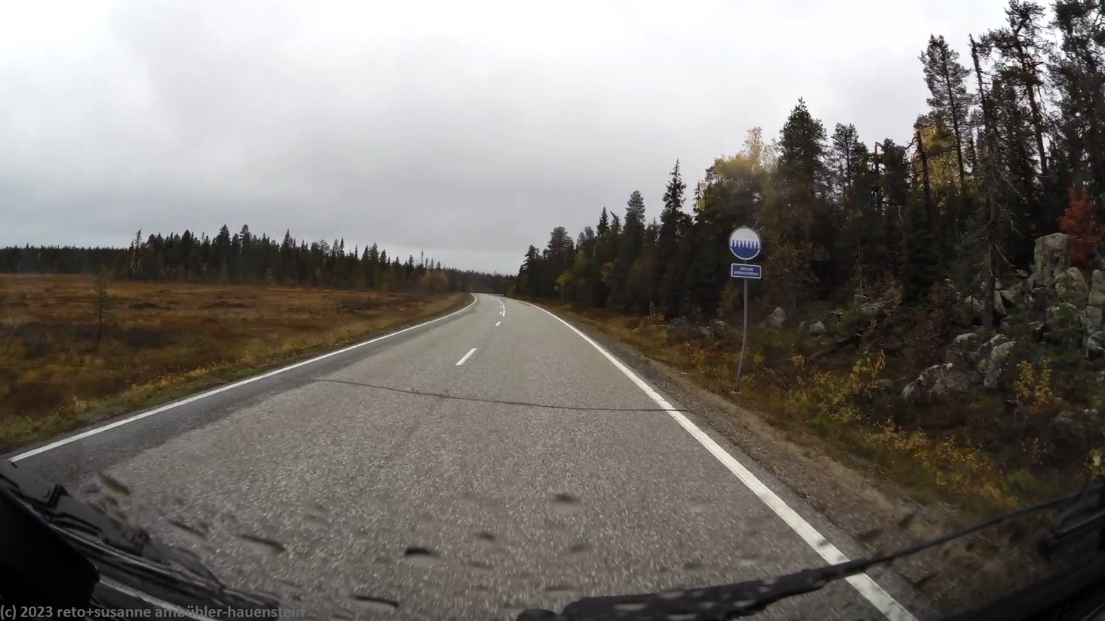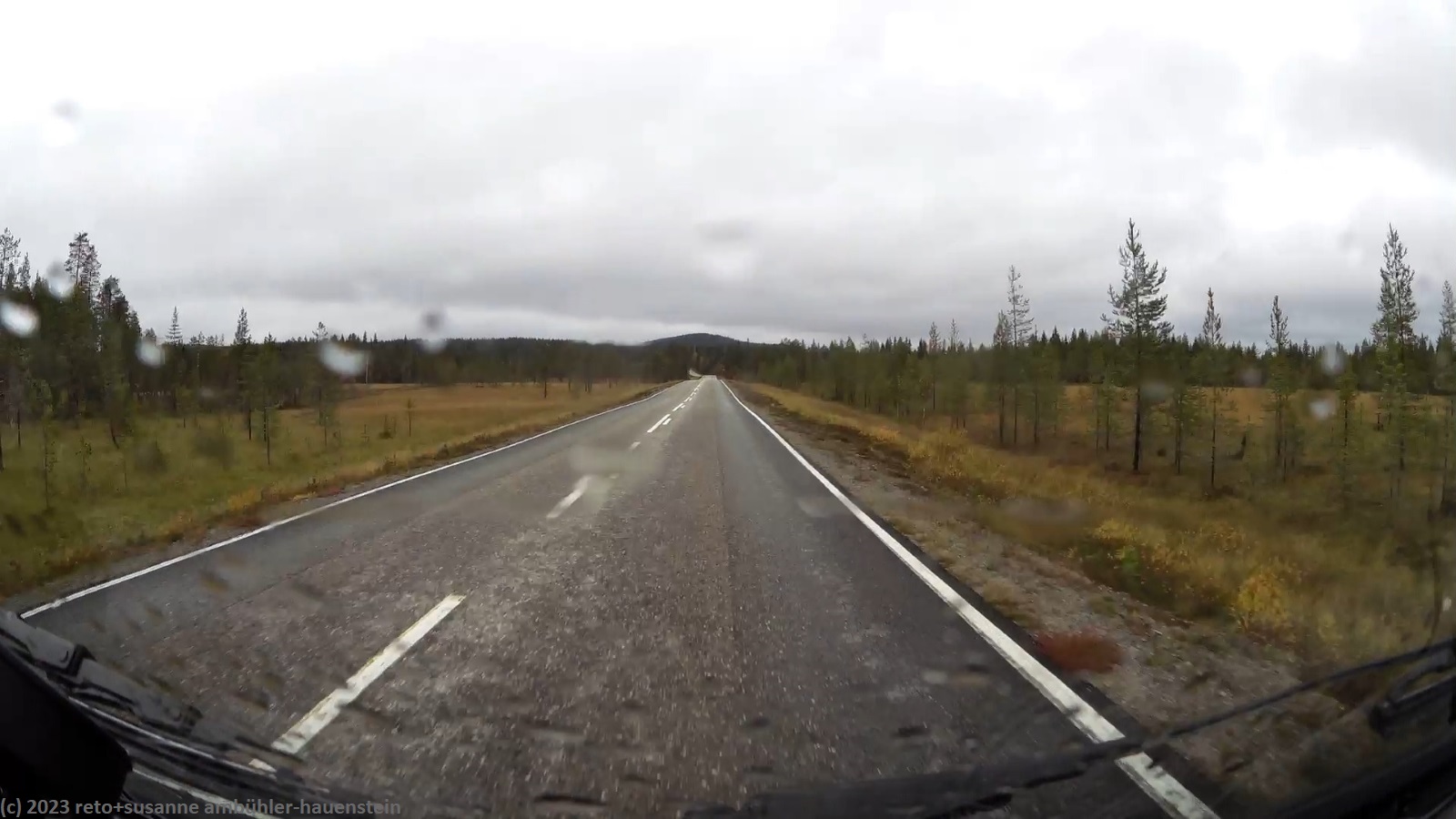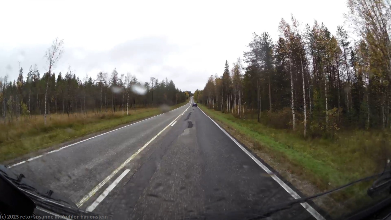 beim kreisel am südende der stadt besuchen wir das visitor center, finden aber nur wenig informationen über den syöte nationalpark. zu den anderen drei - oulanka, riisitunturi und hossa - hätte es hilfreichere broschüren gehabt. bei der tankstelle auf der anderen strassenseite tanken wir unseren wagen auf, dann geht es auf der strasse 20 in westlicher richtung weiter. es hat kaum verkehr, dafür einige rentiere am strassenrand. die strasse hat ein eigenartiges muster: lange gerade strecken die aussehen wir berg- und talbahnen, dazwischen einige kurven. der regen hat unterschiedliche intensität und macht immer mal wieder pause. einmal ist die sonne durch die wolkendecke zu erkennen. beim koitijärvi schlägt das navi vor, die strasse 20 zu verlassen. der abschnitt bis zur strasse 863 ist nicht asphaltiert. es wäre wohl schneller gewesen, auf der gut ausgebauten strasse 20 zu bleiben und in taivalkoski direkt auf die strasse 863 abzubiegen, aber ein bisschen abenteuer ist immer willkommen. um 12:20 uhr sind wir beim campingplatz.