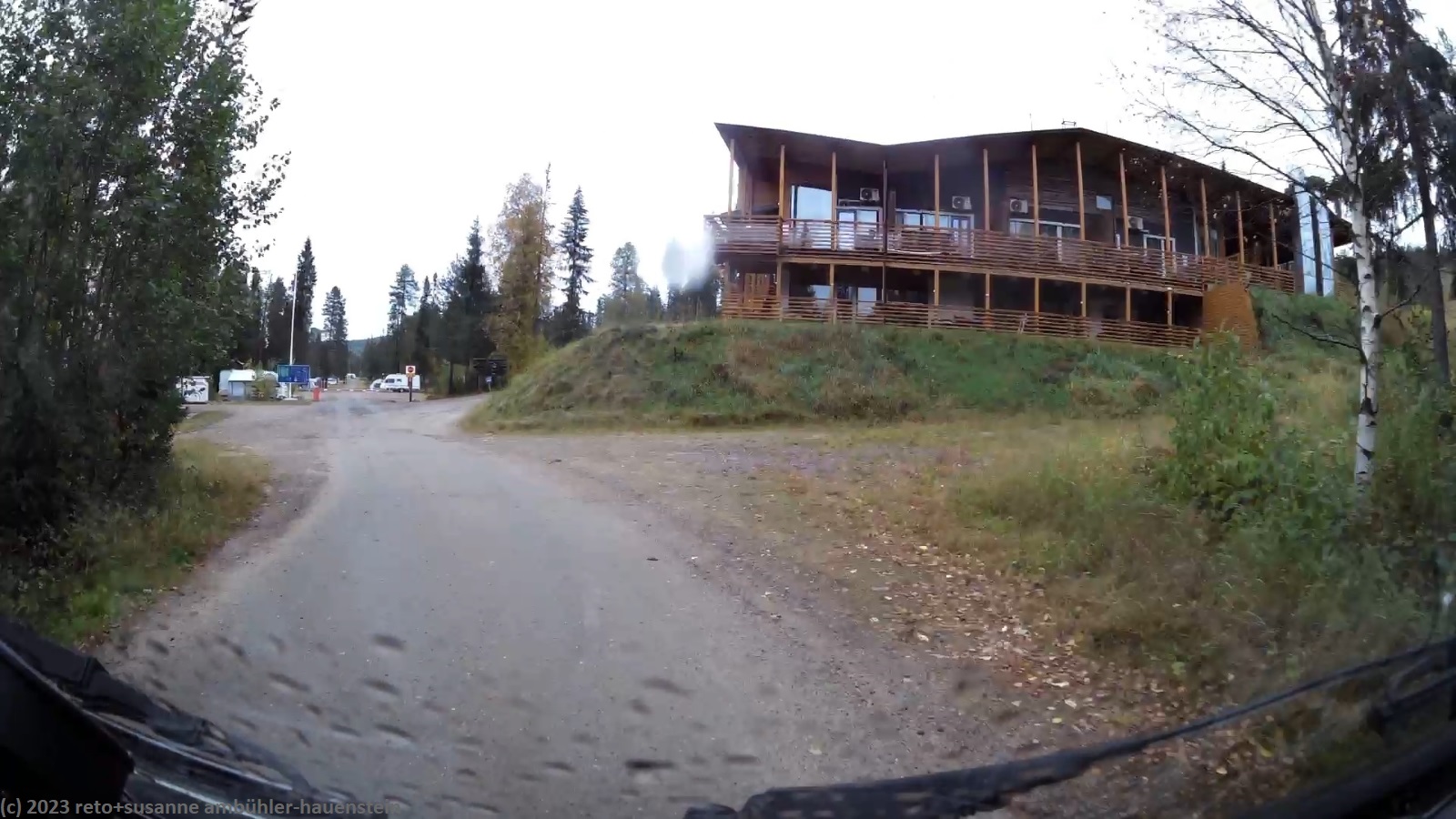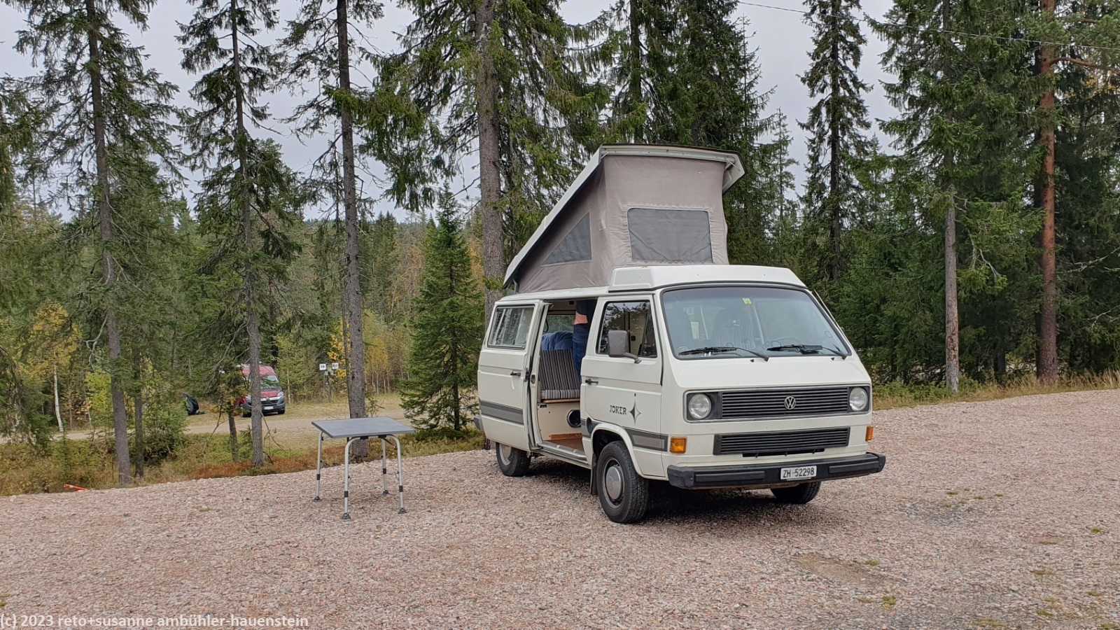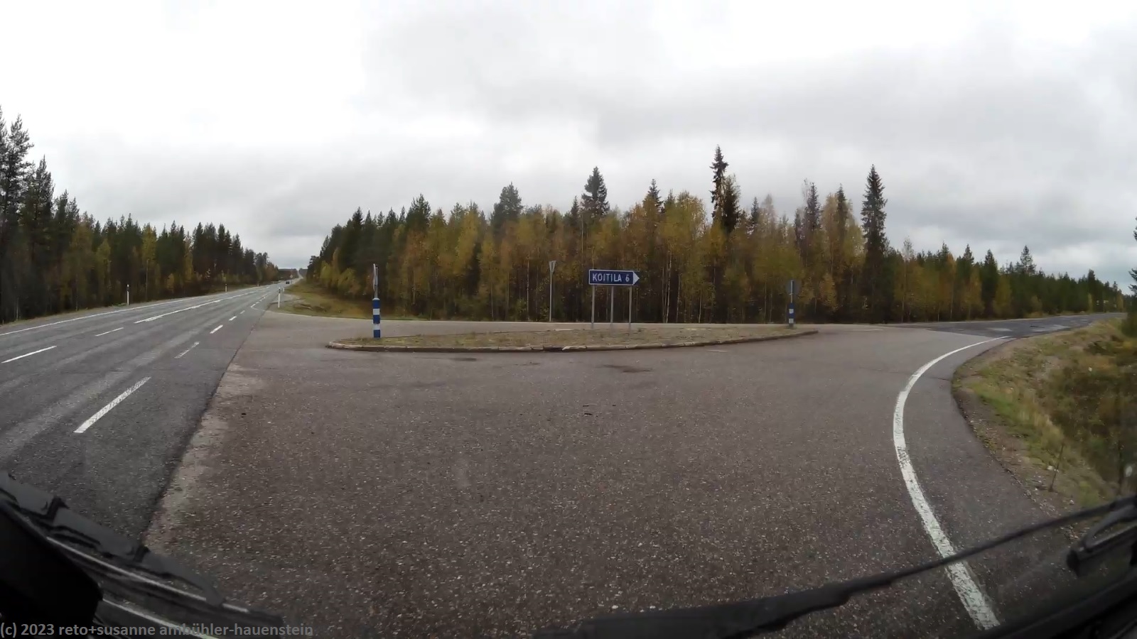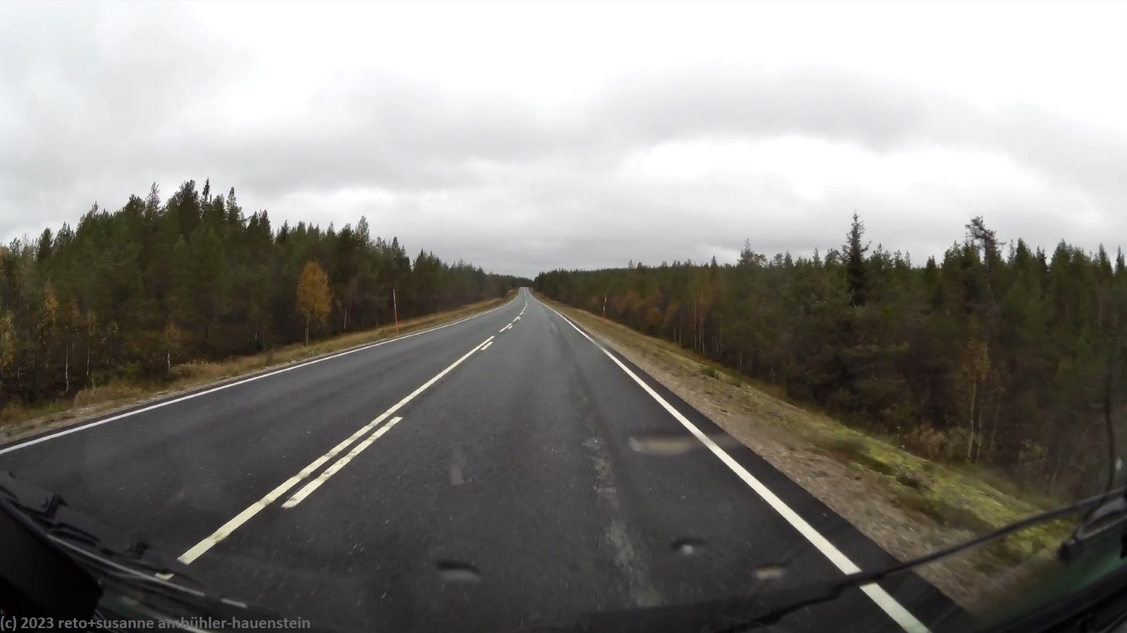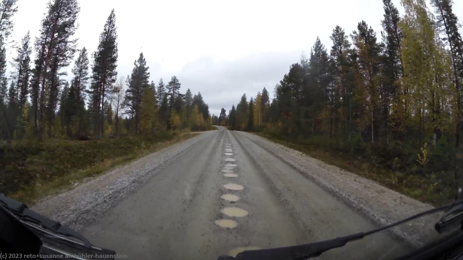 beim kreisel am südende der stadt besuchen wir das visitor center, finden aber nur wenig informationen über den syöte nationalpark. zu den anderen drei - oulanka, riisitunturi und hossa - hätte es hilfreichere broschüren gehabt. bei der tankstelle auf der anderen strassenseite tanken wir unseren wagen auf, dann geht es auf der strasse 20 in westlicher richtung weiter. es hat kaum verkehr, dafür einige rentiere am strassenrand. die strasse hat ein eigenartiges muster: lange gerade strecken die aussehen wir berg- und talbahnen, dazwischen einige kurven. der regen hat unterschiedliche intensität und macht immer mal wieder pause. einmal ist die sonne durch die wolkendecke zu erkennen. beim koitijärvi schlägt das navi vor, die strasse 20 zu verlassen. der abschnitt bis zur strasse 863 ist nicht asphaltiert. es wäre wohl schneller gewesen, auf der gut ausgebauten strasse 20 zu bleiben und in taivalkoski direkt auf die strasse 863 abzubiegen, aber ein bisschen abenteuer ist immer willkommen. um 12:20 uhr sind wir beim campingplatz.