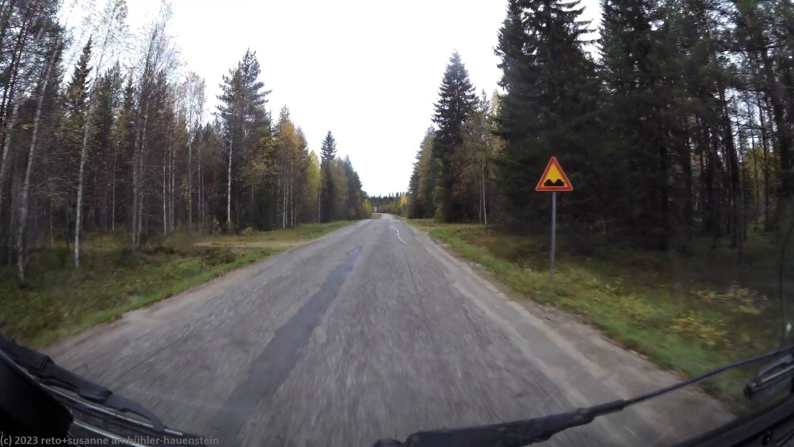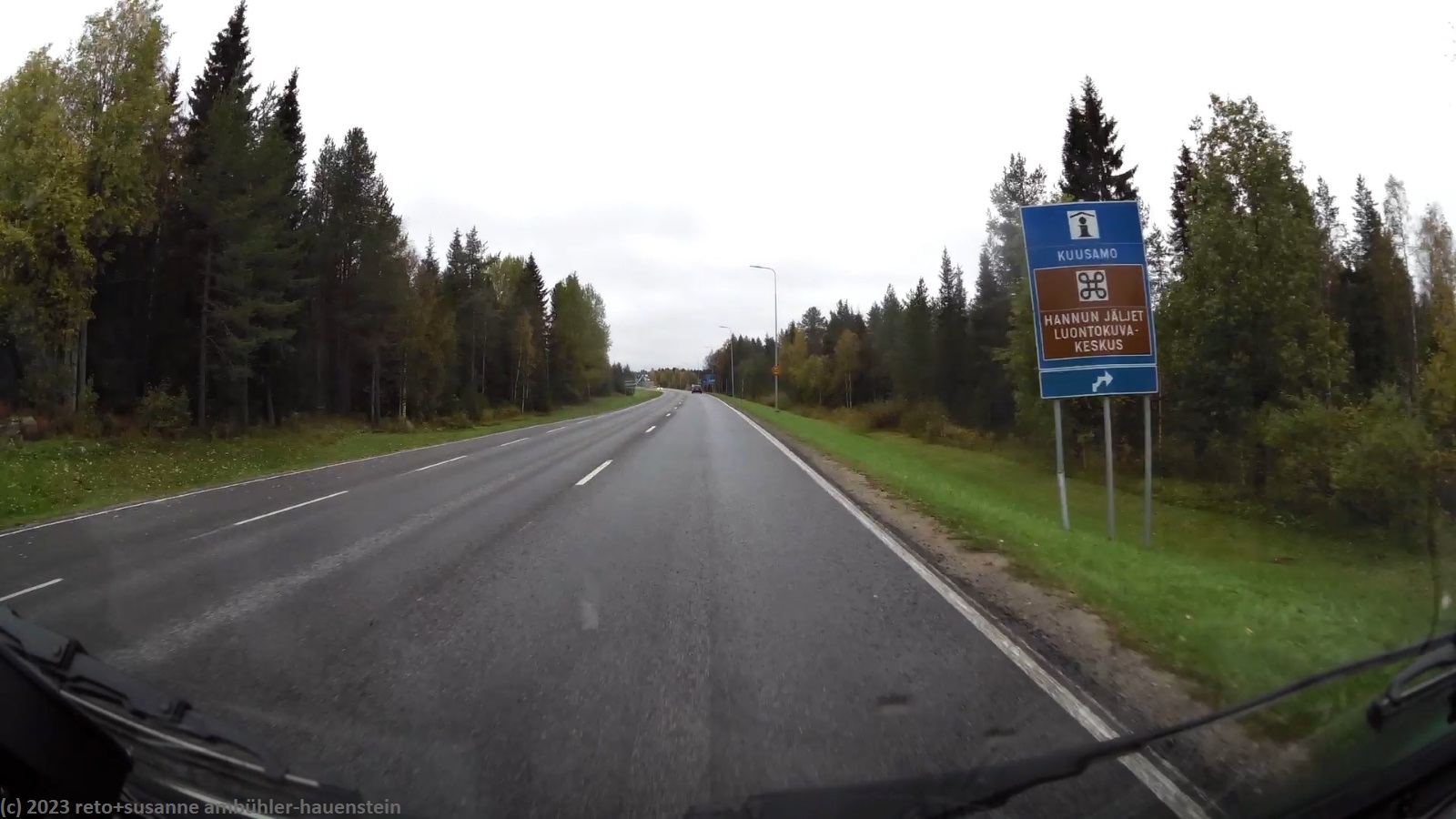 als wir gegen 9 uhr aufstehen, regnet es leicht. nach dem frühstück machen wir uns auf den weg richtung syöte nationalpark. dazu müssen wir auf der strasse 5 15 km nordwärts bis kuusamo zurück fahren.