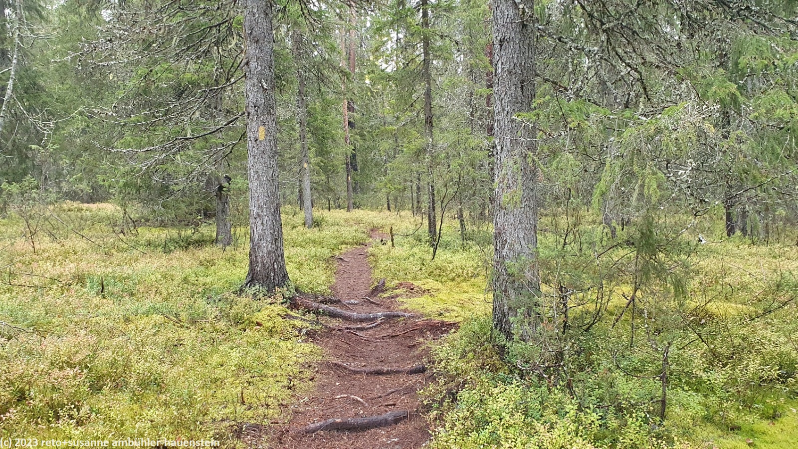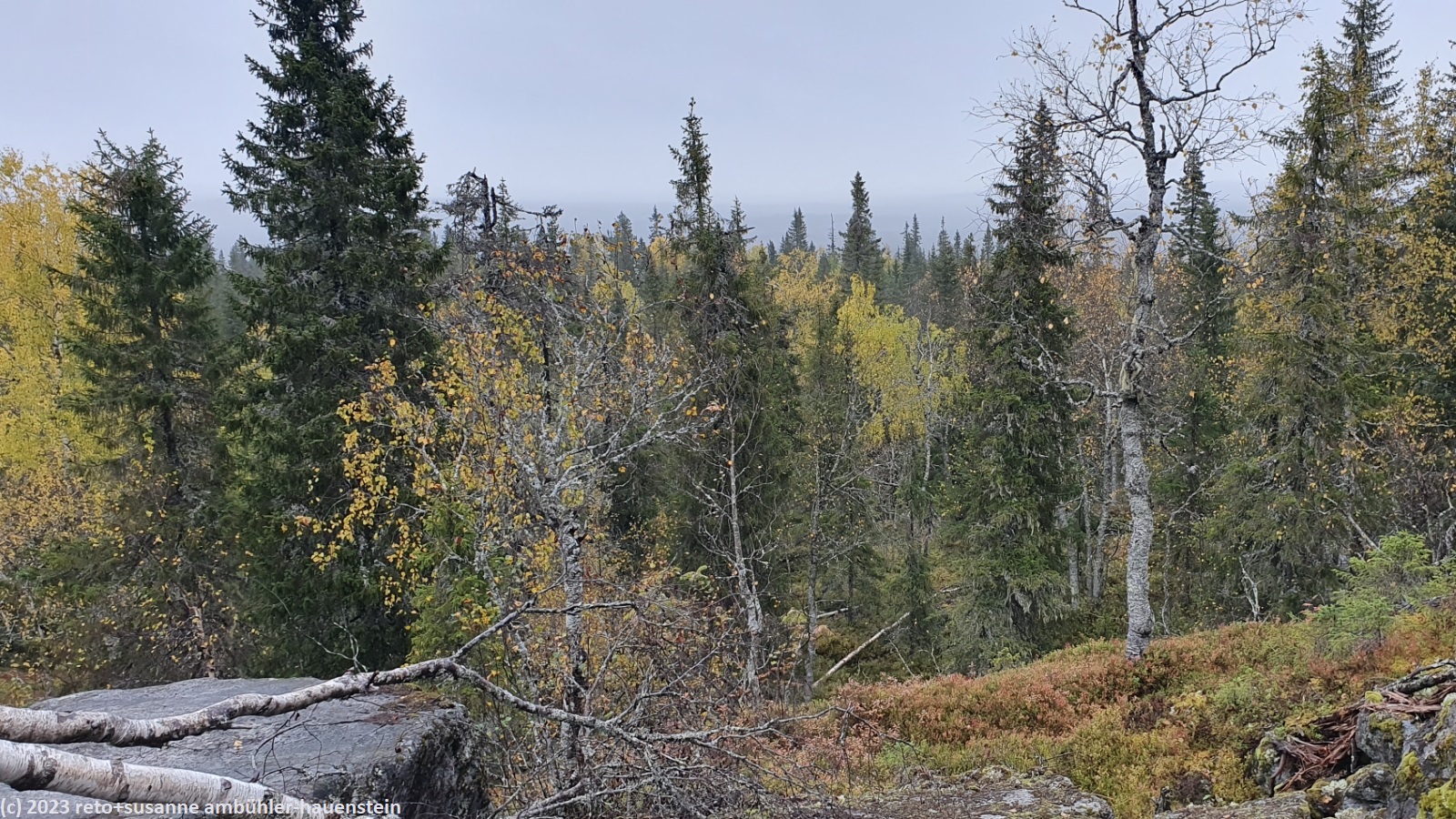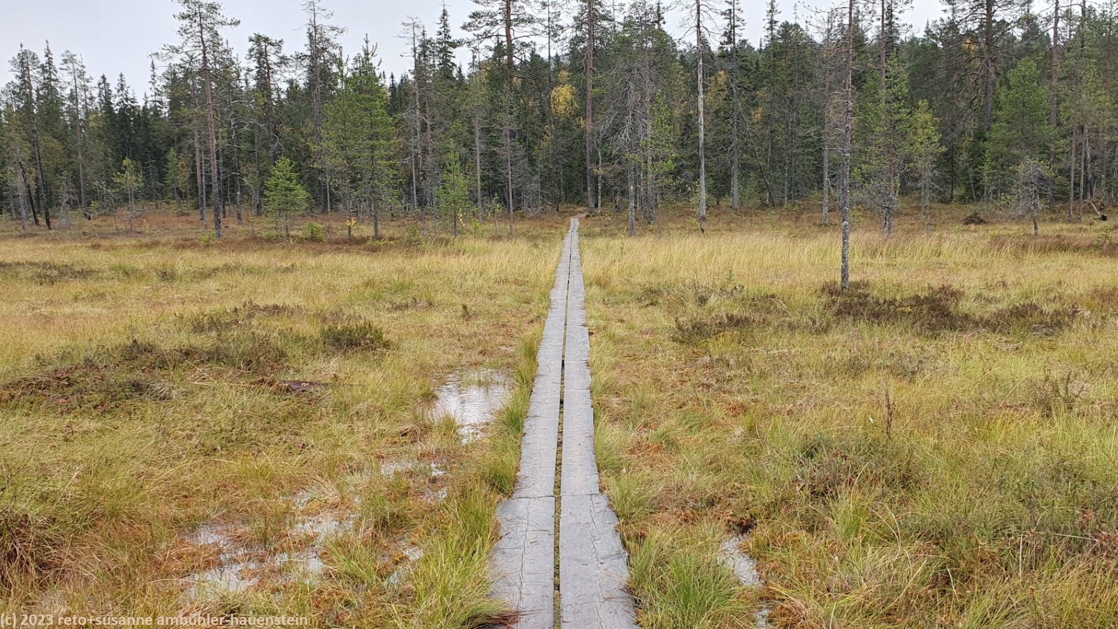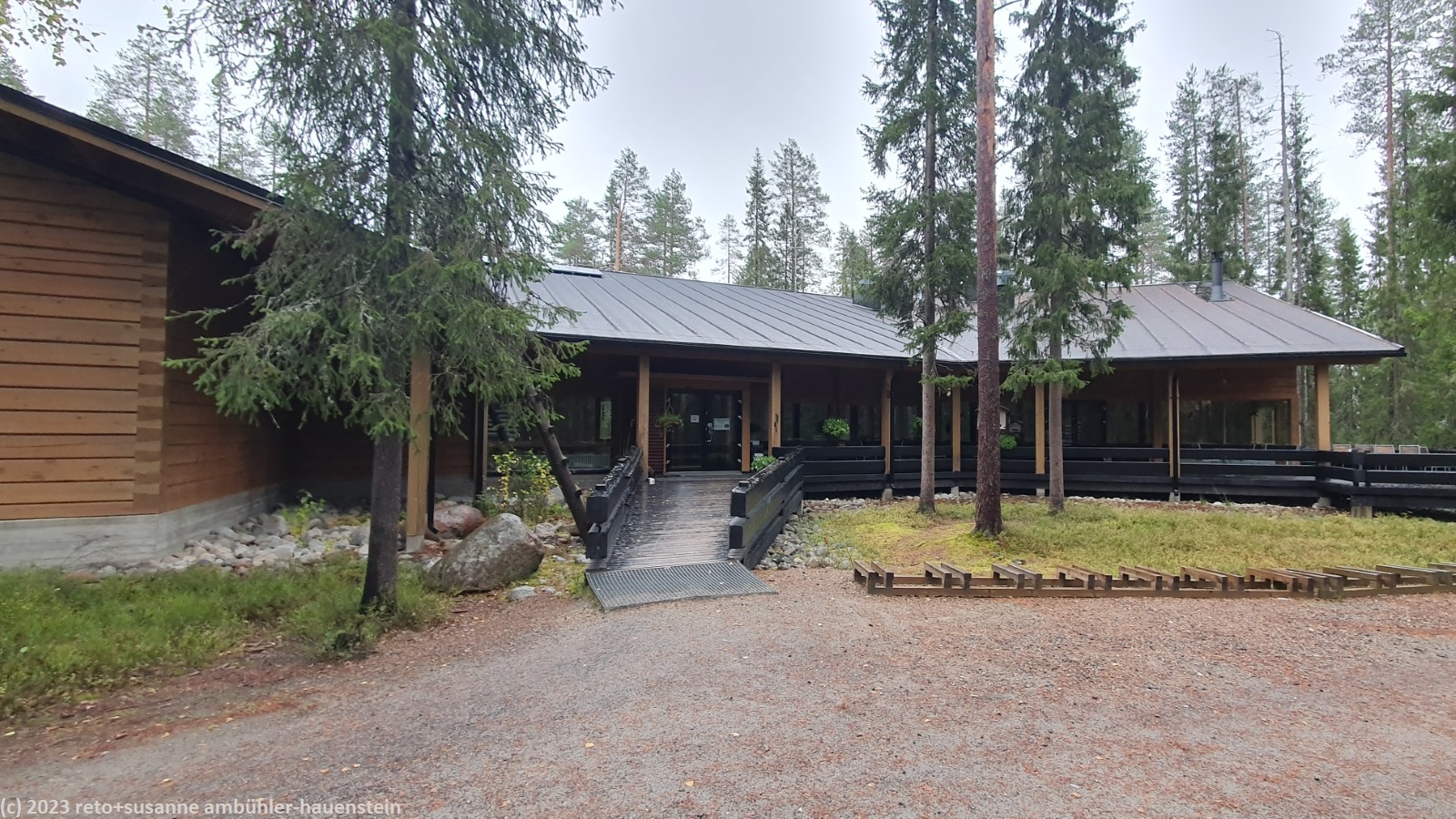 während unsere bettwäsche gewaschen wird, essen wir im jogi zu mittag. danach stecken wir die saubere wäsche in den trockner und spazieren zum grossen hotel bei der talstation des skiliftes. anschliessend an den nationalpark hat es ein skigebiet mit mehreren bahnen. der campingplatz ist riesig und es stehen hier viele wohnwagen, die wohl vor allem im winter genutzt werden. auch die parkplätze sind sehr, sehr gross, im winter muss hier ganz schön was los sein. jetzt ist es allerdings sehr, sehr ruhig. im restaurant beim hotel trinken wir einen kaffee. ein stück kuchen oder sonst etwas süsses gibt es leider nicht. im informationszentrum neben dem hotel gibt es auch keine brauchbaren informationen zum nationalpark, dies ist offensichtlich eher ein büro um eine unterkunft zu buchen. im kleinen laden auf der anderen seite des parkplatzes kaufen wir brot und einen sack zimtschnecken, so haben wir wenigstens etwas zum naschen. zurück beim jogi deponieren wir die lebensmittel. wir haben auf einer karte eine kleine rundwanderung von etwa 5 km gesehen, diese nehmen wir nun unter die füsse. das wetter wurde für einen moment etwas freundlicher, aber jetzt fällt wieder leichter regen. eher überraschend stossen wir nach kurzem im wald auf ein visitor center des nationalparks. leider schliesst dieses in 4 minuten. das reicht gerade, um für morgen einen wandervorschlag zu bekommen. wir setzen unsere wanderung fort und folgen dem rundweg über den teerivaara. erst geht es durch einen schönen wald, danach überqueren wir einen sumpf auf den üblichen planken. anschliessend führt ein sehr steiniger und zum schluss ziemlich steiler pfad auf den ersten der beiden gipfel, oder besser den nebengipfel. von hier hätte man bei schönem wetter vermutlich eine tolle aussicht, aber heute sehen wir nur tiefliegende wolken. auf dem zweiten und eigentlichen gipfel hat es zwei schöne picknicktische und eine kleine schutzhütte. bei trockenem wetter ein schöner ort zum verweilen, heute leider etwas weniger. über einen nicht minder steinigen und holprigen pfad geht es nun hinunter. gegen 17:20 uhr sind wir wieder beim visitor center und 10 minuten später beim jogi.
