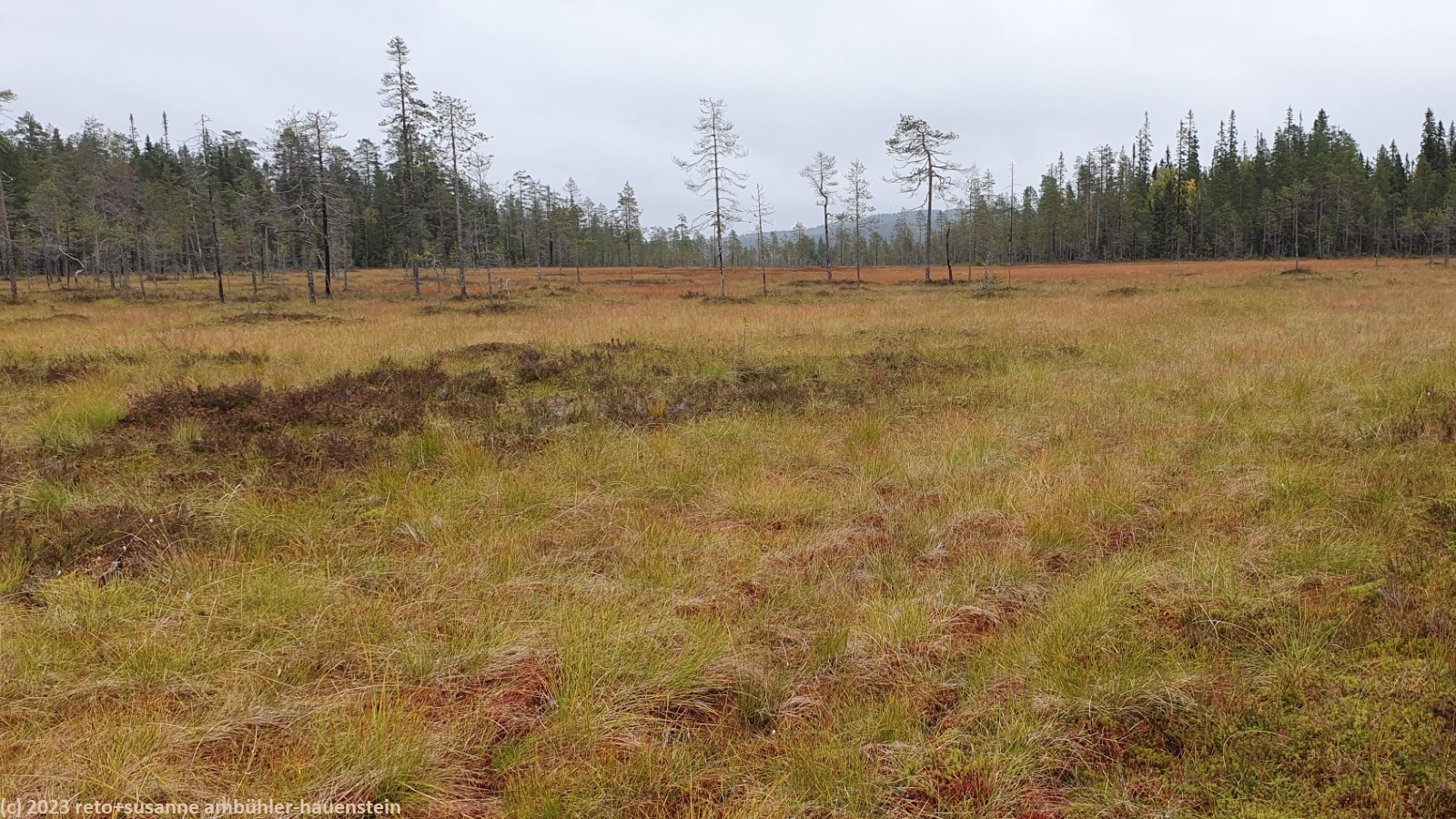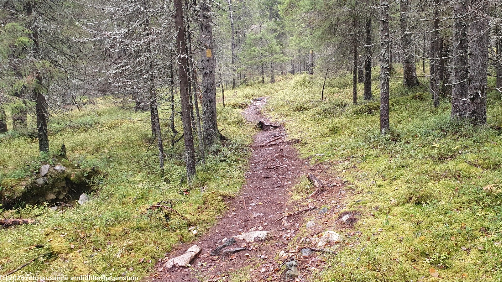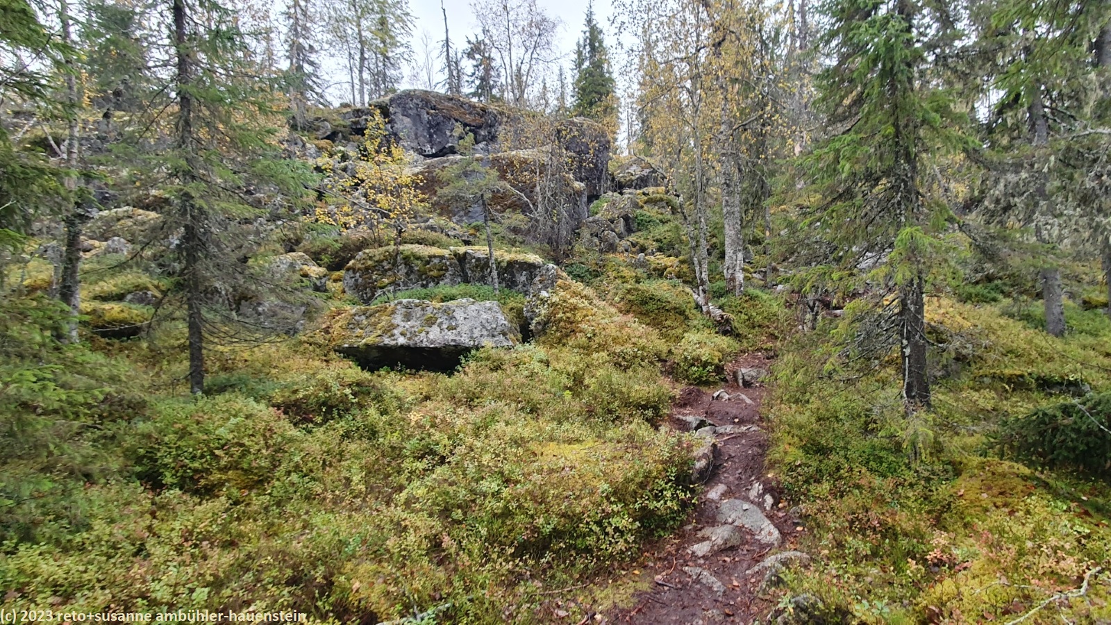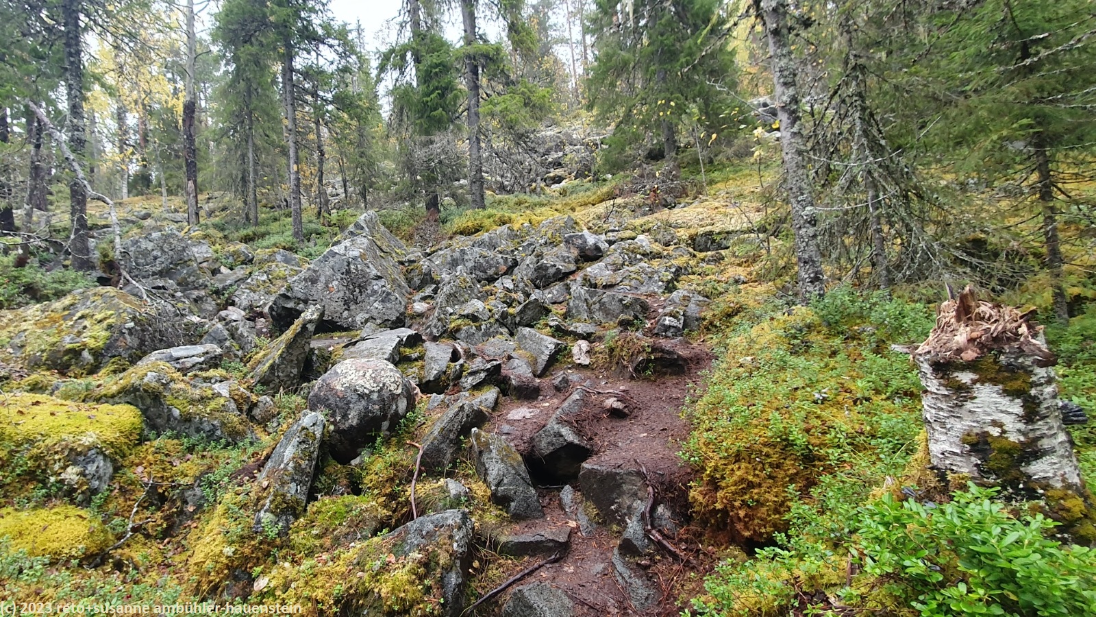 während unsere bettwäsche gewaschen wird, essen wir im jogi zu mittag. danach stecken wir die saubere wäsche in den trockner und spazieren zum grossen hotel bei der talstation des skiliftes. anschliessend an den nationalpark hat es ein skigebiet mit mehreren bahnen. der campingplatz ist riesig und es stehen hier viele wohnwagen, die wohl vor allem im winter genutzt werden. auch die parkplätze sind sehr, sehr gross, im winter muss hier ganz schön was los sein. jetzt ist es allerdings sehr, sehr ruhig. im restaurant beim hotel trinken wir einen kaffee. ein stück kuchen oder sonst etwas süsses gibt es leider nicht. im informationszentrum neben dem hotel gibt es auch keine brauchbaren informationen zum nationalpark, dies ist offensichtlich eher ein büro um eine unterkunft zu buchen. im kleinen laden auf der anderen seite des parkplatzes kaufen wir brot und einen sack zimtschnecken, so haben wir wenigstens etwas zum naschen. zurück beim jogi deponieren wir die lebensmittel. wir haben auf einer karte eine kleine rundwanderung von etwa 5 km gesehen, diese nehmen wir nun unter die füsse. das wetter wurde für einen moment etwas freundlicher, aber jetzt fällt wieder leichter regen. eher überraschend stossen wir nach kurzem im wald auf ein visitor center des nationalparks. leider schliesst dieses in 4 minuten. das reicht gerade, um für morgen einen wandervorschlag zu bekommen. wir setzen unsere wanderung fort und folgen dem rundweg über den teerivaara. erst geht es durch einen schönen wald, danach überqueren wir einen sumpf auf den üblichen planken. anschliessend führt ein sehr steiniger und zum schluss ziemlich steiler pfad auf den ersten der beiden gipfel, oder besser den nebengipfel. von hier hätte man bei schönem wetter vermutlich eine tolle aussicht, aber heute sehen wir nur tiefliegende wolken. auf dem zweiten und eigentlichen gipfel hat es zwei schöne picknicktische und eine kleine schutzhütte. bei trockenem wetter ein schöner ort zum verweilen, heute leider etwas weniger. über einen nicht minder steinigen und holprigen pfad geht es nun hinunter. gegen 17:20 uhr sind wir wieder beim visitor center und 10 minuten später beim jogi.
