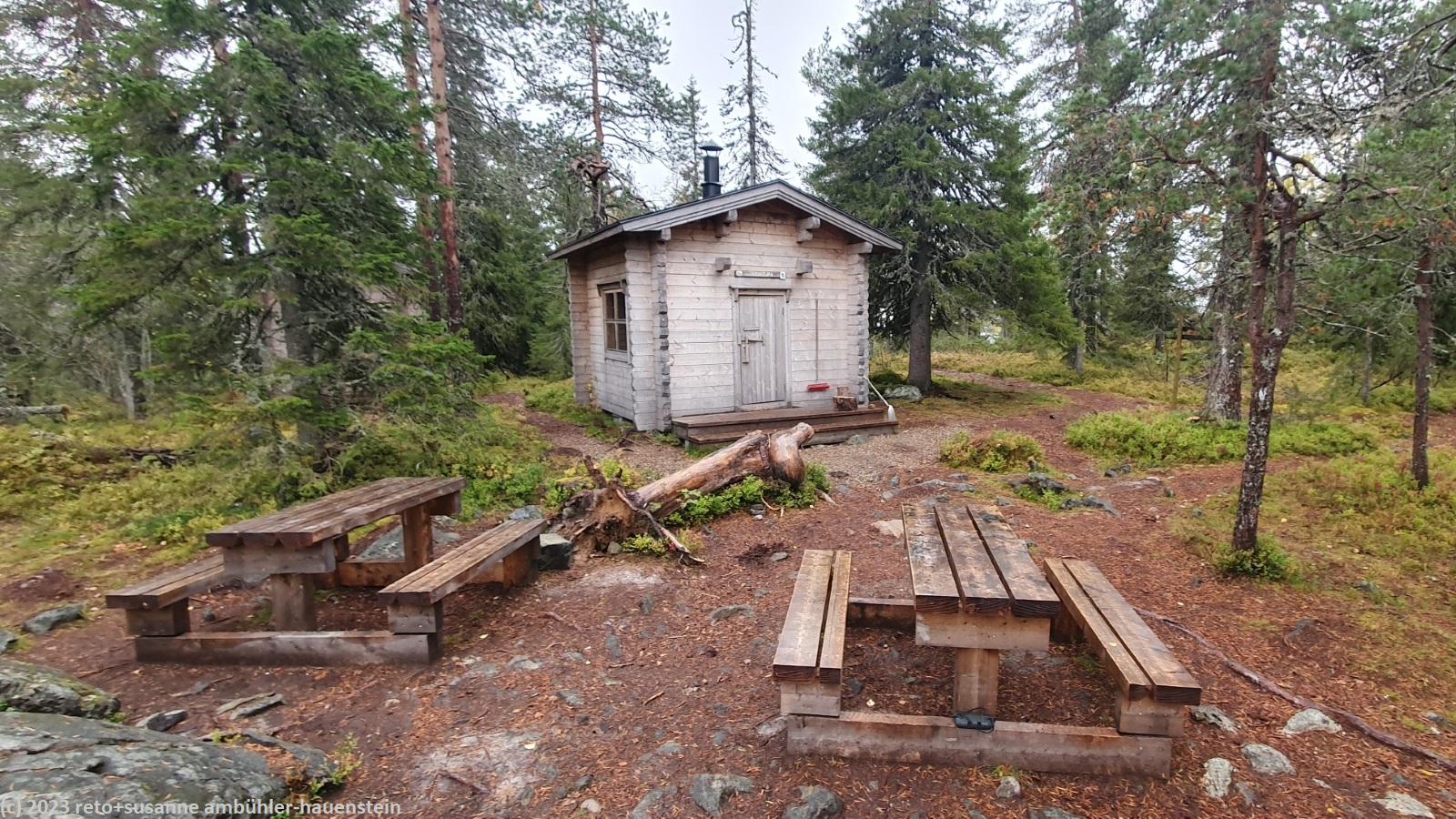 nach dem frühstück fahren wir erst 15 km nordwärts und besuchen in kuusamo die touristen information. wir finden allerdings keine braucbare broschüre zu unserem heutigen ziel, dem syöte nationalpark. nachdem wir unseren wagen aufgetankt haben geht es auf der strasse 20 westwärts. beim koitijärvi folgen wir dem vorschlag des navi und nehmen die unbefestigte strasse 8631 zur strasse 863. kurz nach 12:20 uhr sind wir bei unserem tagesziel. der campingplatz hat eine selbstregistrierung via eine website, das klappt auf anhieb. per SMS erhalten wir den zugangscode für die schranke und den sanitärbereich. letzterer ist überraschend modern mit tollen saunen. nach dem mittagessen besuchen wir erst das restaurant am fuss des skigebietes, danach unternehmen wir bei regnerischem wetter im nationalpark eine rundwanderung über den teerivaara. nach dem nachtessen verbringen wir einen gemütlichen abend im jogi und sind kurz vor mitternacht im bett.