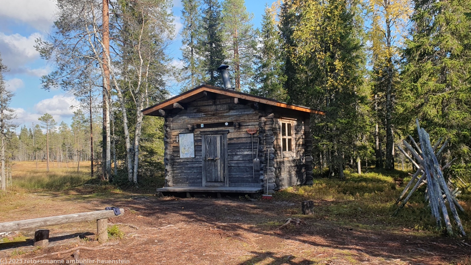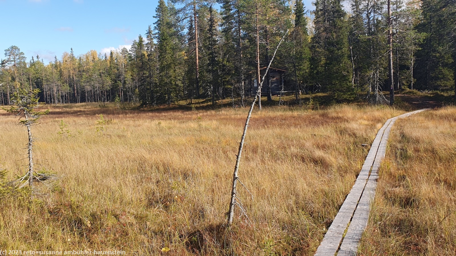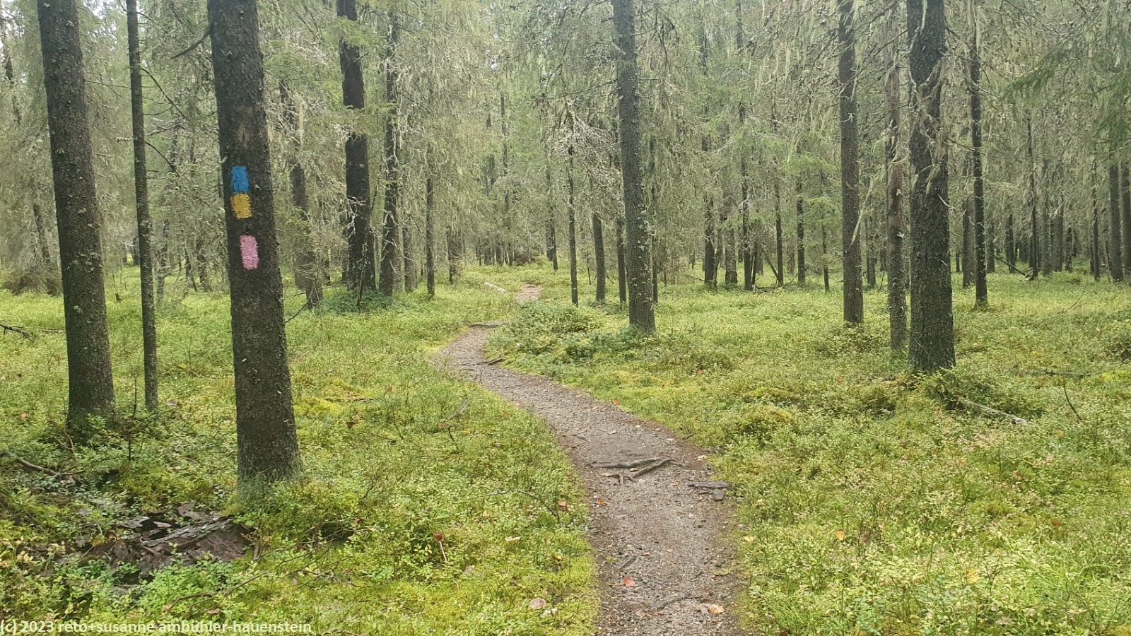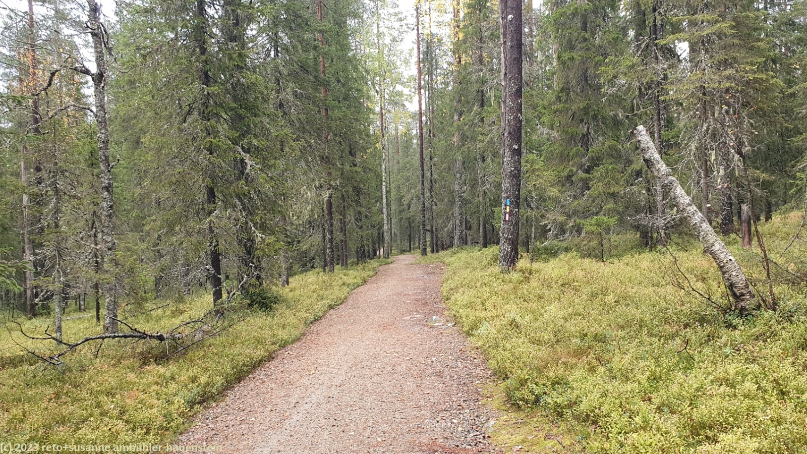 in der nacht hat es geregnet und auch als wir um 8 uhr aufstehen, ist der himmel immer noch bedeckt. es zeichnet sich aber schon bald ab, dass es hoffnung gibt, dass es im laufe des tages sonnig wird. es ist deutlich wärmer als in den vergangenen tagen. nach dem frühstück schultern wir den rucksack und machen uns auf den weg zur voraussichtlich letzten wanderung dieser reise. am visitor center vorbei nehmen wir die etwa 18 km lange rundwanderung ahmankierros in angriff. der pfad führt meistens durch einen schönen wald und ist gut markiert. auf dem weg zum ersten zwischenziel - der schutzhütte annintupa - holen wir zwei ältere frauen ein. sie sind beide mit einem eimer unterwegs und wir fragen uns, was sie wohl suchen. bei der schutzhütte muss susanne austreten. die beiden frauen holen uns wieder ein und die eine meint auf deutsch, ich sei mit meinen kurzen hosen und dem kurzarm t-shirt etwas wenig warm angezogen. ich kann da nicht zustimmen, denn es fühlt sich heute wirklich warm an. auf meine frage erklären sie, dass sie "sumpfbeeren" suchen - wir würden sie wohl als "moltebeeren" bezeichnen. kurz nach der hütte hat es einen ausgedehnten sumpf und da schwärmen sie dann auch aus. wir bleiben auf dem holzsteg. kurz nach 11 uhr erreichen wir die nächste hütte, koiratupa. nun schwenkt der weg richtung nordwesten. wir gehen weiterhin durch einen wunderschönen, manchmal ziemlich wilden wald. der pfad ist gelegentlich etwas nass, grundsätzlich aber in sehr gutem zustand. bei sumpfigen passagen hat es entweder holzplanken, oder aber der weg wurde mit einer dicken schicht aus kies bedeckt. es fühlt sich komisch an, auf dem weichen kies zu laufen. um 12 uhr erreichen wir eine weitere hütte. ahmatupa ist eine grössere unterkunft, die türen sind aber alle abgeschlossen. wenn ich es richtig verstehe, so muss man im visitor center einen schlüssel abholen, was wohl nicht kostenlos ist. soweit wir durch die fenster erkennen können, ist die hütte sehr hübsch eingerichtet. nun müssen wir uns entscheiden, ob wir noch den etwa 2 km langen abstecher zum aussichtsturm machen wollen oder nicht. wenn wir das tun, so werden wir erst nach 16 uhr zurück und das visitor center wird geschlossen sein. wir verzichten auf den abstecher und folgen dem weg nun südwärts. kurz vor 13 uhr erreichen wir ylipatupa, die schutzhütte nummer vier.