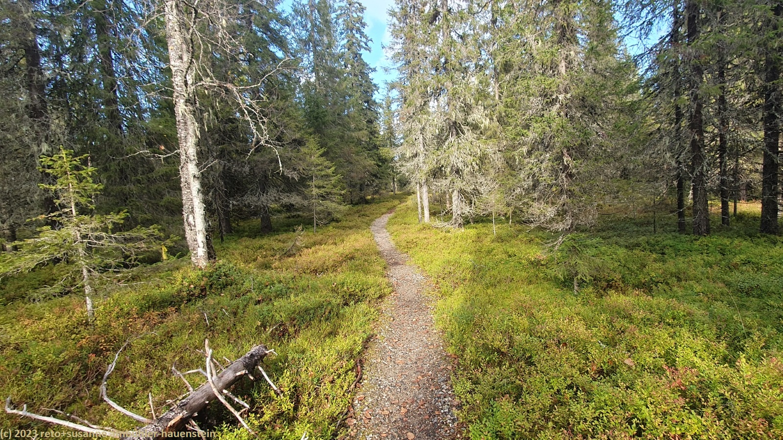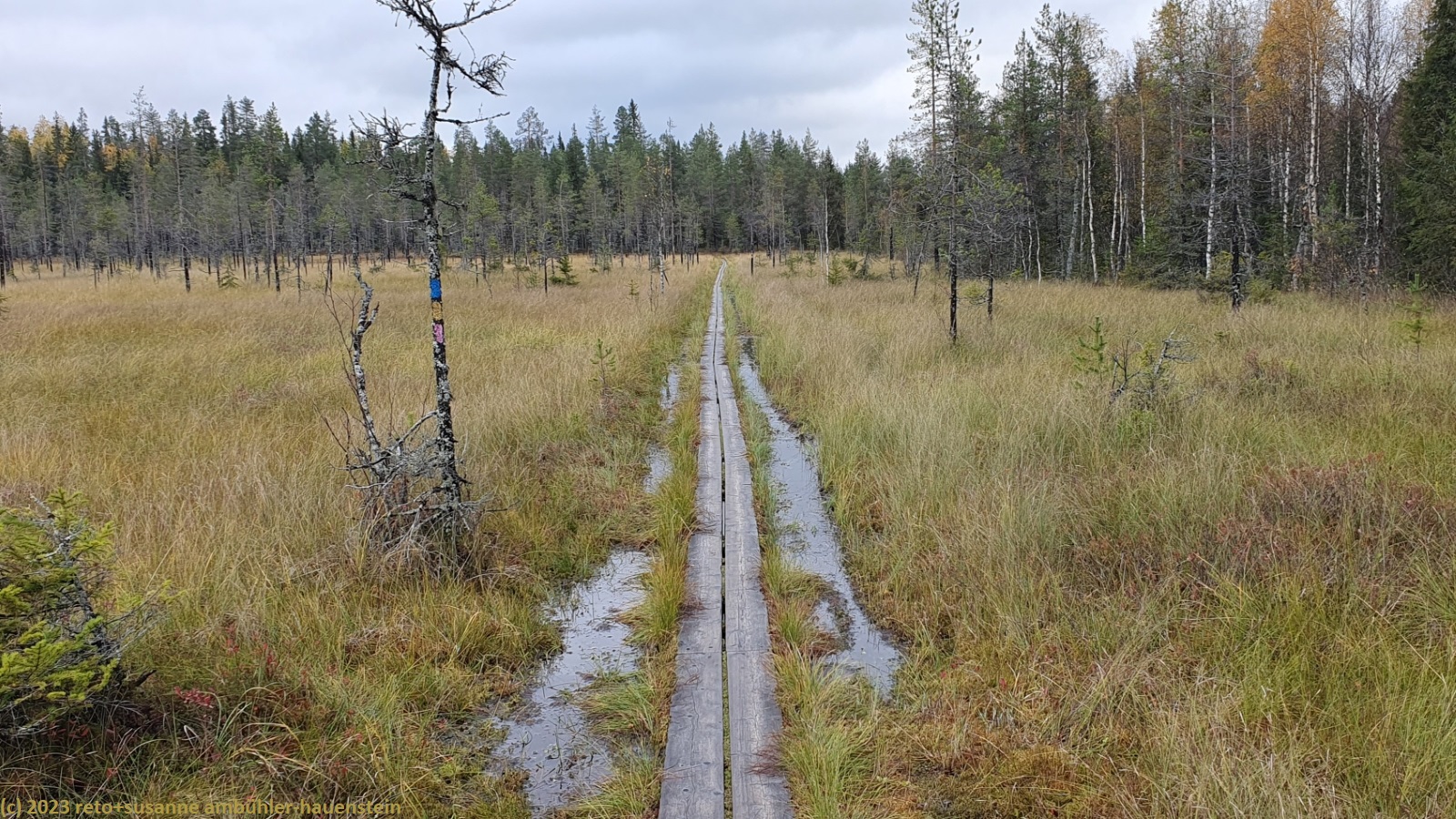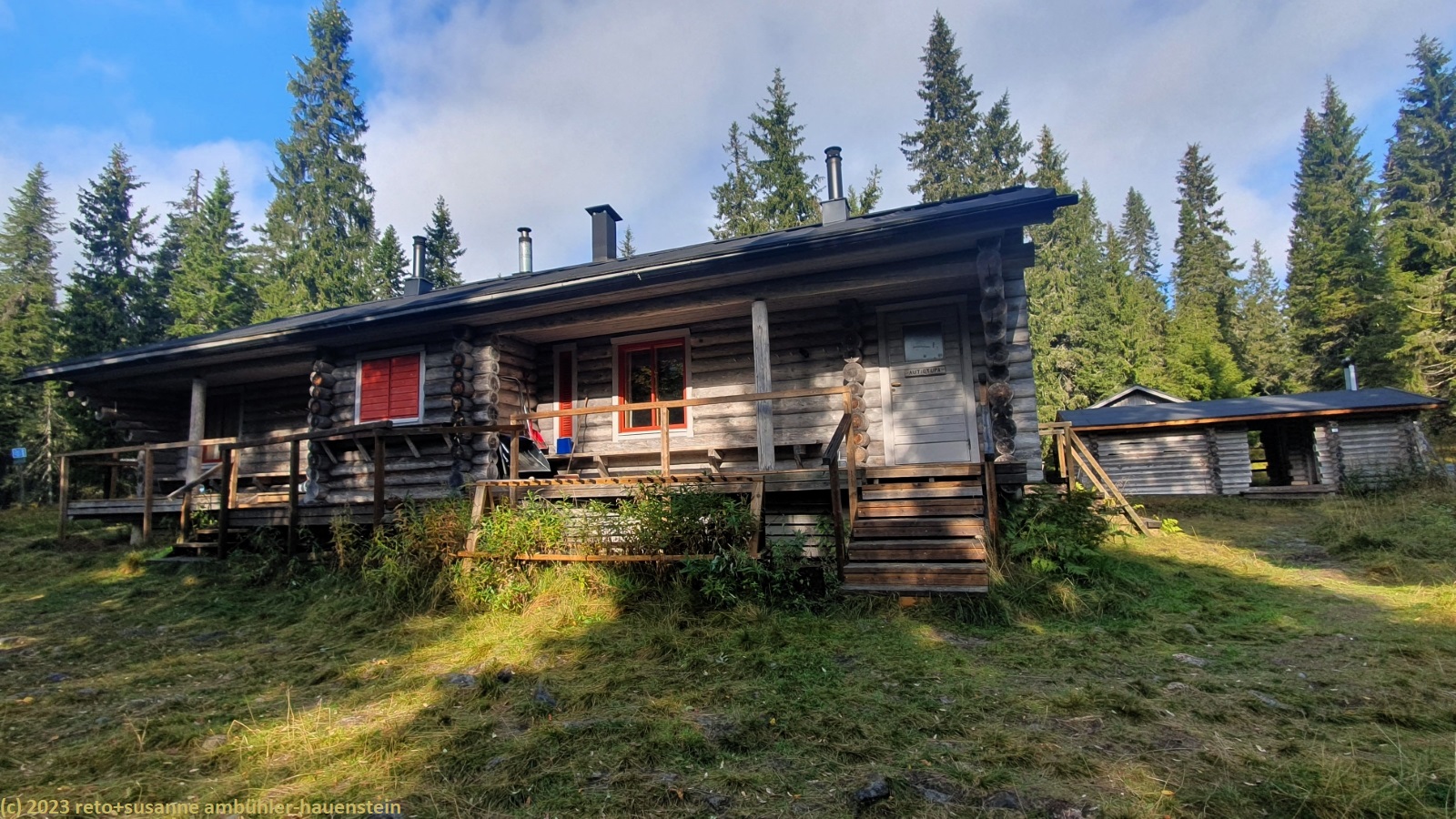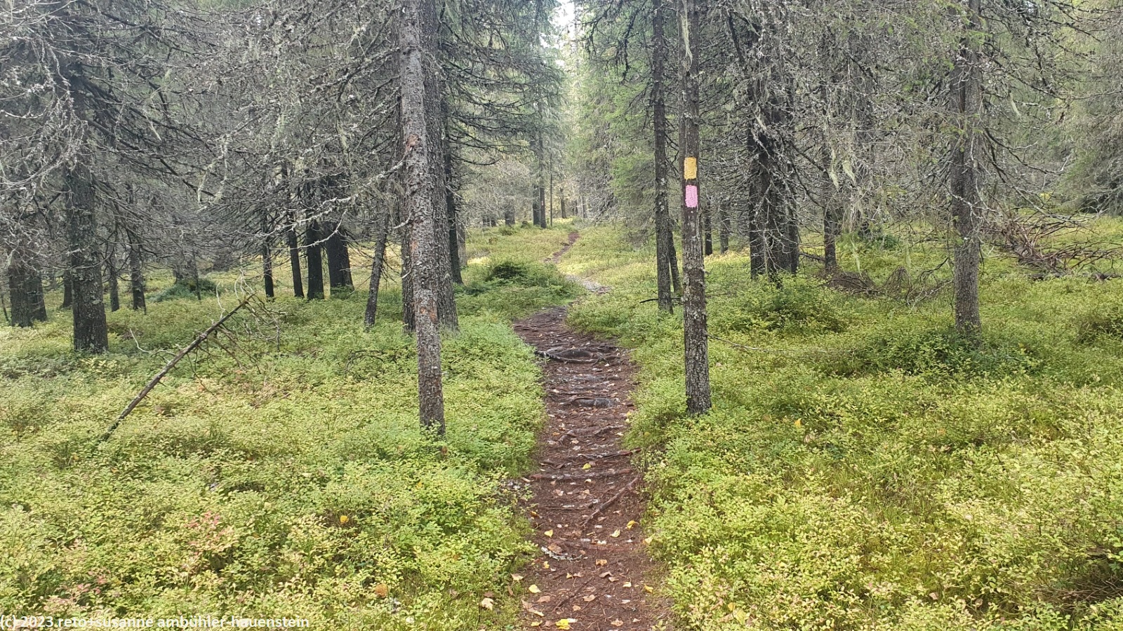 in der nacht hat es geregnet und auch als wir um 8 uhr aufstehen, ist der himmel immer noch bedeckt. es zeichnet sich aber schon bald ab, dass es hoffnung gibt, dass es im laufe des tages sonnig wird. es ist deutlich wärmer als in den vergangenen tagen. nach dem frühstück schultern wir den rucksack und machen uns auf den weg zur voraussichtlich letzten wanderung dieser reise. am visitor center vorbei nehmen wir die etwa 18 km lange rundwanderung ahmankierros in angriff. der pfad führt meistens durch einen schönen wald und ist gut markiert. auf dem weg zum ersten zwischenziel - der schutzhütte annintupa - holen wir zwei ältere frauen ein. sie sind beide mit einem eimer unterwegs und wir fragen uns, was sie wohl suchen. bei der schutzhütte muss susanne austreten. die beiden frauen holen uns wieder ein und die eine meint auf deutsch, ich sei mit meinen kurzen hosen und dem kurzarm t-shirt etwas wenig warm angezogen. ich kann da nicht zustimmen, denn es fühlt sich heute wirklich warm an. auf meine frage erklären sie, dass sie "sumpfbeeren" suchen - wir würden sie wohl als "moltebeeren" bezeichnen. kurz nach der hütte hat es einen ausgedehnten sumpf und da schwärmen sie dann auch aus. wir bleiben auf dem holzsteg. kurz nach 11 uhr erreichen wir die nächste hütte, koiratupa. nun schwenkt der weg richtung nordwesten. wir gehen weiterhin durch einen wunderschönen, manchmal ziemlich wilden wald. der pfad ist gelegentlich etwas nass, grundsätzlich aber in sehr gutem zustand. bei sumpfigen passagen hat es entweder holzplanken, oder aber der weg wurde mit einer dicken schicht aus kies bedeckt. es fühlt sich komisch an, auf dem weichen kies zu laufen. um 12 uhr erreichen wir eine weitere hütte. ahmatupa ist eine grössere unterkunft, die türen sind aber alle abgeschlossen. wenn ich es richtig verstehe, so muss man im visitor center einen schlüssel abholen, was wohl nicht kostenlos ist. soweit wir durch die fenster erkennen können, ist die hütte sehr hübsch eingerichtet. nun müssen wir uns entscheiden, ob wir noch den etwa 2 km langen abstecher zum aussichtsturm machen wollen oder nicht. wenn wir das tun, so werden wir erst nach 16 uhr zurück und das visitor center wird geschlossen sein. wir verzichten auf den abstecher und folgen dem weg nun südwärts. kurz vor 13 uhr erreichen wir ylipatupa, die schutzhütte nummer vier.