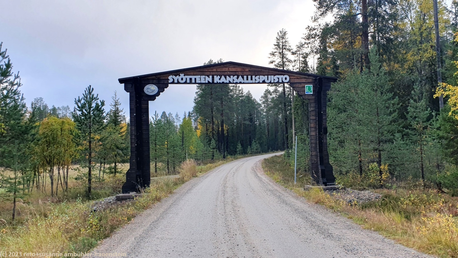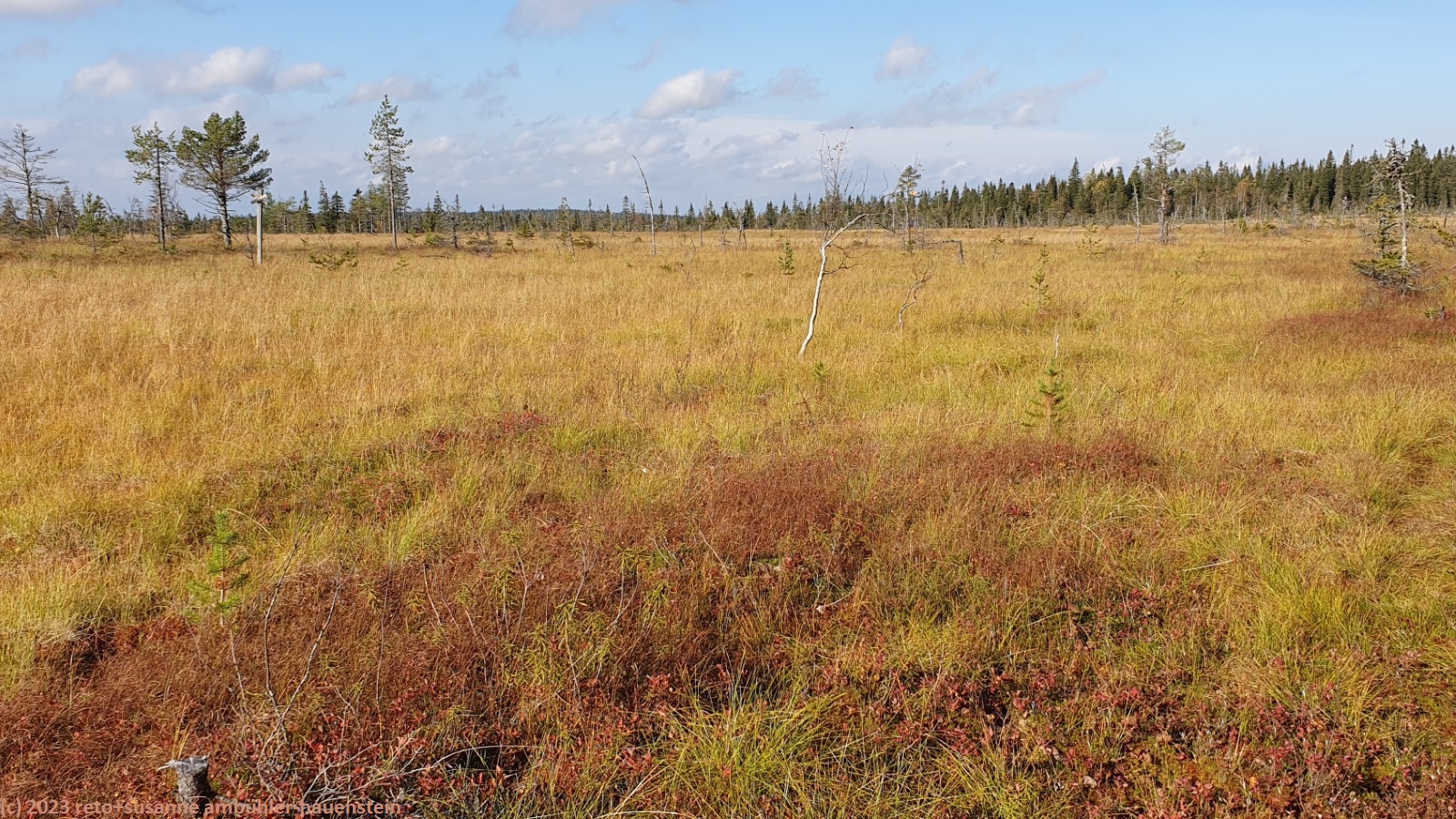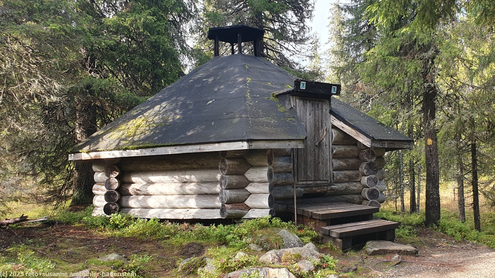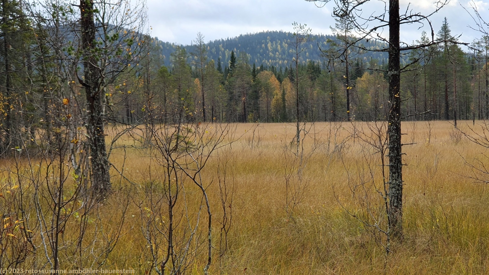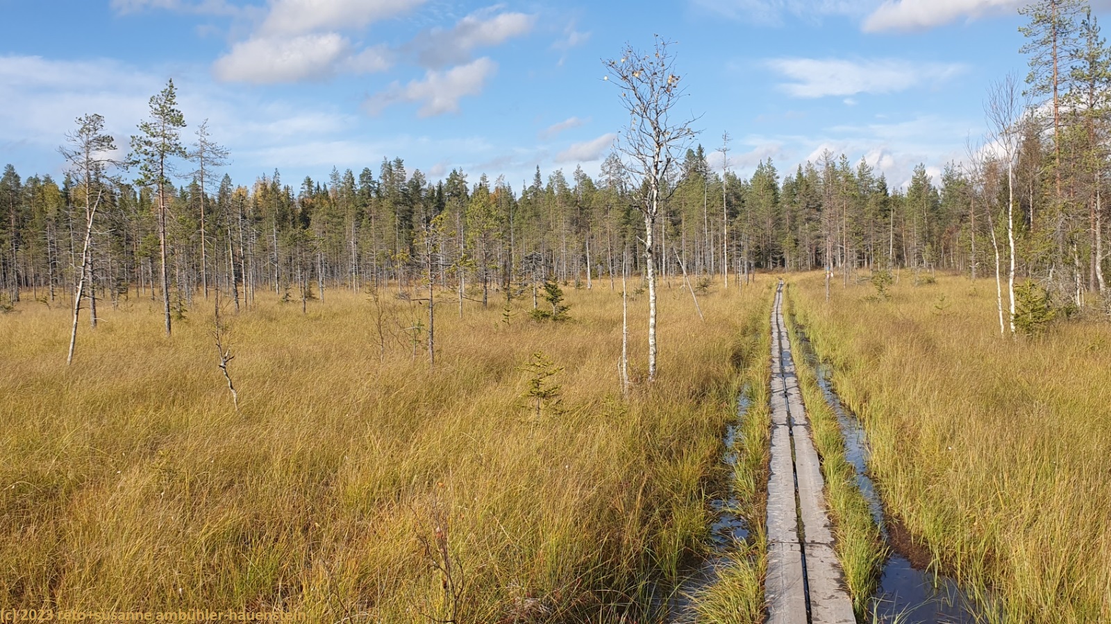 in der nacht hat es geregnet und auch als wir um 8 uhr aufstehen, ist der himmel immer noch bedeckt. es zeichnet sich aber schon bald ab, dass es hoffnung gibt, dass es im laufe des tages sonnig wird. es ist deutlich wärmer als in den vergangenen tagen. nach dem frühstück schultern wir den rucksack und machen uns auf den weg zur voraussichtlich letzten wanderung dieser reise. am visitor center vorbei nehmen wir die etwa 18 km lange rundwanderung ahmankierros in angriff. der pfad führt meistens durch einen schönen wald und ist gut markiert. auf dem weg zum ersten zwischenziel - der schutzhütte annintupa - holen wir zwei ältere frauen ein. sie sind beide mit einem eimer unterwegs und wir fragen uns, was sie wohl suchen. bei der schutzhütte muss susanne austreten. die beiden frauen holen uns wieder ein und die eine meint auf deutsch, ich sei mit meinen kurzen hosen und dem kurzarm t-shirt etwas wenig warm angezogen. ich kann da nicht zustimmen, denn es fühlt sich heute wirklich warm an. auf meine frage erklären sie, dass sie "sumpfbeeren" suchen - wir würden sie wohl als "moltebeeren" bezeichnen. kurz nach der hütte hat es einen ausgedehnten sumpf und da schwärmen sie dann auch aus. wir bleiben auf dem holzsteg. kurz nach 11 uhr erreichen wir die nächste hütte, koiratupa. nun schwenkt der weg richtung nordwesten. wir gehen weiterhin durch einen wunderschönen, manchmal ziemlich wilden wald. der pfad ist gelegentlich etwas nass, grundsätzlich aber in sehr gutem zustand. bei sumpfigen passagen hat es entweder holzplanken, oder aber der weg wurde mit einer dicken schicht aus kies bedeckt. es fühlt sich komisch an, auf dem weichen kies zu laufen. um 12 uhr erreichen wir eine weitere hütte. ahmatupa ist eine grössere unterkunft, die türen sind aber alle abgeschlossen. wenn ich es richtig verstehe, so muss man im visitor center einen schlüssel abholen, was wohl nicht kostenlos ist. soweit wir durch die fenster erkennen können, ist die hütte sehr hübsch eingerichtet. nun müssen wir uns entscheiden, ob wir noch den etwa 2 km langen abstecher zum aussichtsturm machen wollen oder nicht. wenn wir das tun, so werden wir erst nach 16 uhr zurück und das visitor center wird geschlossen sein. wir verzichten auf den abstecher und folgen dem weg nun südwärts. kurz vor 13 uhr erreichen wir ylipatupa, die schutzhütte nummer vier.