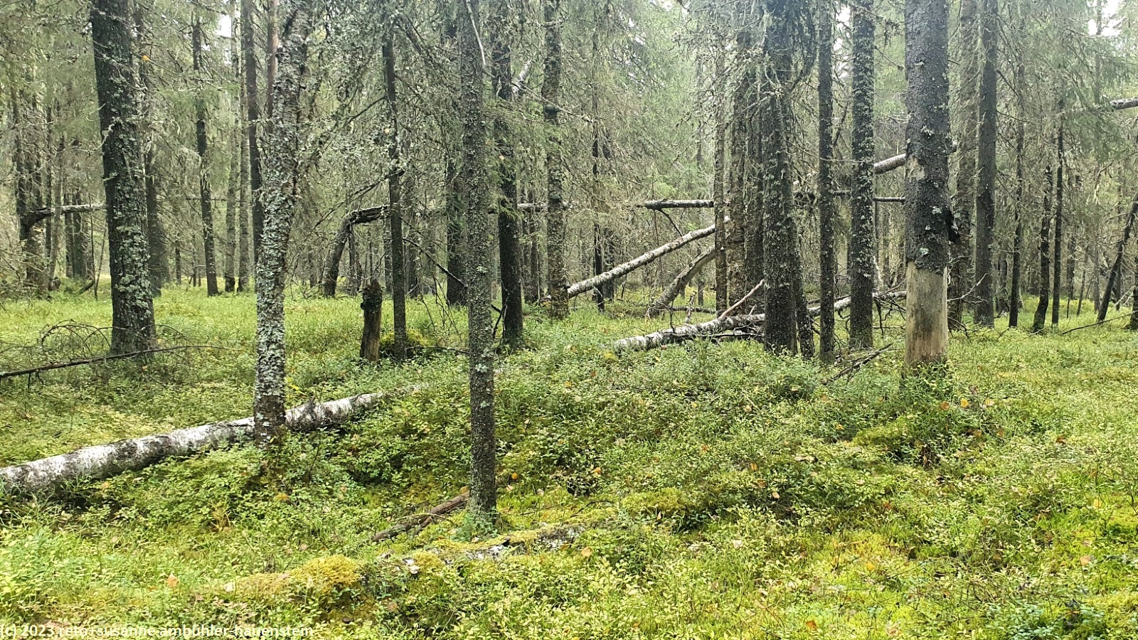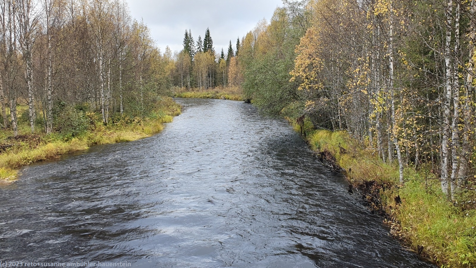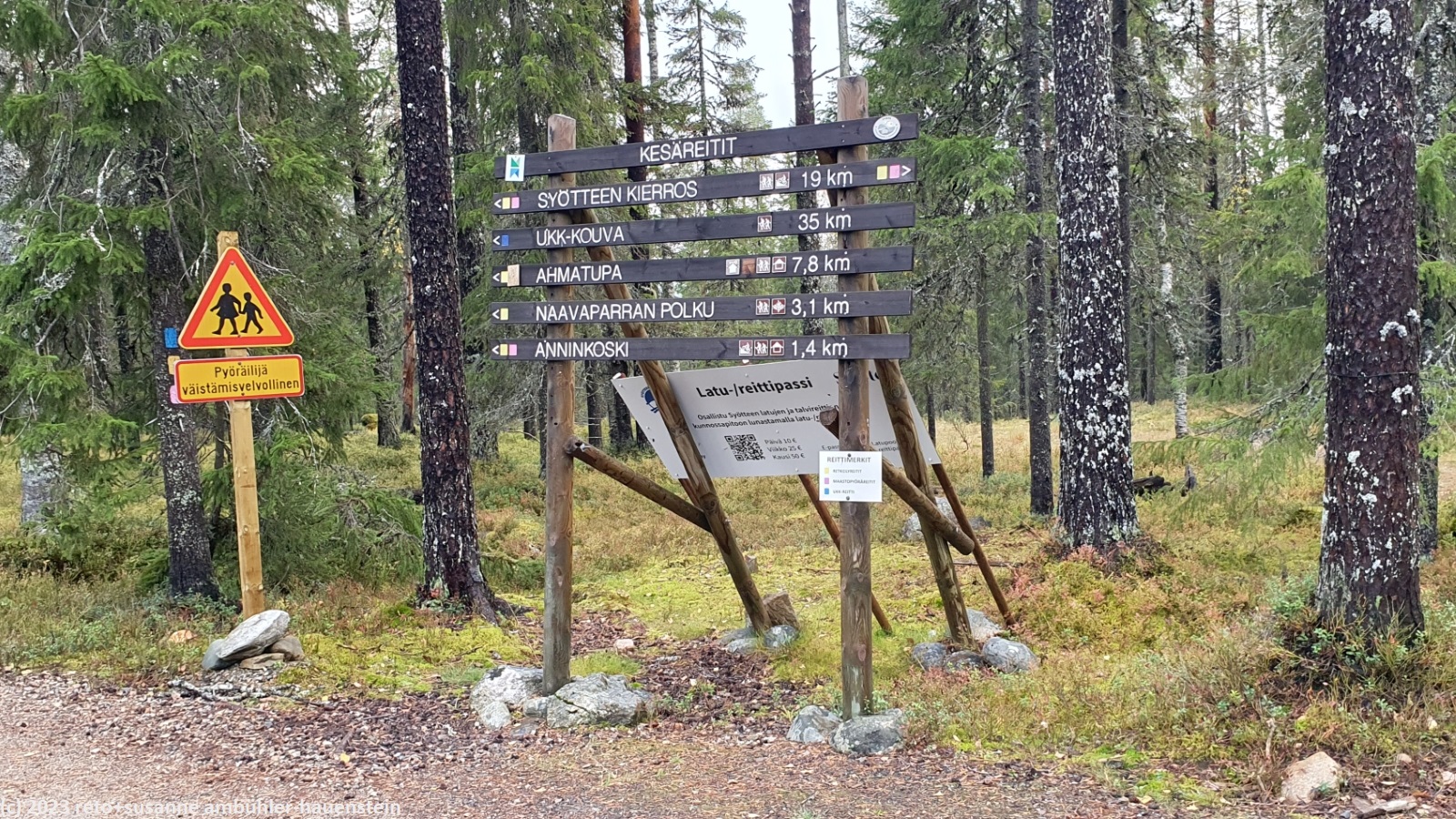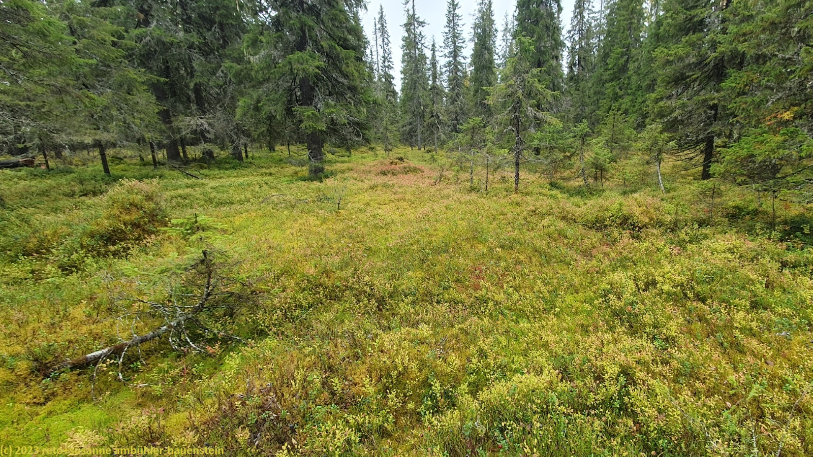 in der nacht hat es geregnet und auch als wir um 8 uhr aufstehen, ist der himmel immer noch bedeckt. es zeichnet sich aber schon bald ab, dass es hoffnung gibt, dass es im laufe des tages sonnig wird. es ist deutlich wärmer als in den vergangenen tagen. nach dem frühstück schultern wir den rucksack und machen uns auf den weg zur voraussichtlich letzten wanderung dieser reise. am visitor center vorbei nehmen wir die etwa 18 km lange rundwanderung ahmankierros in angriff. der pfad führt meistens durch einen schönen wald und ist gut markiert. auf dem weg zum ersten zwischenziel - der schutzhütte annintupa - holen wir zwei ältere frauen ein. sie sind beide mit einem eimer unterwegs und wir fragen uns, was sie wohl suchen. bei der schutzhütte muss susanne austreten. die beiden frauen holen uns wieder ein und die eine meint auf deutsch, ich sei mit meinen kurzen hosen und dem kurzarm t-shirt etwas wenig warm angezogen. ich kann da nicht zustimmen, denn es fühlt sich heute wirklich warm an. auf meine frage erklären sie, dass sie "sumpfbeeren" suchen - wir würden sie wohl als "moltebeeren" bezeichnen. kurz nach der hütte hat es einen ausgedehnten sumpf und da schwärmen sie dann auch aus. wir bleiben auf dem holzsteg. kurz nach 11 uhr erreichen wir die nächste hütte, koiratupa. nun schwenkt der weg richtung nordwesten. wir gehen weiterhin durch einen wunderschönen, manchmal ziemlich wilden wald. der pfad ist gelegentlich etwas nass, grundsätzlich aber in sehr gutem zustand. bei sumpfigen passagen hat es entweder holzplanken, oder aber der weg wurde mit einer dicken schicht aus kies bedeckt. es fühlt sich komisch an, auf dem weichen kies zu laufen. um 12 uhr erreichen wir eine weitere hütte. ahmatupa ist eine grössere unterkunft, die türen sind aber alle abgeschlossen. wenn ich es richtig verstehe, so muss man im visitor center einen schlüssel abholen, was wohl nicht kostenlos ist. soweit wir durch die fenster erkennen können, ist die hütte sehr hübsch eingerichtet. nun müssen wir uns entscheiden, ob wir noch den etwa 2 km langen abstecher zum aussichtsturm machen wollen oder nicht. wenn wir das tun, so werden wir erst nach 16 uhr zurück und das visitor center wird geschlossen sein. wir verzichten auf den abstecher und folgen dem weg nun südwärts. kurz vor 13 uhr erreichen wir ylipatupa, die schutzhütte nummer vier.