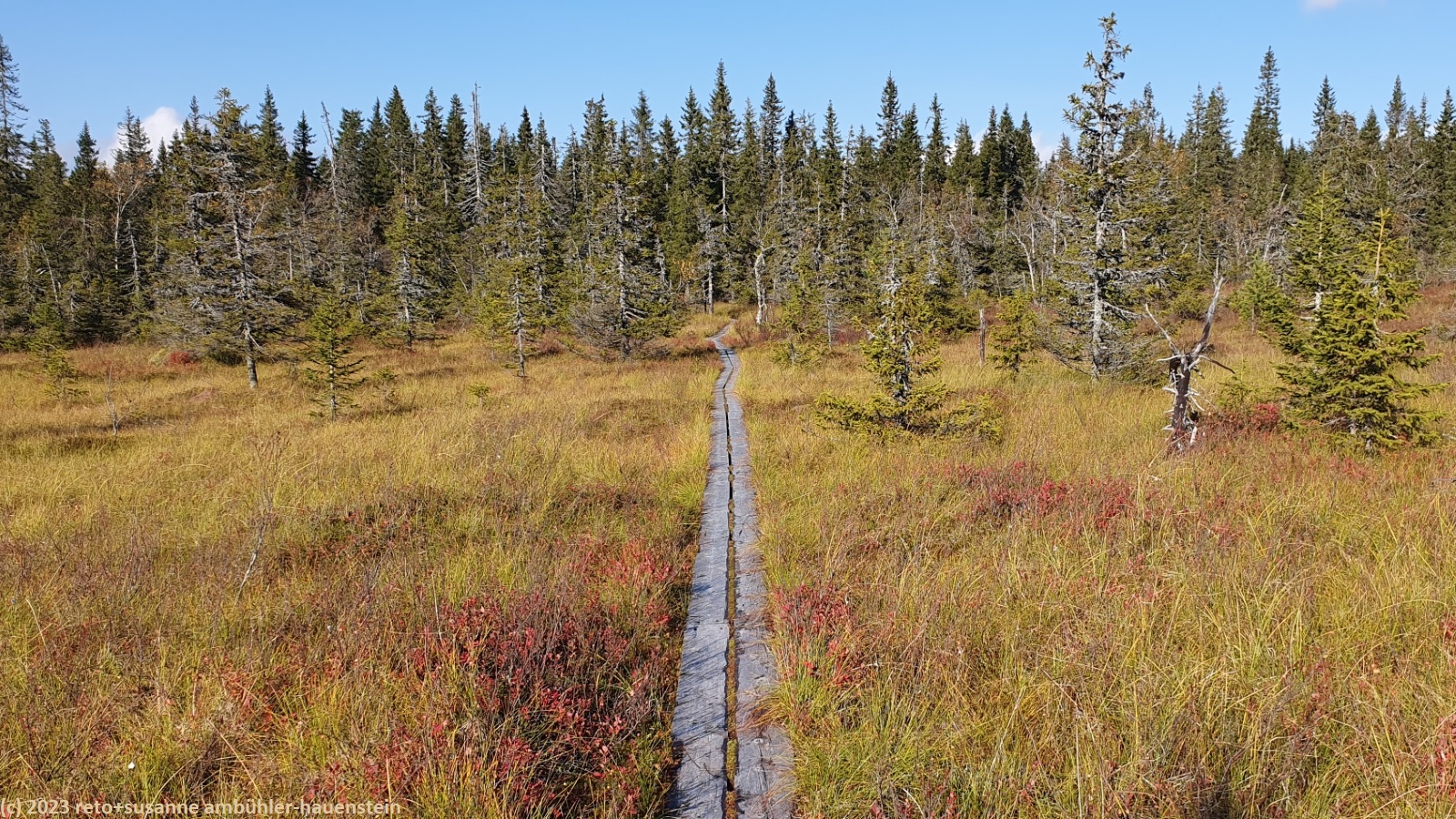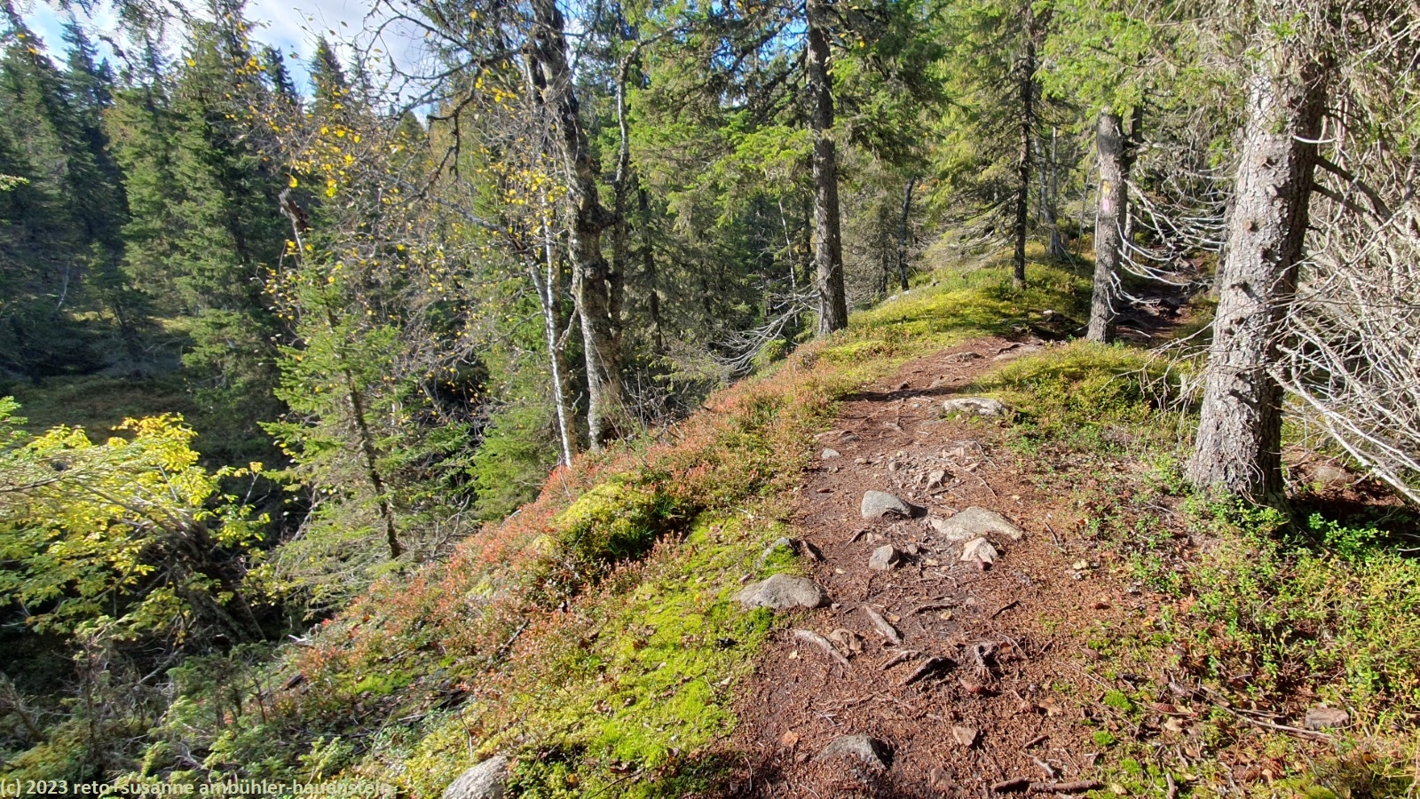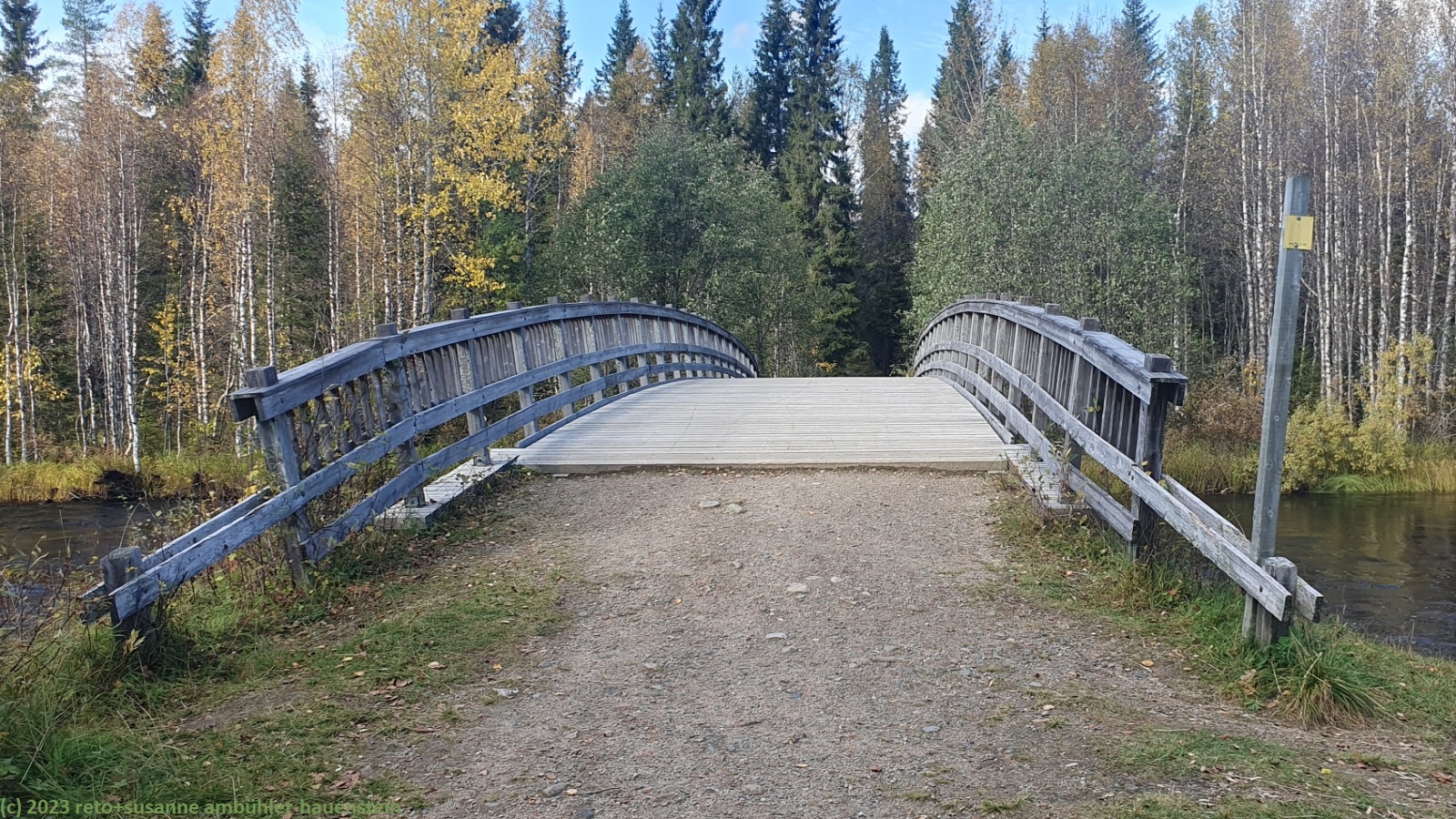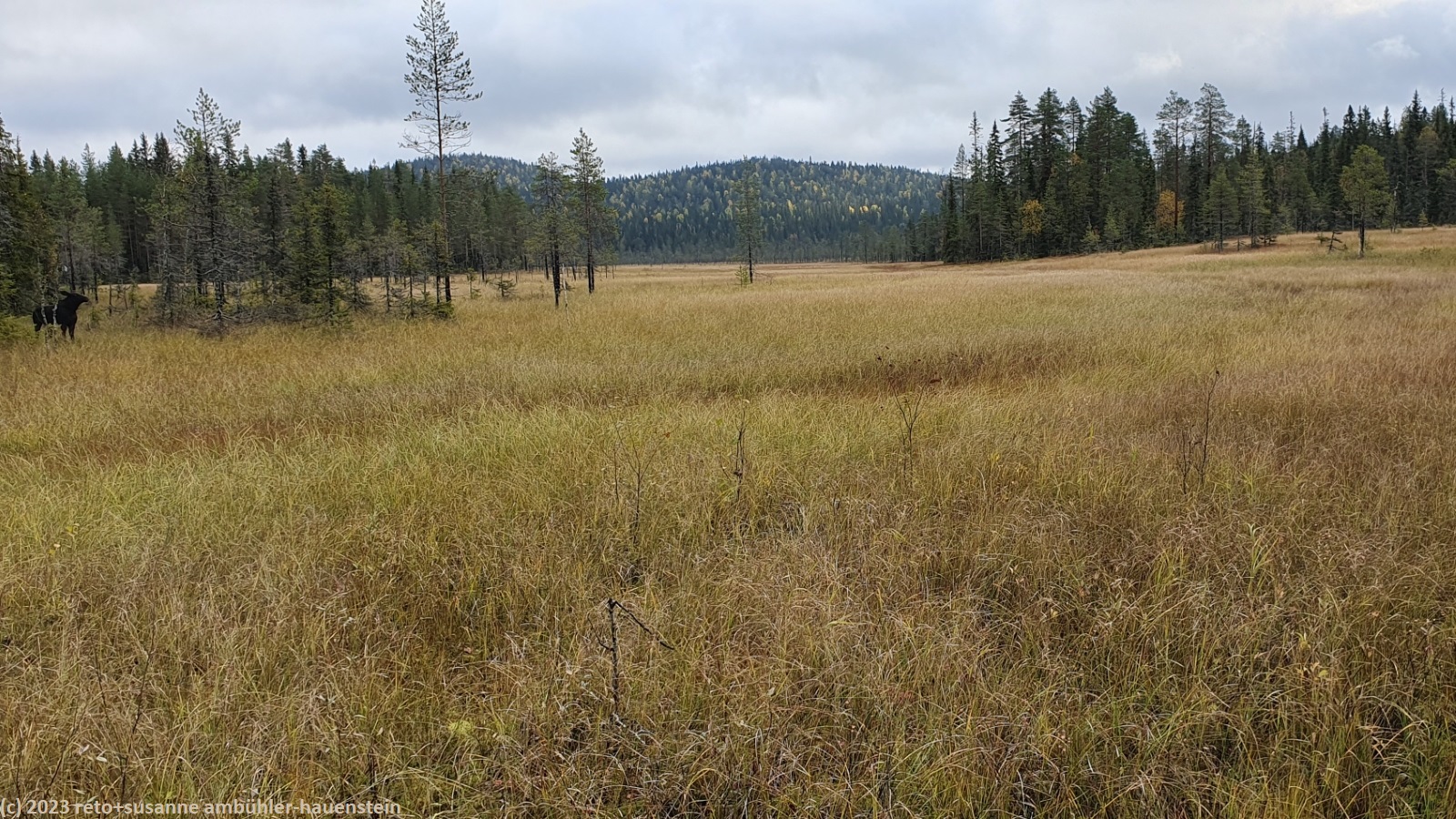 in der nacht hat es geregnet und auch als wir um 8 uhr aufstehen, ist der himmel immer noch bedeckt. es zeichnet sich aber schon bald ab, dass es hoffnung gibt, dass es im laufe des tages sonnig wird. es ist deutlich wärmer als in den vergangenen tagen. nach dem frühstück schultern wir den rucksack und machen uns auf den weg zur voraussichtlich letzten wanderung dieser reise. am visitor center vorbei nehmen wir die etwa 18 km lange rundwanderung ahmankierros in angriff. der pfad führt meistens durch einen schönen wald und ist gut markiert. auf dem weg zum ersten zwischenziel - der schutzhütte annintupa - holen wir zwei ältere frauen ein. sie sind beide mit einem eimer unterwegs und wir fragen uns, was sie wohl suchen. bei der schutzhütte muss susanne austreten. die beiden frauen holen uns wieder ein und die eine meint auf deutsch, ich sei mit meinen kurzen hosen und dem kurzarm t-shirt etwas wenig warm angezogen. ich kann da nicht zustimmen, denn es fühlt sich heute wirklich warm an. auf meine frage erklären sie, dass sie "sumpfbeeren" suchen - wir würden sie wohl als "moltebeeren" bezeichnen. kurz nach der hütte hat es einen ausgedehnten sumpf und da schwärmen sie dann auch aus. wir bleiben auf dem holzsteg. kurz nach 11 uhr erreichen wir die nächste hütte, koiratupa. nun schwenkt der weg richtung nordwesten. wir gehen weiterhin durch einen wunderschönen, manchmal ziemlich wilden wald. der pfad ist gelegentlich etwas nass, grundsätzlich aber in sehr gutem zustand. bei sumpfigen passagen hat es entweder holzplanken, oder aber der weg wurde mit einer dicken schicht aus kies bedeckt. es fühlt sich komisch an, auf dem weichen kies zu laufen. um 12 uhr erreichen wir eine weitere hütte. ahmatupa ist eine grössere unterkunft, die türen sind aber alle abgeschlossen. wenn ich es richtig verstehe, so muss man im visitor center einen schlüssel abholen, was wohl nicht kostenlos ist. soweit wir durch die fenster erkennen können, ist die hütte sehr hübsch eingerichtet. nun müssen wir uns entscheiden, ob wir noch den etwa 2 km langen abstecher zum aussichtsturm machen wollen oder nicht. wenn wir das tun, so werden wir erst nach 16 uhr zurück und das visitor center wird geschlossen sein. wir verzichten auf den abstecher und folgen dem weg nun südwärts. kurz vor 13 uhr erreichen wir ylipatupa, die schutzhütte nummer vier.