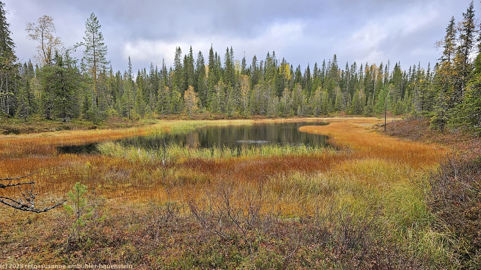 trotz bedecktem himmel ist es deutlich wärmer als in den vergangenen tagen. nach dem frühstück nehmen wir den etwa 18 km langen rundwanderweg ahmankierros im syöte nationalpark unter die füsse. dieser führt uns durch wunderschöne wälder und durch ausgedehnte sumpfgebiete. gegen mittag erreichen wir mit der sehr hübschen ahmatupa den nördlichsten punkt unserer wanderung. eine stunde später sind wir bei der ylipatupa am östlichen rand des ausgedehnten matosuo. im laufe des tages ist das wetter freundlicher geworden, aber während wir picknicken, verdecken oft wolken die sonne. auf dem rückweg zum visitor center wird es dann aber nochmals richtig sonnig. nach einer kurzen erfrischung haben wir noch energie, um eine der skipisten zum iso-syöte hinauf zu erklimmen und die tolle aussicht zu geniessen. zurück beim jogi machen wir eine sitzung in der sauna. nach dem nachtessen gibt es noch einen polarlicht-alarm, aber heute tut sich gar nichts am nachthimmel. gegen 23:30 uhr sind wir im bett.