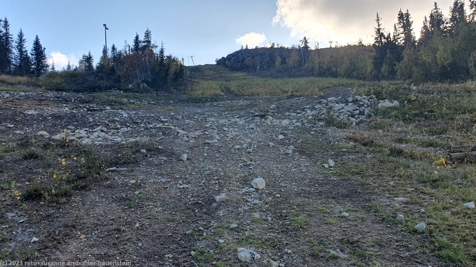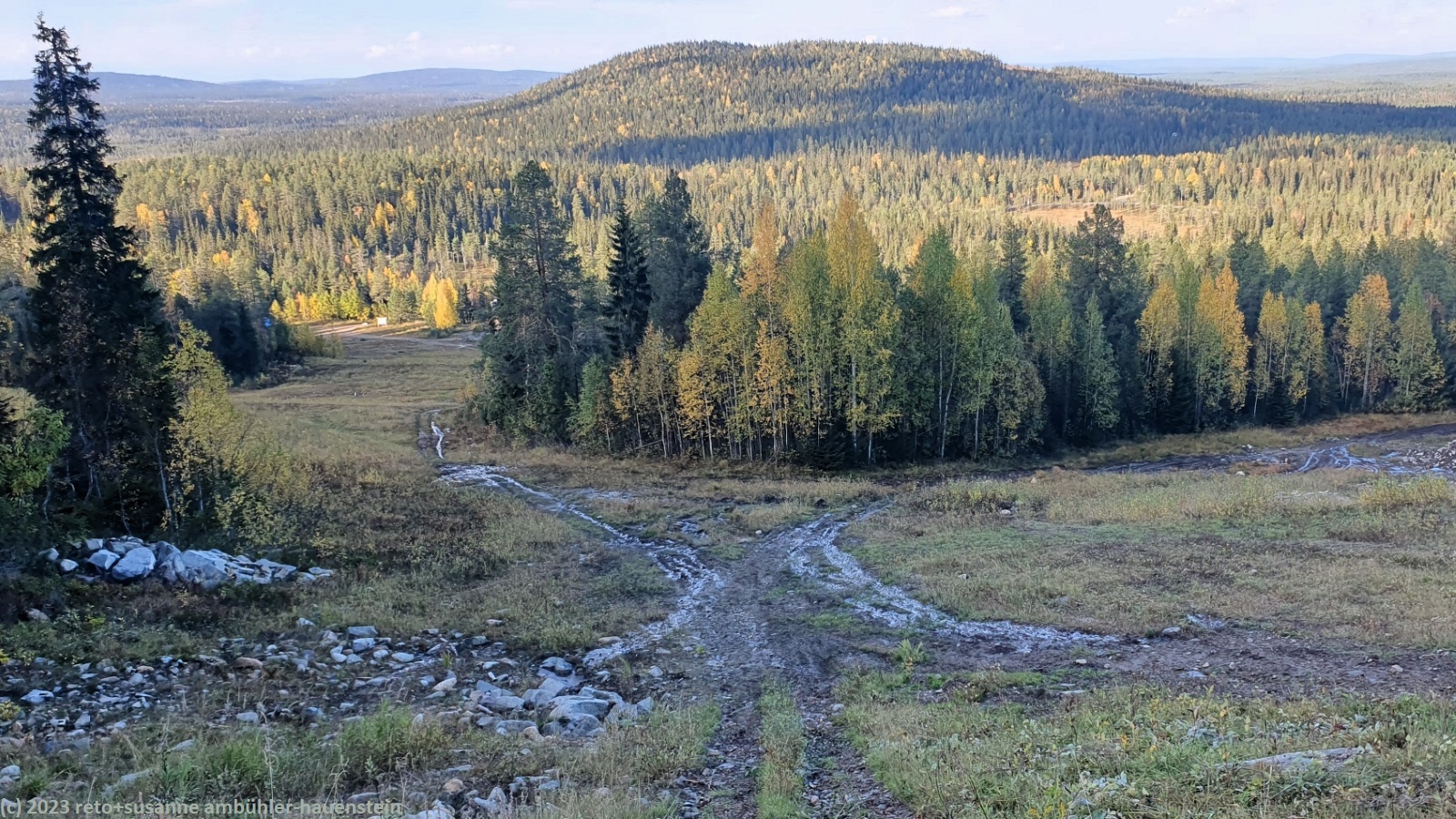 für den abstieg folgen wir anfangs einer der bikerpisten um dann auf der skipiste ins tal zu gelangen. wieder beim jogi gehen wir uns duschen und geniessen anschliessend eine sitzung in der sauna. danach ist es immer noch warm genug, um im t-shirt im freien zu sitzen. das nachtessen geniessen wir dann aber im jogi. anschliessend führe ich die bücher nach, susanne liest. um 21:45 uhr erhält susanne auf ihrem handy einen polarlicht-alarm. wir suchen daher eine dunkle stelle, um nach den lichtern ausschau zu halten. es ist schwierig, einen ort zu finden, wo es wenig licht hat, aber es ist offensichtlich, dass sich heute gar nichts tut am nachthimmel. zudem nimmt die bewölkung zu, bald sind keine sterne mehr zu sehen. ich sichte noch etwas unsere bilder, susanne hält nochmals nach polarlichter ausschau. gegen 23:30 uhr schlüpfen wir dann unter die bettdecke. heute ist es so warm, dass meine frau auf den schlafsack verzichten kann.