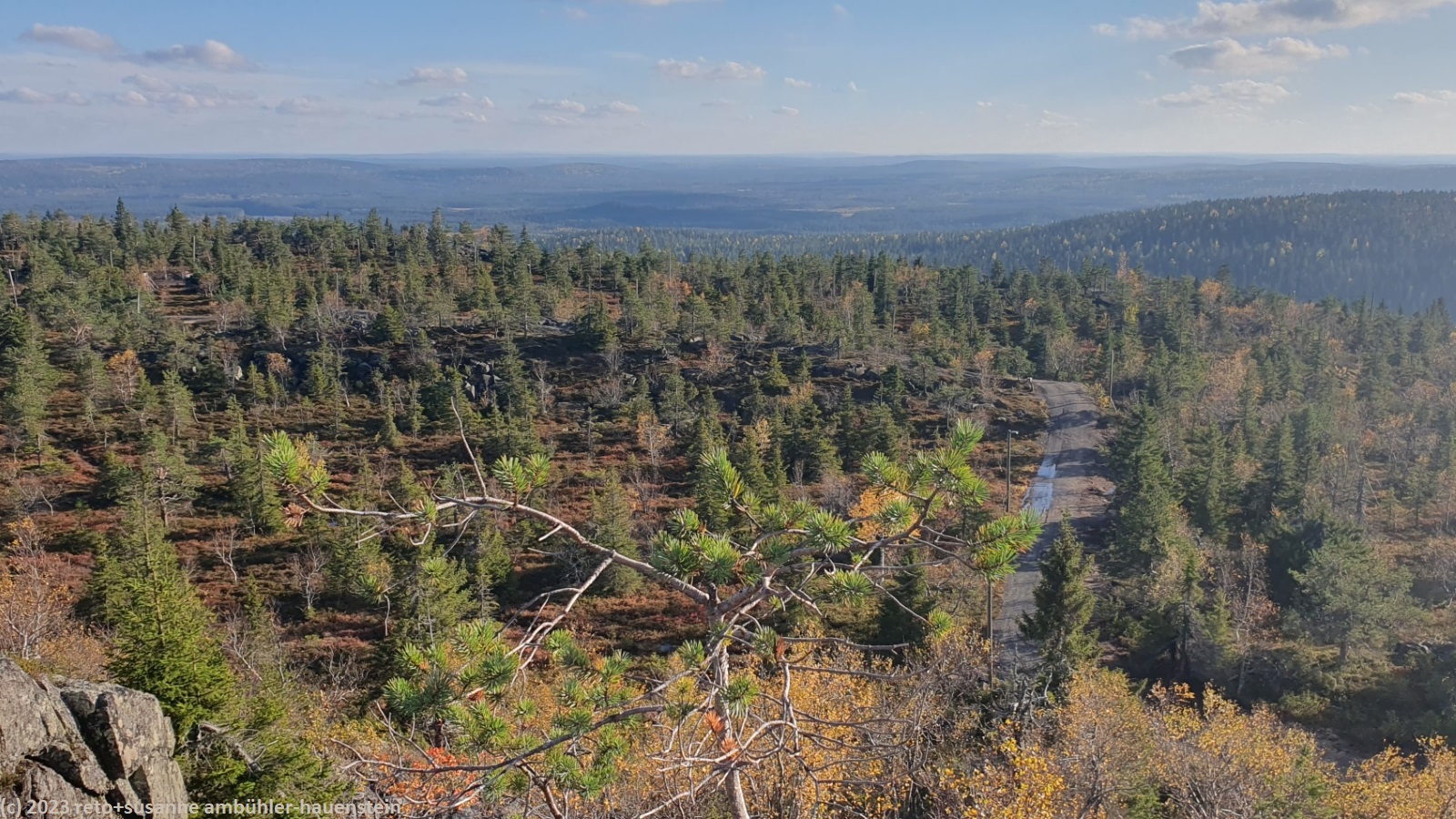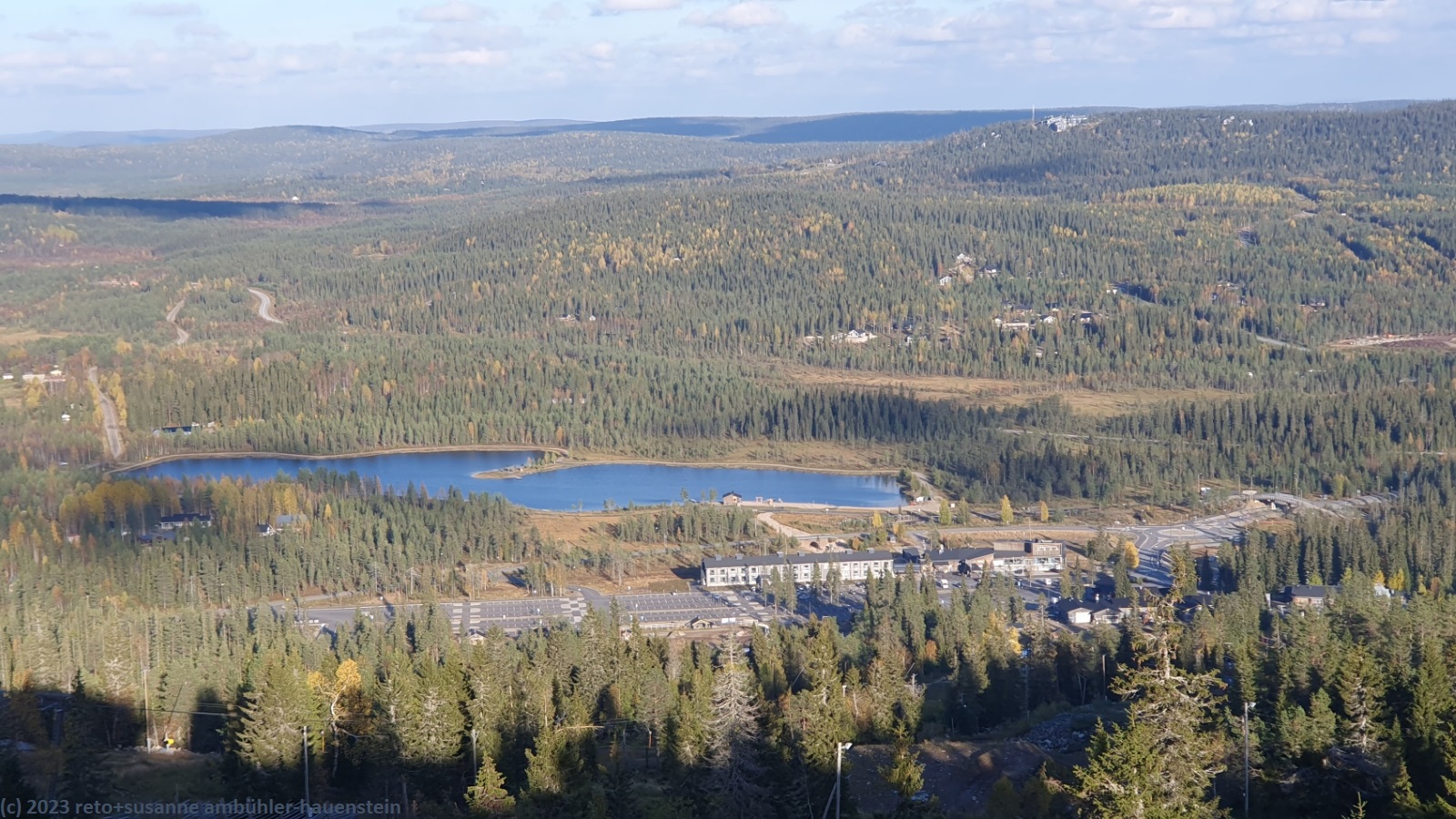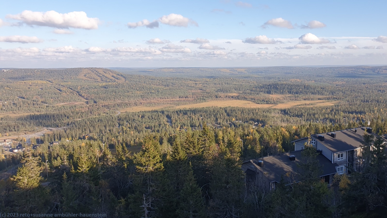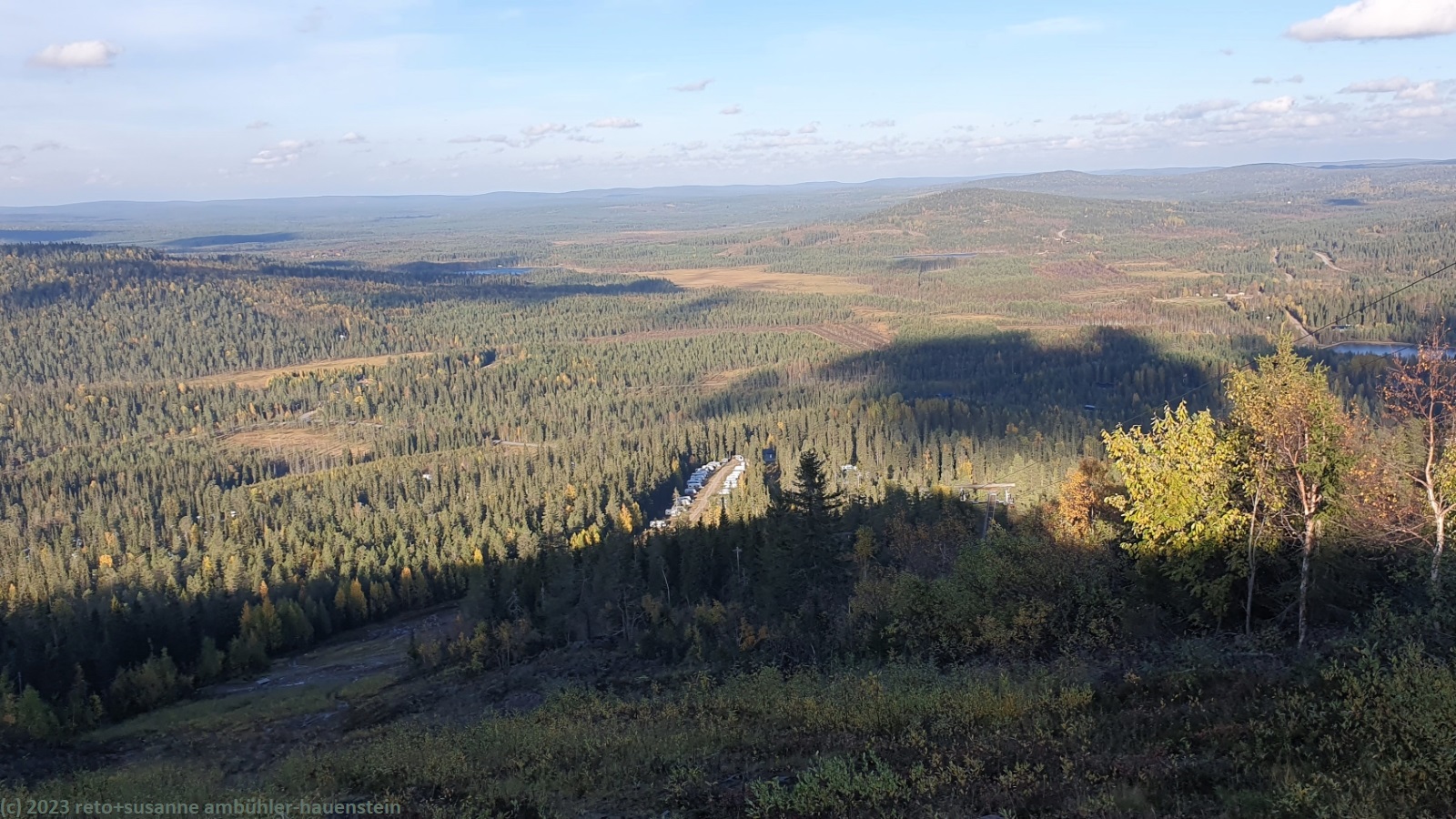wir schauen uns kurz die ausstellung an und trinken dann auf der terrasse einen tee. der himmel ist nun ziemlich blau mit wenigen wolken und viel sonnenschein. wir erklimmen deshalb die steile skipiste und stehen gegen 16:40 uhr auf dem gipfel des iso-syöte. hier stehen ein grosses hotel und die bergstationen der verschiedenen skilifte. einige lifte sind in betrieb, um biker auf den berg zu schleppen, damit sie auf einer der wilden bahnen wieder talwärts brettern können. wir besuchen erst den aussichtspunkt, von welchem aus man eine schöne fernsicht richtung westen hat. danach gehen wir zum hotel, von dessen terrasse aus hat man eine ebenso schöne fernsicht in die übrigen richtungen.