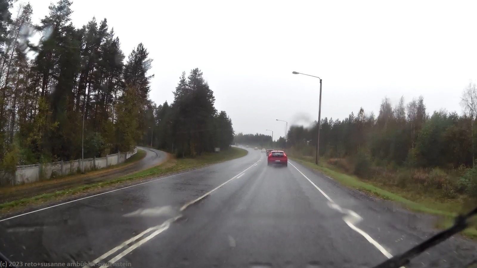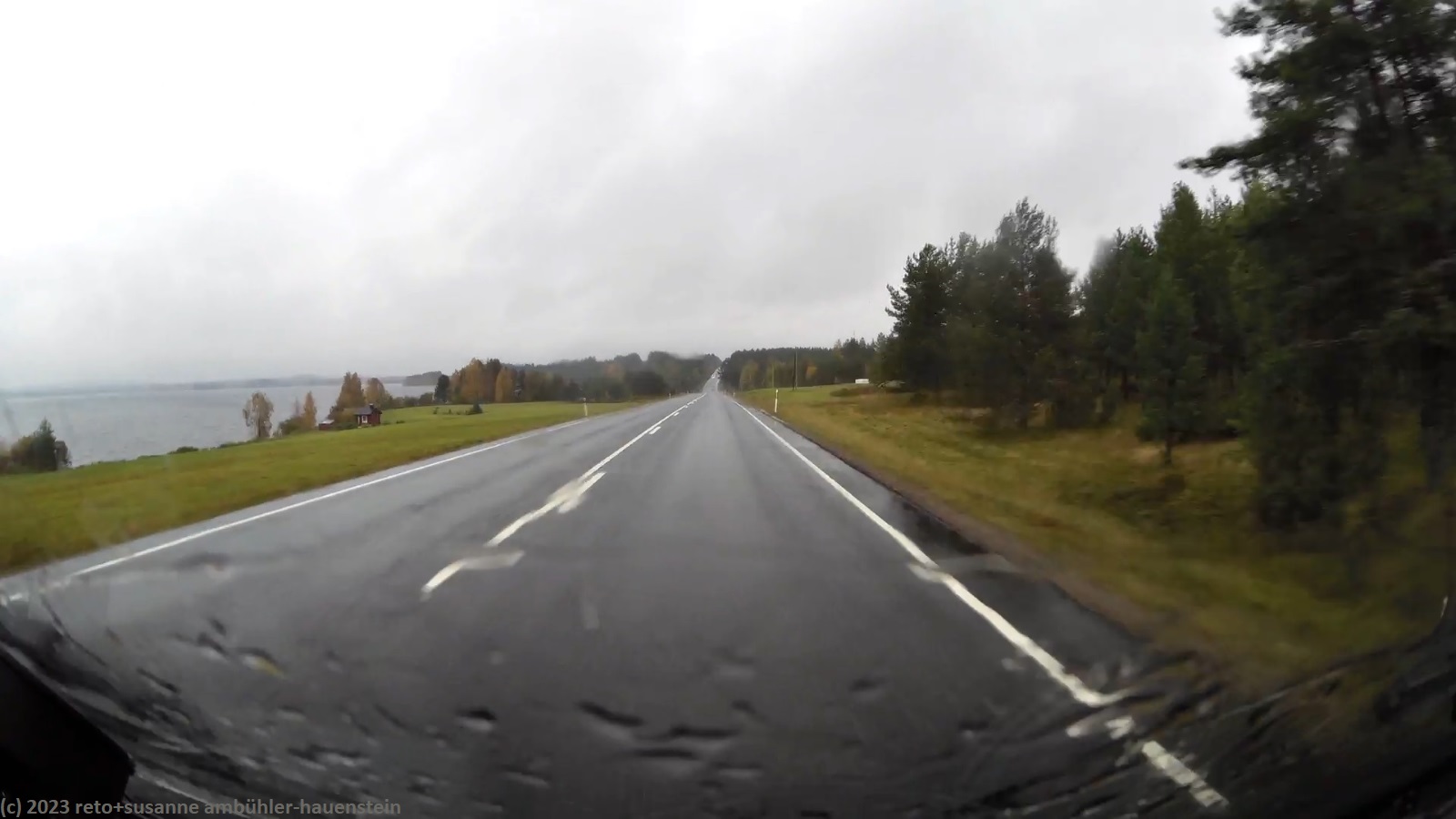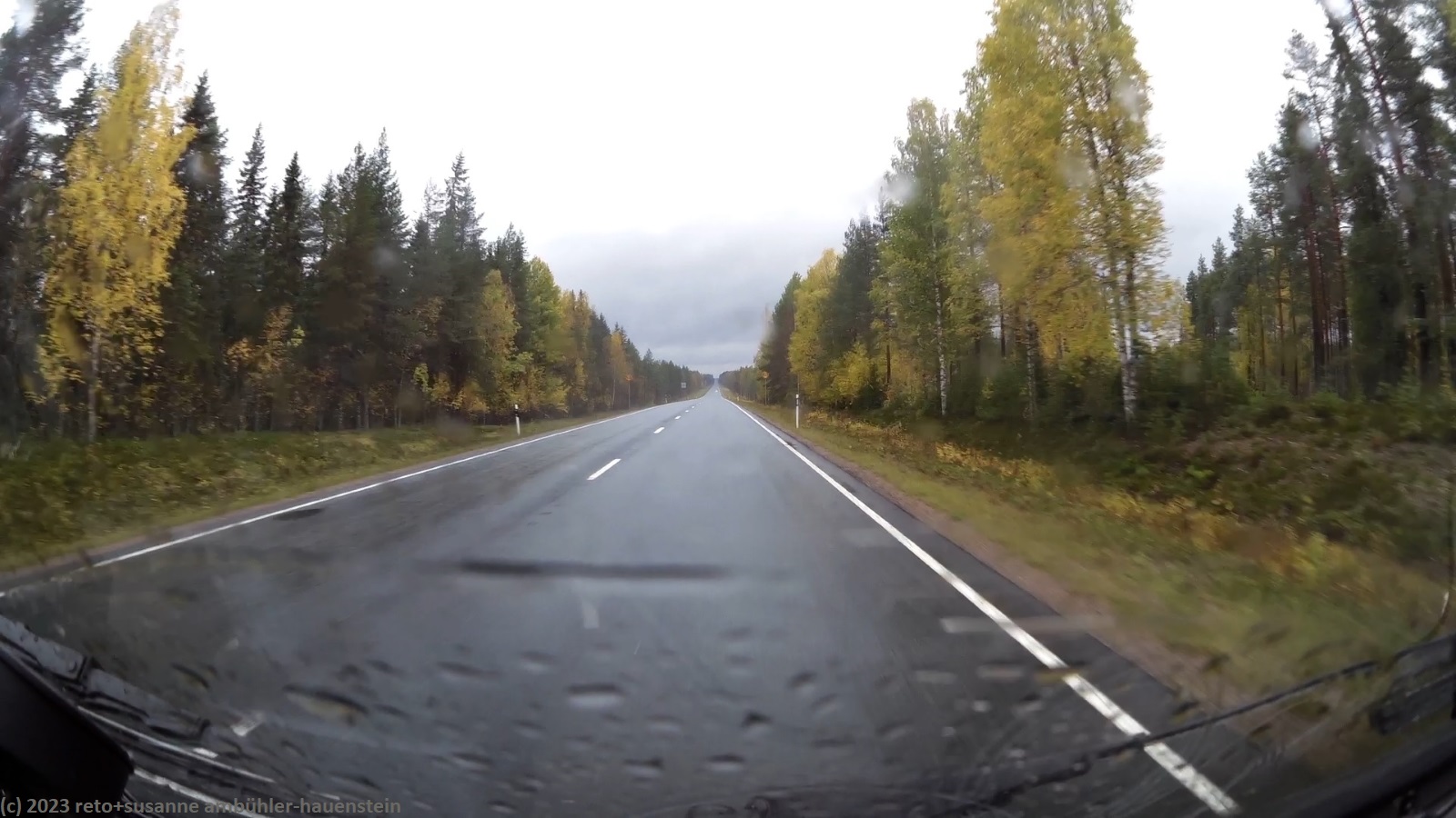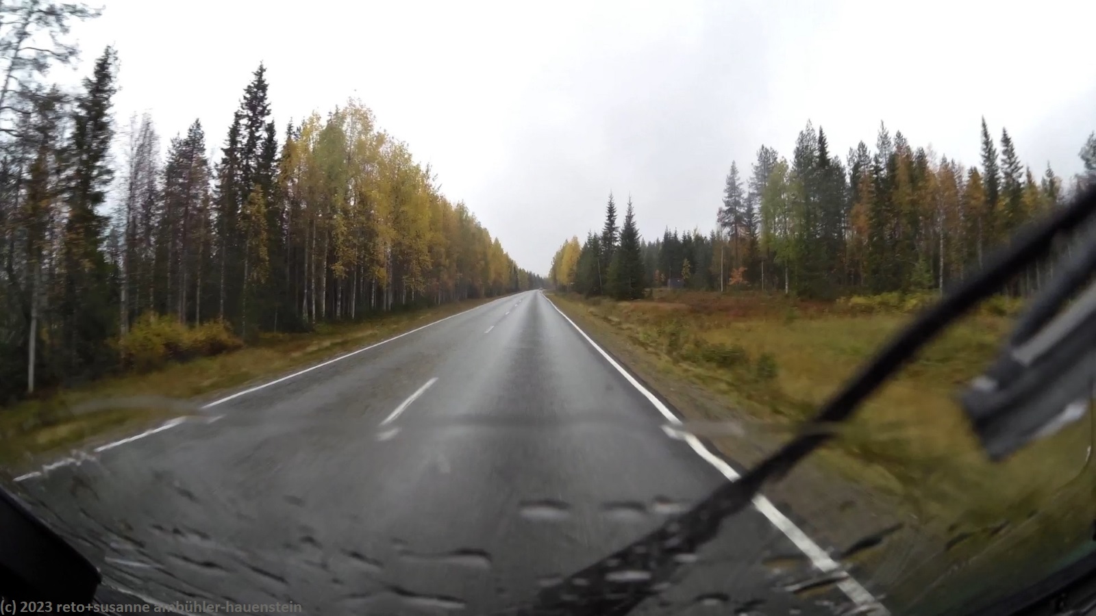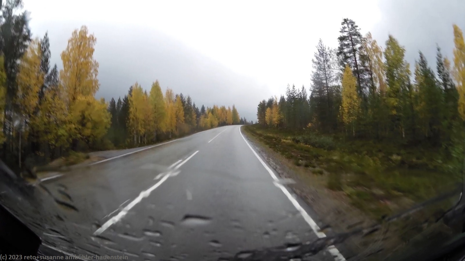 unser handy weckt uns um 8 uhr. während wir frühstücken regnet es immer wieder. kurz nach 10 uhr machen wir uns auf den weg. über die strassen 862 und 858 geht es zur strasse 20. trotz des trüben wetters leuchten die blätter der laubbäume entlang der strasse goldgelb, das sieht fantastisch aus. bis zur strasse 20 hat es kaum autos in unserer richtung. auch auf den ersten 60 km läuft es wunderbar. dann fahren wir auf eine kolonne auf, an deren spitze ein riesiger lastwagen fährt. obwohl die strasse meistens schnurgerade verläuft, überholt niemand und so bleibt uns nichts anderes übrig, als hinterher zu fahren. der teilweise heftige regen und der manchmal etwas böige wind machen die fahrt auch nicht angenehmer. genau um mittag erreichen wir den campingplatz nallikari. die zufahrt ist allerdings eine besondere herausforderung, denn rund um den campingplatz wird gebaut.