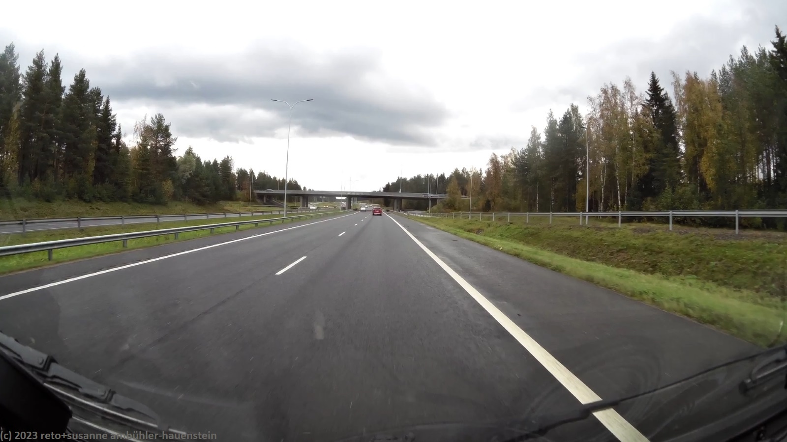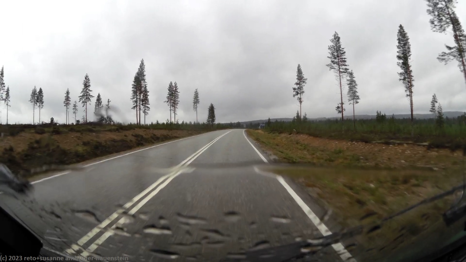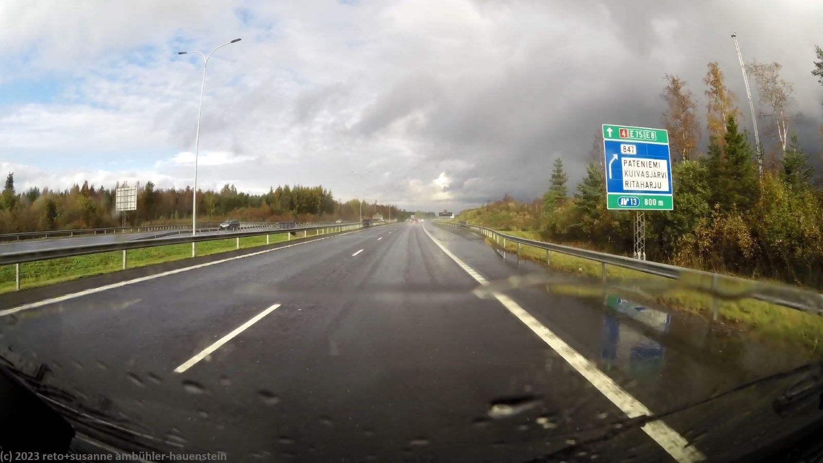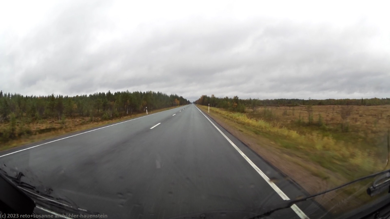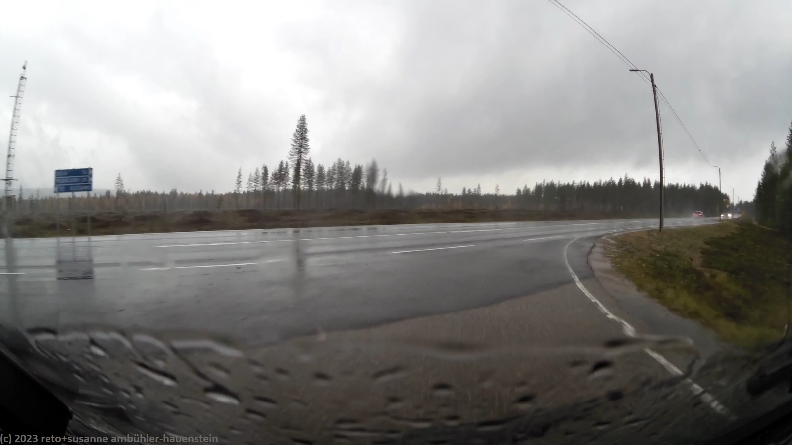 unser handy weckt uns um 8 uhr. während wir frühstücken regnet es immer wieder. kurz nach 10 uhr machen wir uns auf den weg. über die strassen 862 und 858 geht es zur strasse 20. trotz des trüben wetters leuchten die blätter der laubbäume entlang der strasse goldgelb, das sieht fantastisch aus. bis zur strasse 20 hat es kaum autos in unserer richtung. auch auf den ersten 60 km läuft es wunderbar. dann fahren wir auf eine kolonne auf, an deren spitze ein riesiger lastwagen fährt. obwohl die strasse meistens schnurgerade verläuft, überholt niemand und so bleibt uns nichts anderes übrig, als hinterher zu fahren. der teilweise heftige regen und der manchmal etwas böige wind machen die fahrt auch nicht angenehmer. genau um mittag erreichen wir den campingplatz nallikari. die zufahrt ist allerdings eine besondere herausforderung, denn rund um den campingplatz wird gebaut.