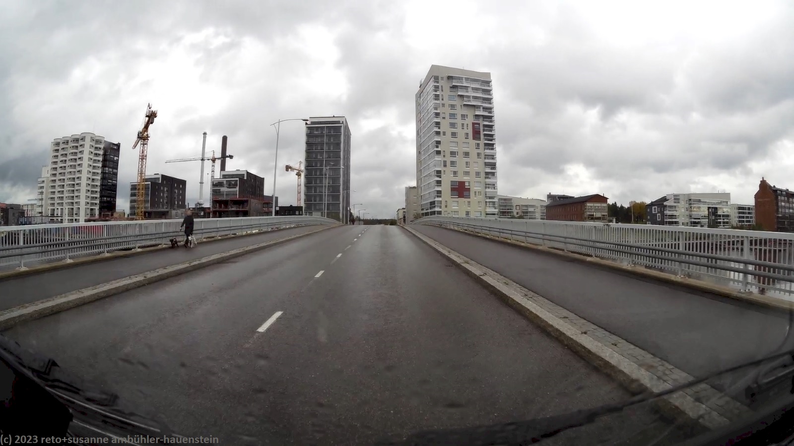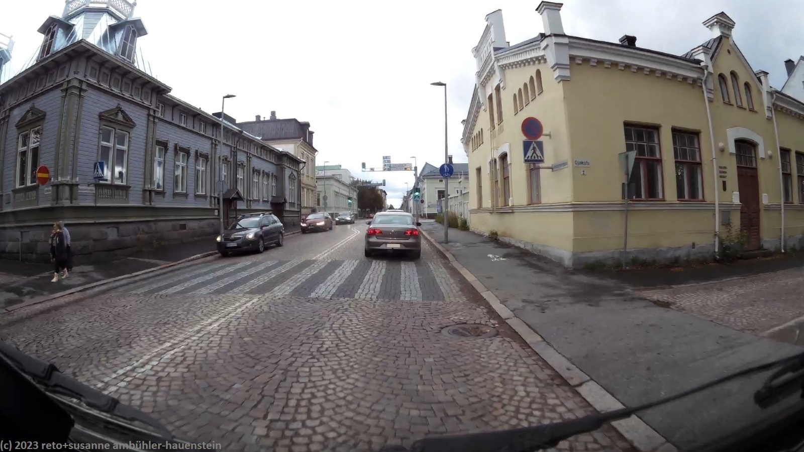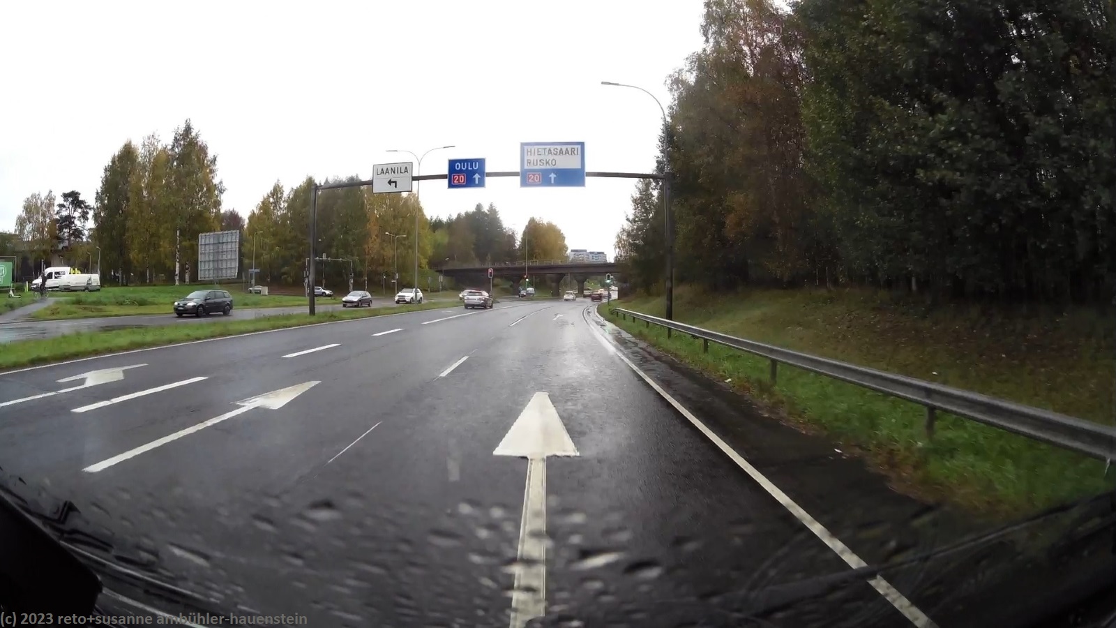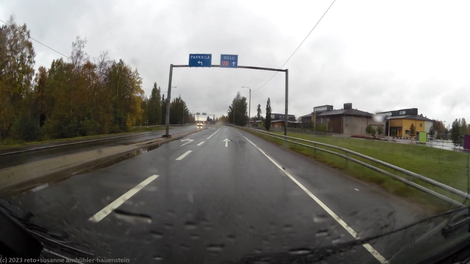 heute steht uns einmal mehr ein regnerischer tag bevor. auf der fahrt nach oulu regnet es fast ununterbrochen und zeitweise sehr kräftig. zu beginn fahren wir durch schöne mischwälder. die birken am strassenrand leuchten trotz des trüben wetters in herbstlichem gelb. auch auf der strasse 20 richtung oulu geht es anfangs sehr flüssig vorwärts, bis wir auf eine längere kollonne hinter einem lastwagen auffahren. die letzten meter auf der zufahrt zum camping nallikari sind wegen baustellen ziemlich abenteuerlich. genau am mittag sind wir am ziel. da grosse teile des campingplatzes unter wasser stehen, müssen wir mit einem asphaltierten parkplatz vorlieb nehmen. gerne möchten wir den daheimgebliebenen etwas mitbringen. beim riesigen einkaufszentrum ideapark werden wir nur teilweise fündig, dafür gibt es in einem hübschen cafe etwas zu mittag. danach fahren wir ins stadtzentrum und parkieren in der nähe der alten markthalle. wir besuchen weitere läden, aber erneut mit mässigem erfolg. wir verschieben unsere einkaufstour auf den tag in helsinki. zurück auf dem campingplatz geniessen wir erst das abendessen und dann noch einmal die sauna. anschliessend spazieren wir etwas dem strand entlang und planen dann im jogi den morgigen tag.