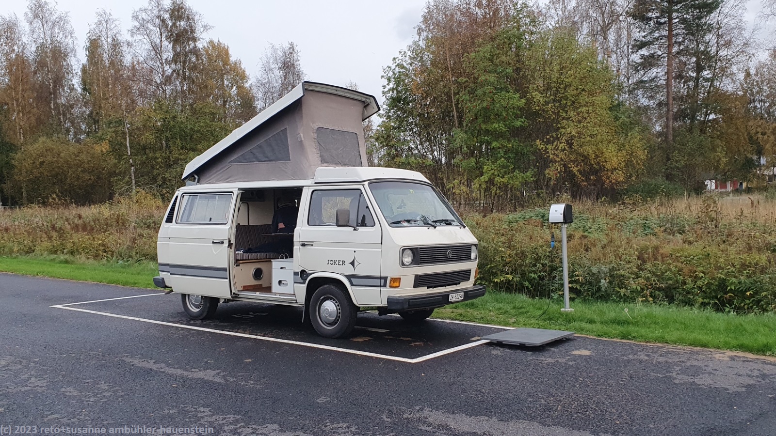 auf dem riesigen platz sind nur wenig gäste. das haben wir schon ganz anders erlebt, siehe tagebuch vom 21-jul-2016. unser stellplatz ist kaum grösser als ein parkfeld irgendwo in der stadt. die dame am empfang hat gemeint, wir sollten besser einen asphaltierten stellplatz nehmen. tatsächlich stehen die stellplätze auf der wiese unter wasser.