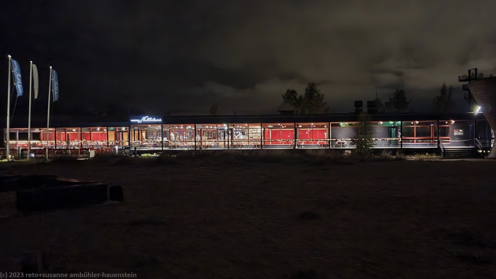 wir schlendern durch die fussgängerzone und besuchen dort weitere einkaufszentren. das wetter ist inzwischen trocken, manchmal sehen wir etwas blauen himmel und es gibt einige sonnenstrahlen. die temperatur von 17°C fühlt sich ungewohnt warm an. auf dem weg zurück zum parkplatz setzen wir uns in ein hübsches cafe und trinken eine tasse tee. kurz nach 17 uhr machen wir uns auf den weg zurück zum campingplatz. unterwegs kaufen wir für das heutige nachtessen ein. nach dem abendessen geniessen wir eine erfrischende dusche und - vermutlich zum letzten mal auf dieser reise - eine sitzung in der sauna. danach spazieren wir ein wenig dem strand entlang. dabei kommen wir am riesigen restaurant nallikari vorbei. im sommer herrscht hier mächtiger trubel, heute kann man die gäste an einer hand abzählen.