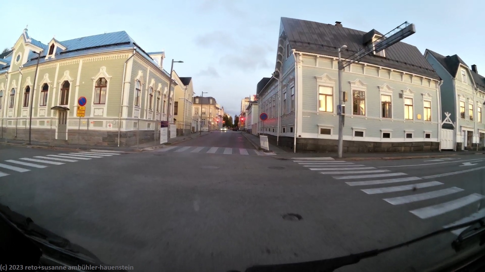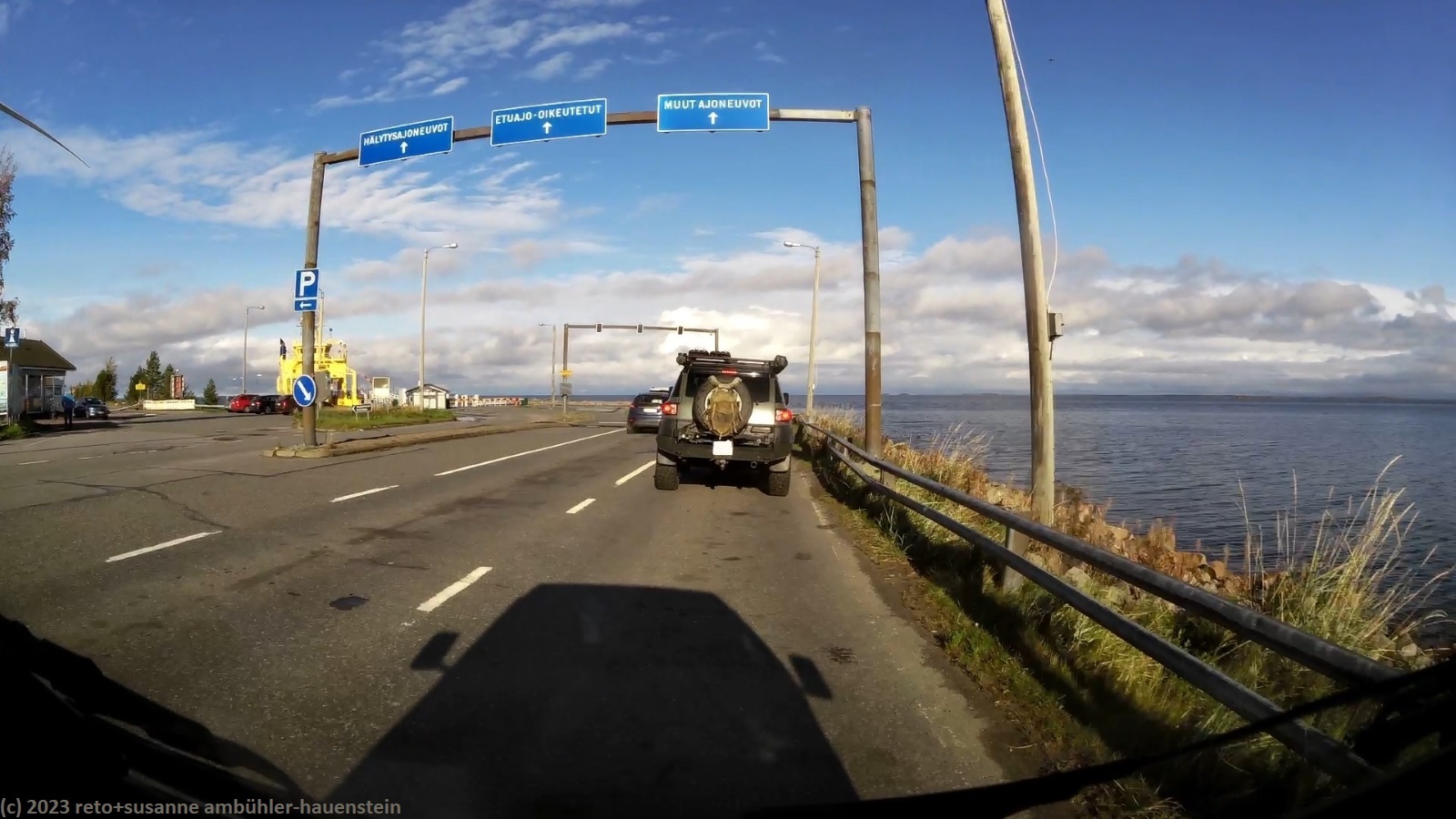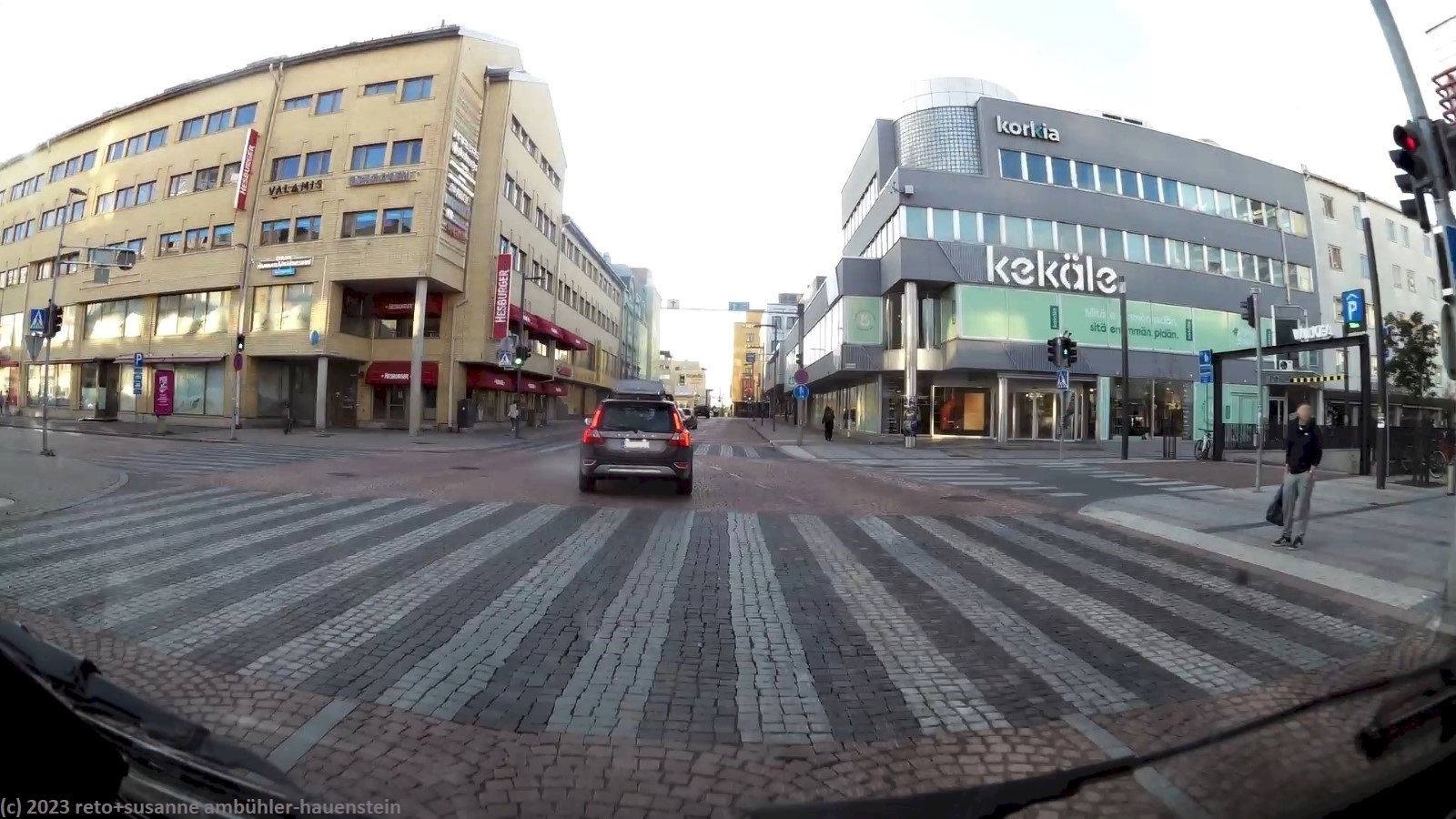 auf der fahrt zum hafen hat es zu unserer überraschung kein einziges auto. als wir beim hafen ankommen, steht dann aber doch schon eine beachtliche anzahl fahrzeuge auf der wartespur. wir stellen uns hinten an und holen am kiosk kaffee und eine zimtschnecke. die fähre kommt pünktlich und nun wird es spannend, ob wir noch einen platz erhalten. in einer stunde würde zwar wieder eine fähre fahren, aber das würde unseren zeitplan ziemlich stressen. wir müssen um 19:30 uhr beim bahnhof sein, um unseren bus auf den autozug zu verladen und möchten vorher noch etwas essen gehen. die beiden spuren am hafen sind finnisch angeschrieben, wir haben keine ahnung, was es bedeutet¹. die meisten fahrzeuge stehen auf der rechten spur, da haben auch wir uns eingereiht. doch während wir warten fahren immer wieder autos auf der linken spur vorbei. als dann die eben angekommene fähre entladen ist, dürfen die autos auf der linken spur zuerst einfahren. ich wüsste zu gerne, was diese leute für ein privileg haben. als unsere spur dann an der reihe ist, dürfen wir als zweitletztes fahrzeug an bord fahren - uff, das war knapp ! die überfahrt dauert knapp 30 minuten. wir sind zwar die erste reihe, die von bord fahren darf, aber als hinterstes fahrzeug müssen wir uns im kolonnenfahren üben. die autos vor uns pflegen aber einen zügigen fahrstil, so dass wir entspannt hinterher rollen. wir parkieren im zentrum von oulu wieder auf dem gleichen parkplatz wie gestern. heute hat es viele freie parkfelder.