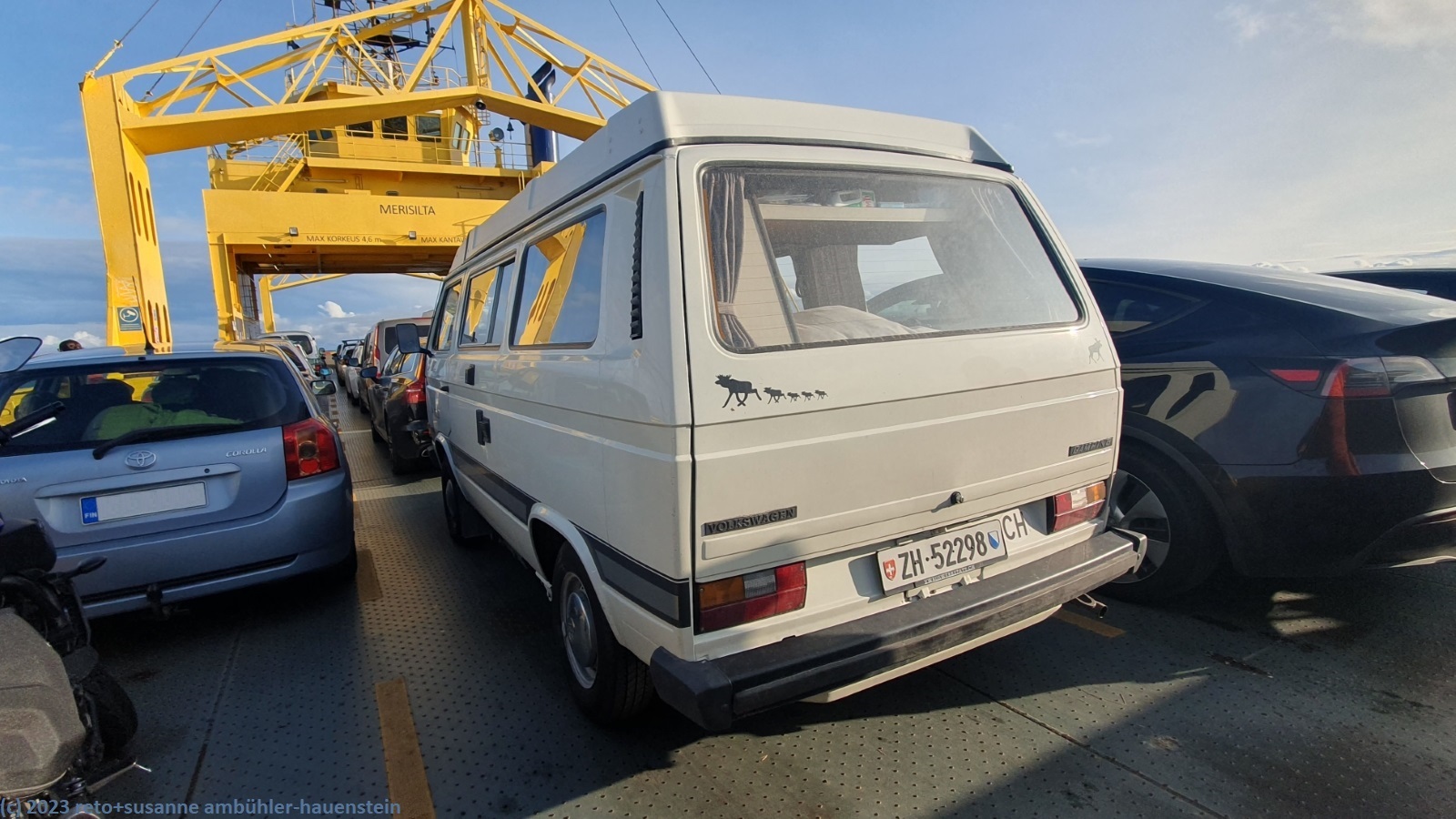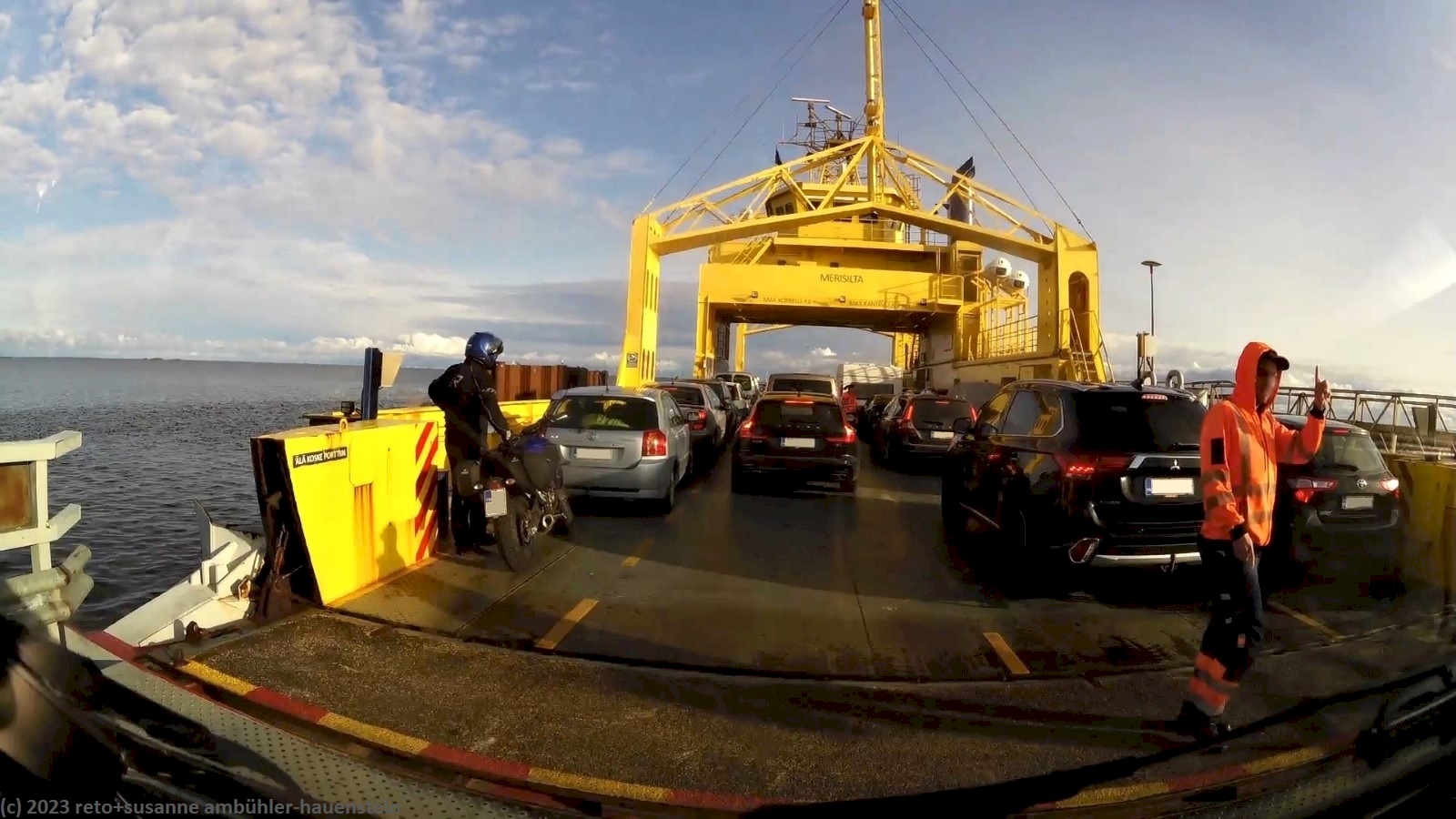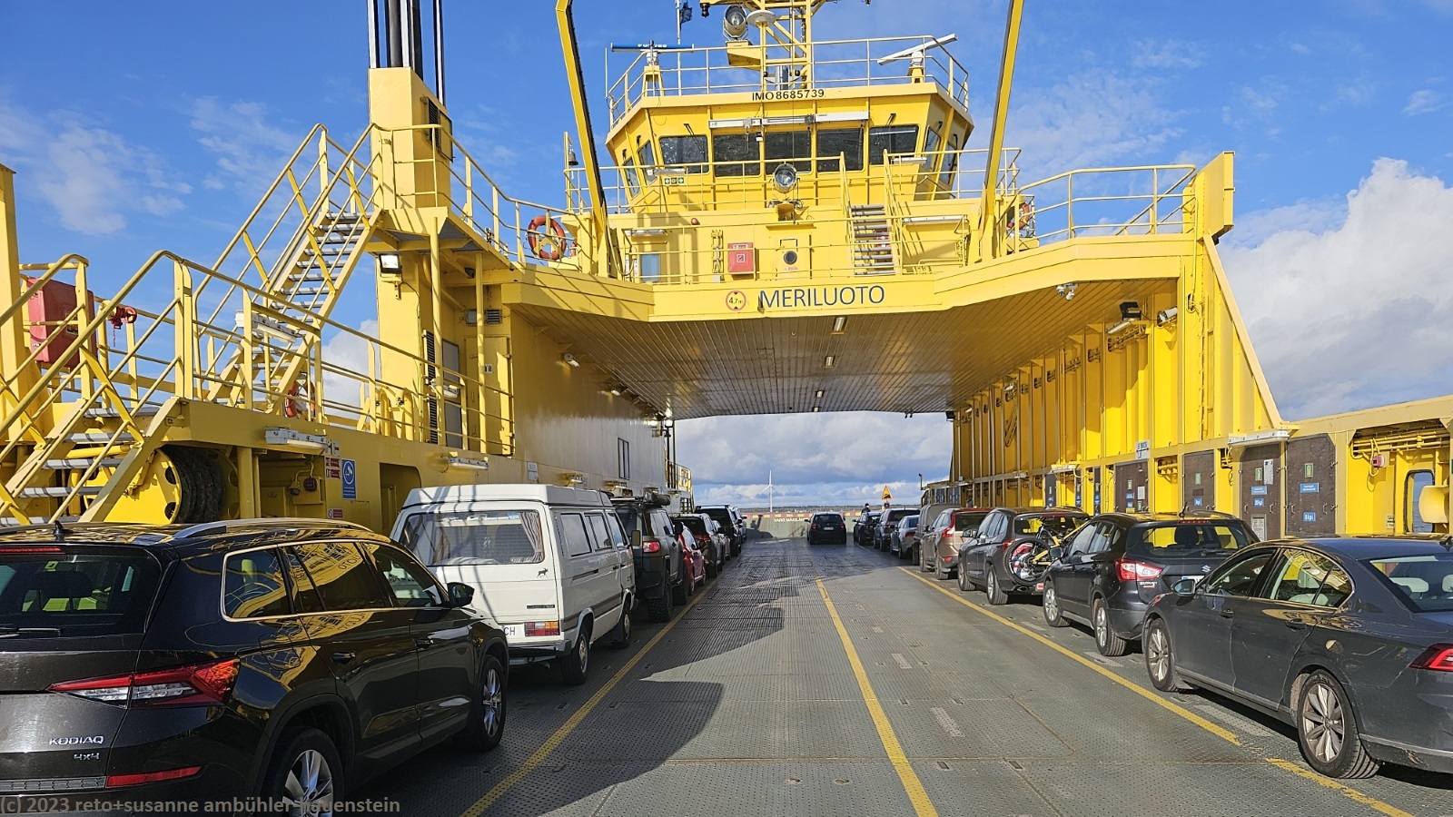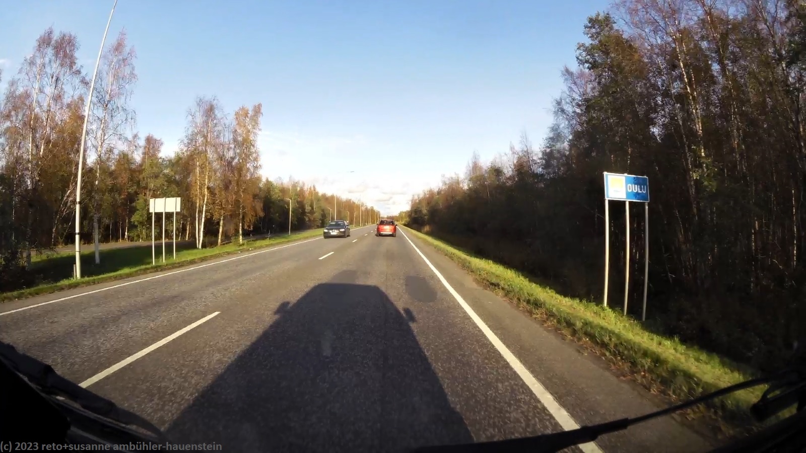 auf der fahrt zum hafen hat es zu unserer überraschung kein einziges auto. als wir beim hafen ankommen, steht dann aber doch schon eine beachtliche anzahl fahrzeuge auf der wartespur. wir stellen uns hinten an und holen am kiosk kaffee und eine zimtschnecke. die fähre kommt pünktlich und nun wird es spannend, ob wir noch einen platz erhalten. in einer stunde würde zwar wieder eine fähre fahren, aber das würde unseren zeitplan ziemlich stressen. wir müssen um 19:30 uhr beim bahnhof sein, um unseren bus auf den autozug zu verladen und möchten vorher noch etwas essen gehen. die beiden spuren am hafen sind finnisch angeschrieben, wir haben keine ahnung, was es bedeutet¹. die meisten fahrzeuge stehen auf der rechten spur, da haben auch wir uns eingereiht. doch während wir warten fahren immer wieder autos auf der linken spur vorbei. als dann die eben angekommene fähre entladen ist, dürfen die autos auf der linken spur zuerst einfahren. ich wüsste zu gerne, was diese leute für ein privileg haben. als unsere spur dann an der reihe ist, dürfen wir als zweitletztes fahrzeug an bord fahren - uff, das war knapp ! die überfahrt dauert knapp 30 minuten. wir sind zwar die erste reihe, die von bord fahren darf, aber als hinterstes fahrzeug müssen wir uns im kolonnenfahren üben. die autos vor uns pflegen aber einen zügigen fahrstil, so dass wir entspannt hinterher rollen. wir parkieren im zentrum von oulu wieder auf dem gleichen parkplatz wie gestern. heute hat es viele freie parkfelder.
