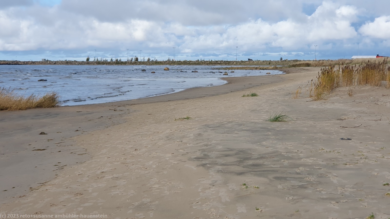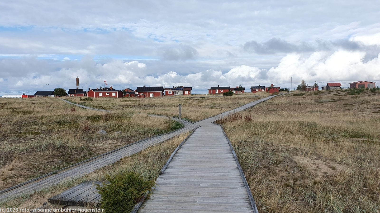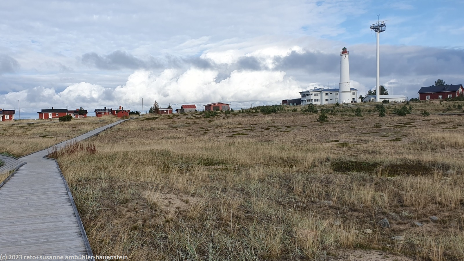 als uns unser handy um 8 uhr weckt, ist der himmel stark bewölkt und es ist spürbar kühler geworden. nach dem frühstück packen wir zusammen und machen uns auf den weg zur insel hailuoto. susanne hat am westlichen ende der insel schöne wandergelegenheiten gefunden. bis zur fähre am ende der halbinsel oulunsalo sind es etwas mehr als 30 km. die fahrt verläuft entspannt, es hat wenig verkehr. am hafen stehen erst eine handvoll autos, da kommen wir sicher mit. auf der website der fährengesellschaft stand, dass bis und mit heute eine kleinere fähre verkehre, weil an der grösseren die jahresrevision gemacht werde. die fähre legt exakt um 11 uhr ab und ist knapp halb voll. auf der insel sind es dann nochmals 30 km vom hafen bis zum anderen ende. auf der schmalen strasse herrscht wenig verkehr. um mittag sind wir beim parkplatz bei marjaniemi. ganz in der nähe befindet sich das markante arctic lighthouse hotel.
