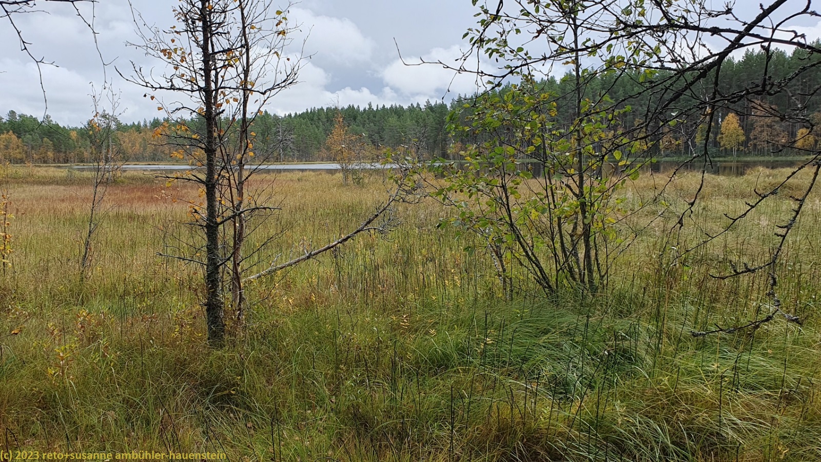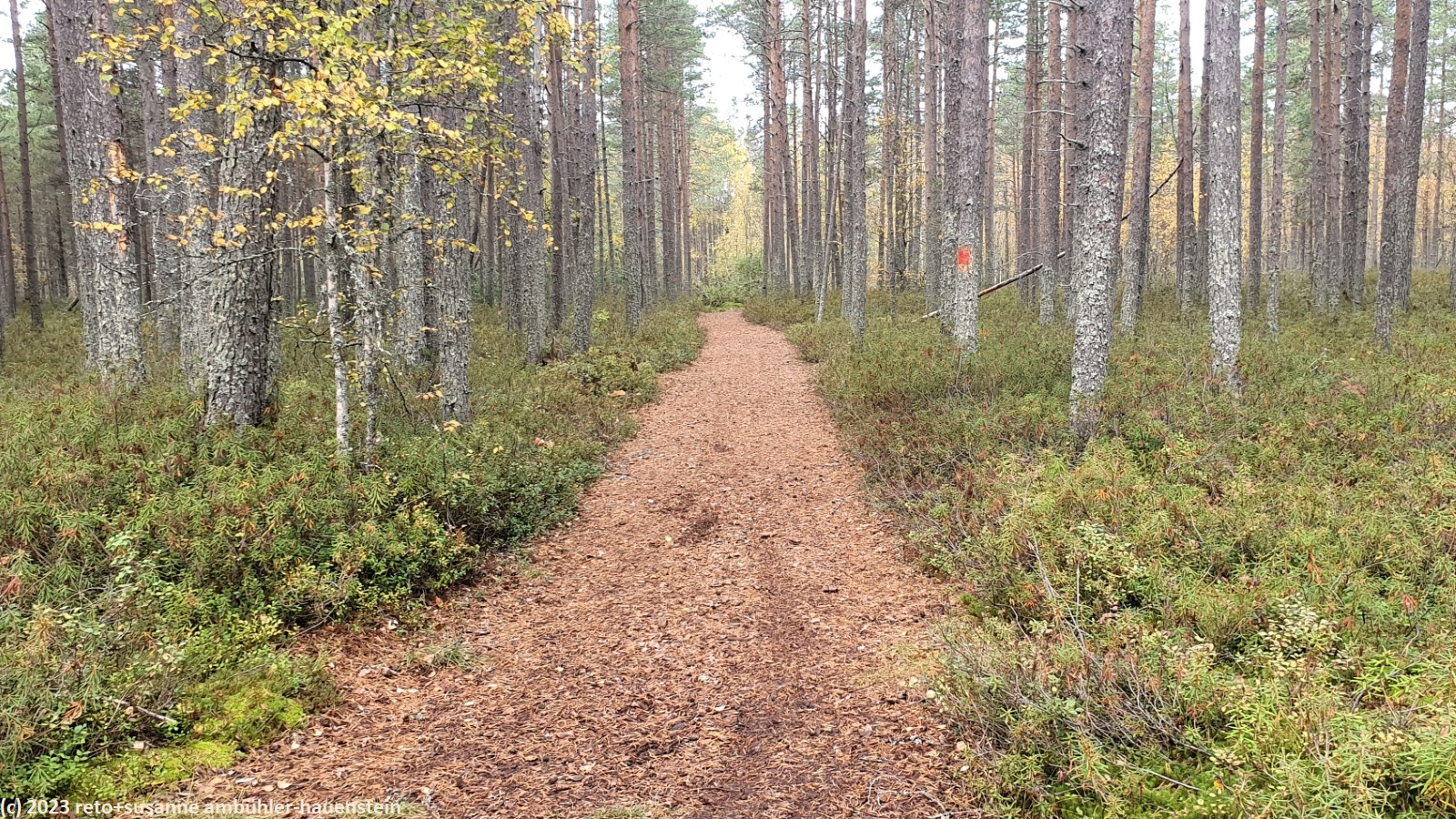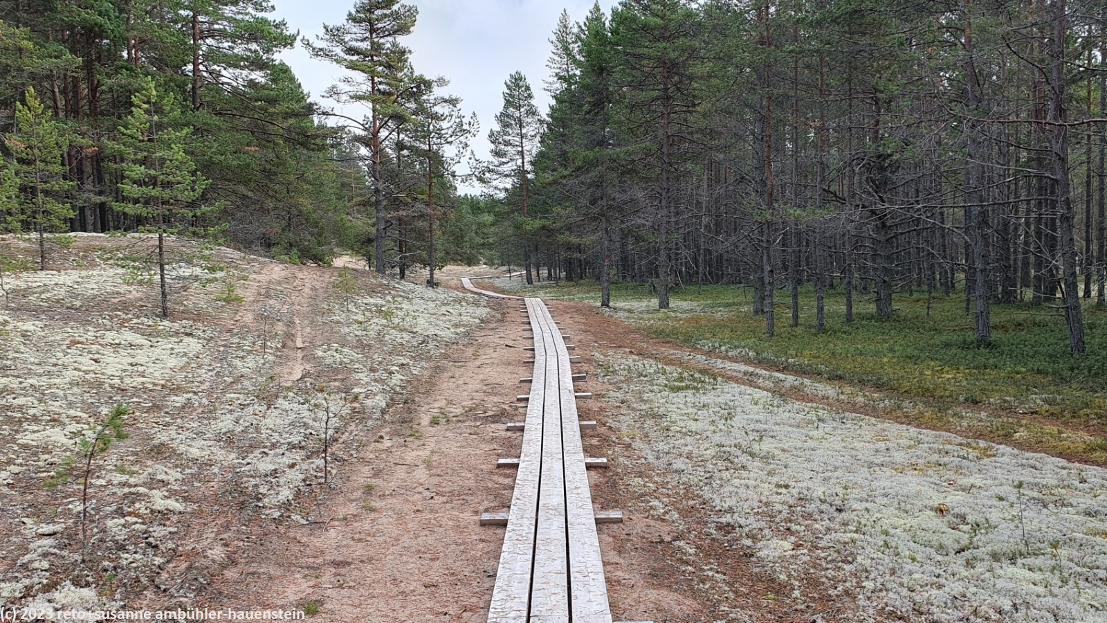wir folgen dem sandstrand südwärts. die küste ist sehr schön, ein schmaler streifen am land und ein stück weit ins meer hinaus ist naturschutzgebiet. etwas zurückversetzt hat es teilweise ältere, aber auch neue, wunderschöne ferienhäuser. der blick aufs wasser ist allerdings durch die sanddüne verdeckt. erstaunlicherweise hat es keine möven, obwohl eine frau gestern in der sauna zu susanne gesagt hat, wir sollten auf keinen fall auf der insel übernachten, der krach der möven sei unerträglich. anfangs hat es einen breiten holzsteg, auf dem wir bequem durch die dünen wandern können. nach knapp 1 km endet dieser. wir folgen dem ufer auf dem sandstrand, bis wir zu einem sumpf kommen. am strand steht ein traktor mit bootanhänger, ganz in der nähe hat es zwei kleine holzbänke. wir beschliessen, hier zu mittag zu essen. über dem meer hat es blauen himmel, aber bei uns verdeckt immer noch eine dünne wolkenschicht die sonne. wir können sie zwar erkennen, aber wirklich sonnig ist es nicht. gegen 13:40 uhr brechen wir wieder auf. wir folgen nun der traktorspur weg vom strand und erreichen wenig später einen wald. hier gibt es einen markierten wanderweg, der uns in einem bogen zum ausgangspunkt zurück bringt. anfangs ist der wald ziemlich licht und der boden ist von einem fantastisch schönen teppich aus flechten und moose überzogen. dann wir der wald dichter. auch hier führt der weg meistens über holzplanken. in der nähe des hannuksenlampi ist der boden sehr sumpfig. als ich versuche ein foto vom see zu machen, hole ich mir nasse füsse. wir folgen dem weg bis zur schutzhütte hannuksenlammen laavu. in der feuerstelle brennen noch einige scheiter. wir versuchen nochmals zum see hinunter zu kommen, aber der sumpfgürtel rund um den see ist nicht begehbar. so kehren wir zur schutzhütte zurück und ich fache das feuer nochmals an, um meine schuhe und socken etwas zu trocknen. trocken werden sie natürlich nicht, aber sie sind so warm, dass es sich gut anfühlt. wir gehen ein stück den weg zurück, den wir gekommen sind und folgen dann weiter dem markierten wanderweg. durch ein eindrucksvolles blättertunnel gelangen wir wieder zur neuen ferienhaussiedlung und über den holzsteg, den wir gekommen sind, zurück zum ausgangspunkt.