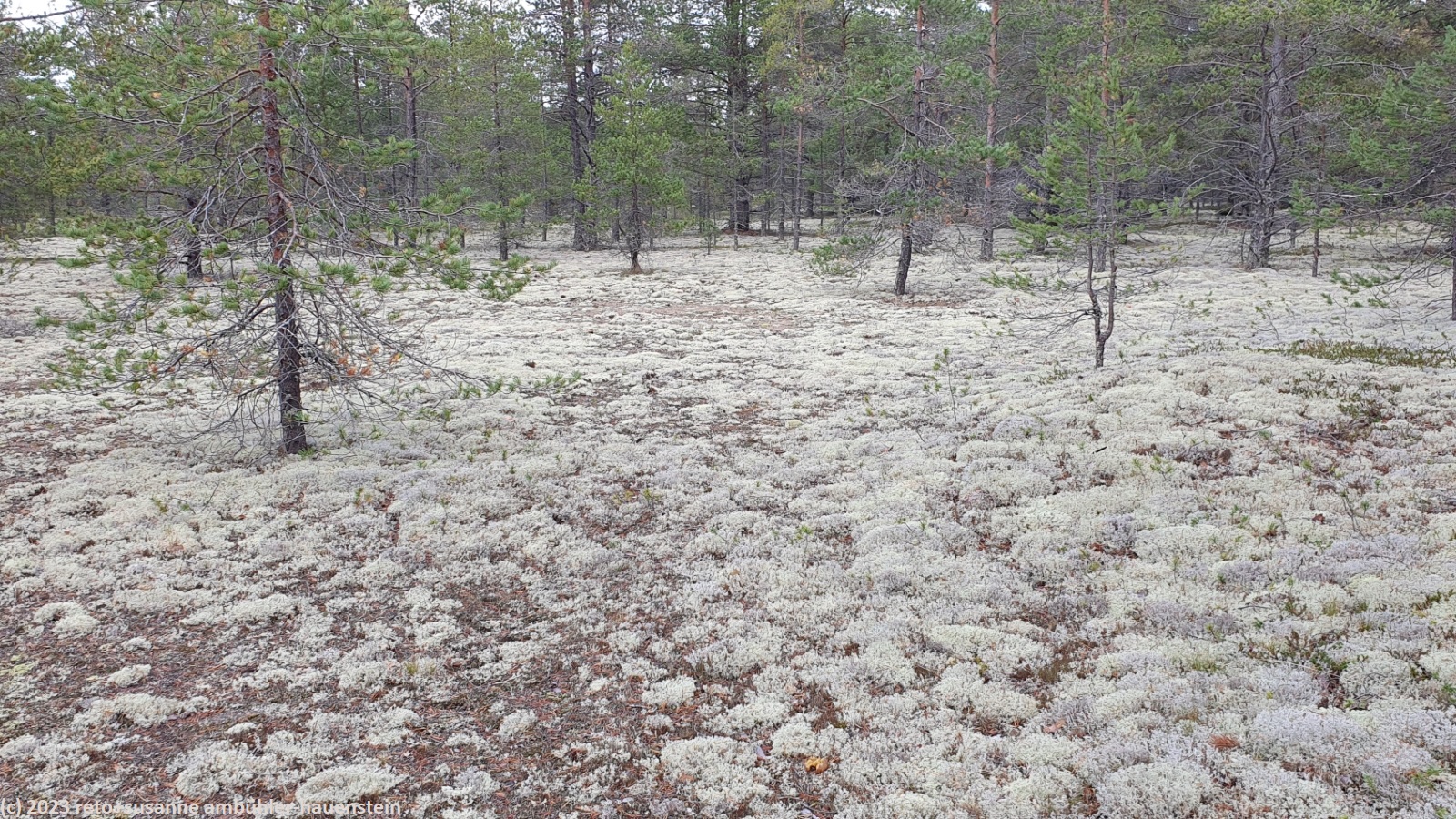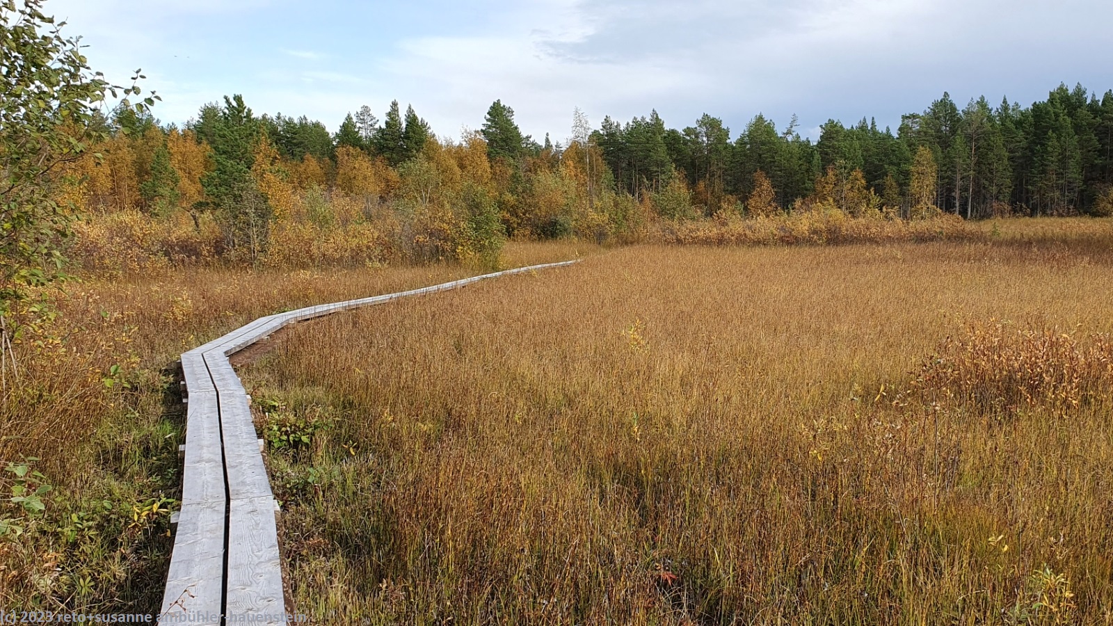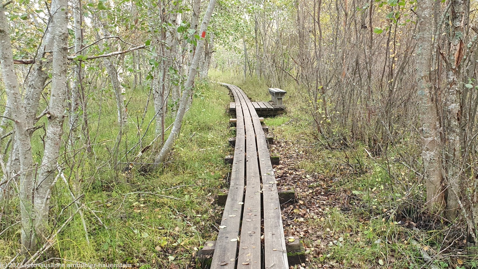wir folgen dem sandstrand südwärts. die küste ist sehr schön, ein schmaler streifen am land und ein stück weit ins meer hinaus ist naturschutzgebiet. etwas zurückversetzt hat es teilweise ältere, aber auch neue, wunderschöne ferienhäuser. der blick aufs wasser ist allerdings durch die sanddüne verdeckt. erstaunlicherweise hat es keine möven, obwohl eine frau gestern in der sauna zu susanne gesagt hat, wir sollten auf keinen fall auf der insel übernachten, der krach der möven sei unerträglich. anfangs hat es einen breiten holzsteg, auf dem wir bequem durch die dünen wandern können. nach knapp 1 km endet dieser. wir folgen dem ufer auf dem sandstrand, bis wir zu einem sumpf kommen. am strand steht ein traktor mit bootanhänger, ganz in der nähe hat es zwei kleine holzbänke. wir beschliessen, hier zu mittag zu essen. über dem meer hat es blauen himmel, aber bei uns verdeckt immer noch eine dünne wolkenschicht die sonne. wir können sie zwar erkennen, aber wirklich sonnig ist es nicht. gegen 13:40 uhr brechen wir wieder auf. wir folgen nun der traktorspur weg vom strand und erreichen wenig später einen wald. hier gibt es einen markierten wanderweg, der uns in einem bogen zum ausgangspunkt zurück bringt. anfangs ist der wald ziemlich licht und der boden ist von einem fantastisch schönen teppich aus flechten und moose überzogen. dann wir der wald dichter. auch hier führt der weg meistens über holzplanken. in der nähe des hannuksenlampi ist der boden sehr sumpfig. als ich versuche ein foto vom see zu machen, hole ich mir nasse füsse. wir folgen dem weg bis zur schutzhütte hannuksenlammen laavu. in der feuerstelle brennen noch einige scheiter. wir versuchen nochmals zum see hinunter zu kommen, aber der sumpfgürtel rund um den see ist nicht begehbar. so kehren wir zur schutzhütte zurück und ich fache das feuer nochmals an, um meine schuhe und socken etwas zu trocknen. trocken werden sie natürlich nicht, aber sie sind so warm, dass es sich gut anfühlt. wir gehen ein stück den weg zurück, den wir gekommen sind und folgen dann weiter dem markierten wanderweg. durch ein eindrucksvolles blättertunnel gelangen wir wieder zur neuen ferienhaussiedlung und über den holzsteg, den wir gekommen sind, zurück zum ausgangspunkt.