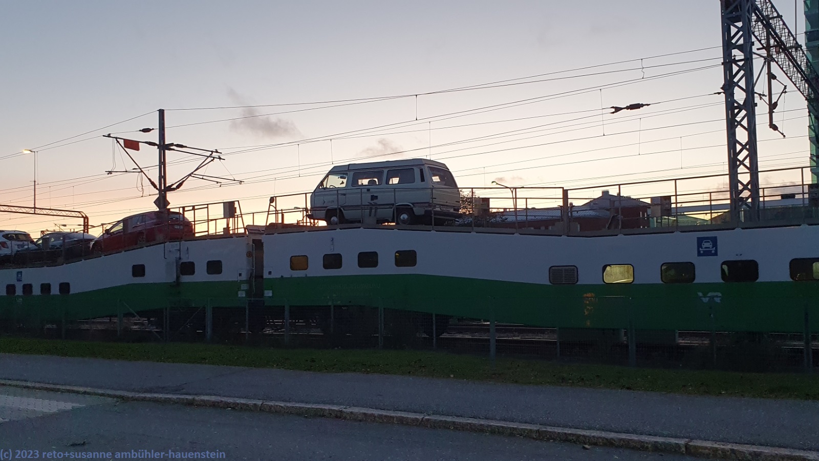 im nahen k-supermarket geben wir die leeren flaschen zurück und kaufen müesli, dann machen wir uns auf den weg zum restaurant sokeri-jussin kievari, aber die küche ist bereits geschlossen. so suchen wir eine alternative und finden sie im restaurant pannu mitten im zentrum von oulu. wir werden von einem sehr freundlichen kellner bedient und schaffen es zeitgerecht zum jogi zurück. pünktlich sind wir beim autoverlad beim bahnhof. kaum angekommen, darf ich unseren jogi bereits auf die bereitstehenden wagons fahren.