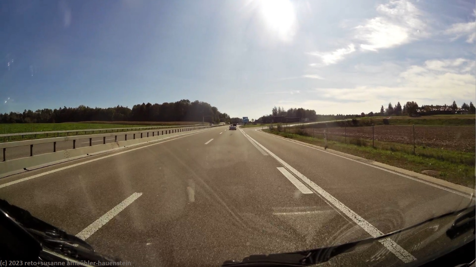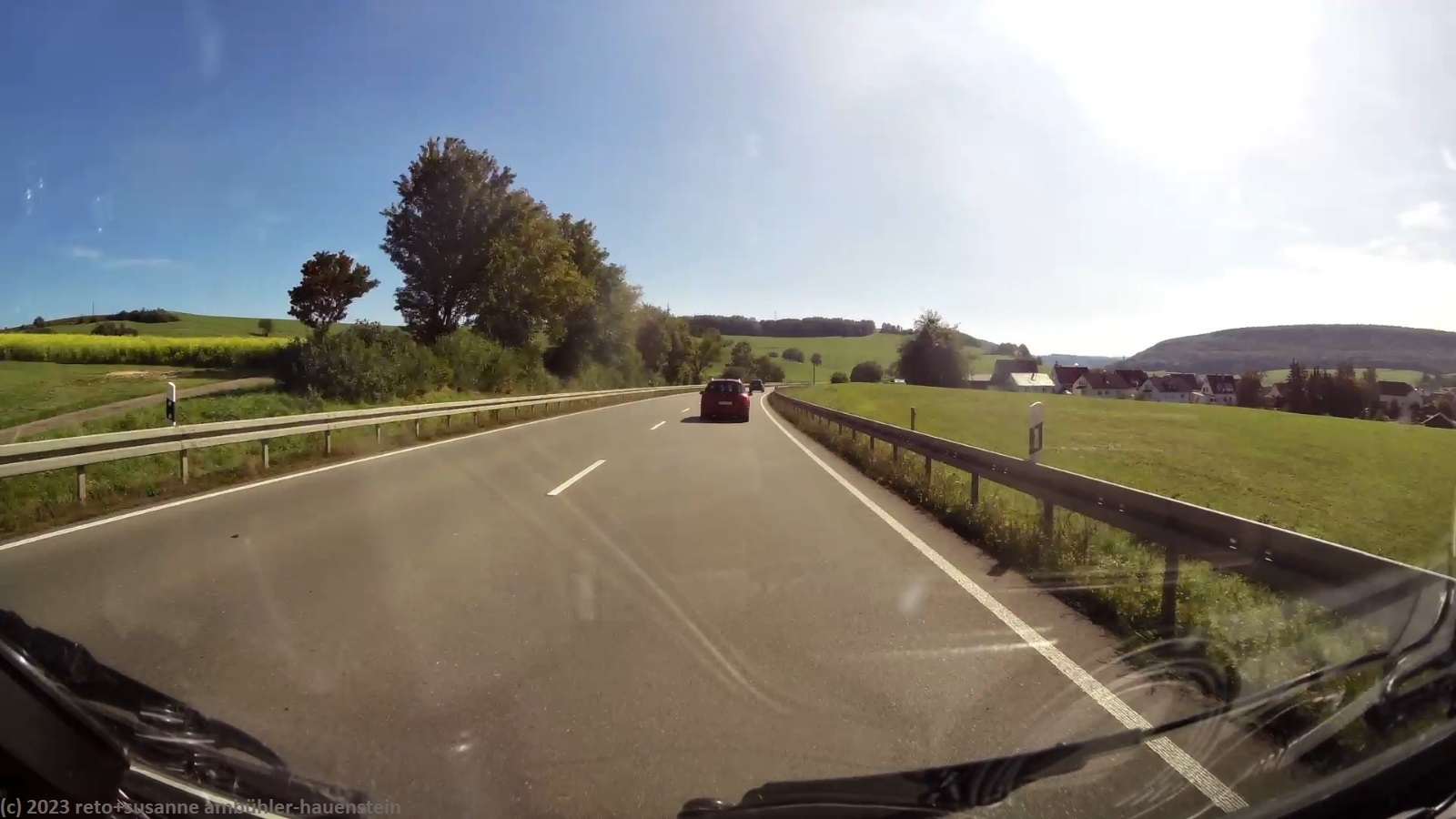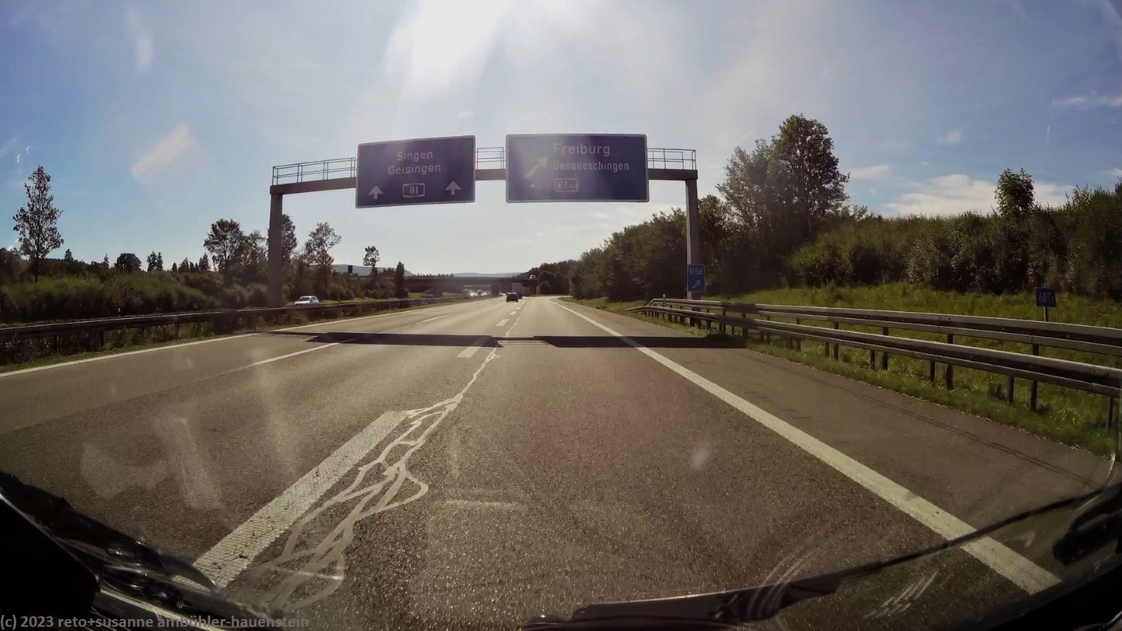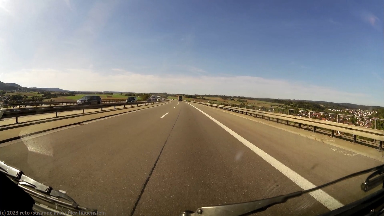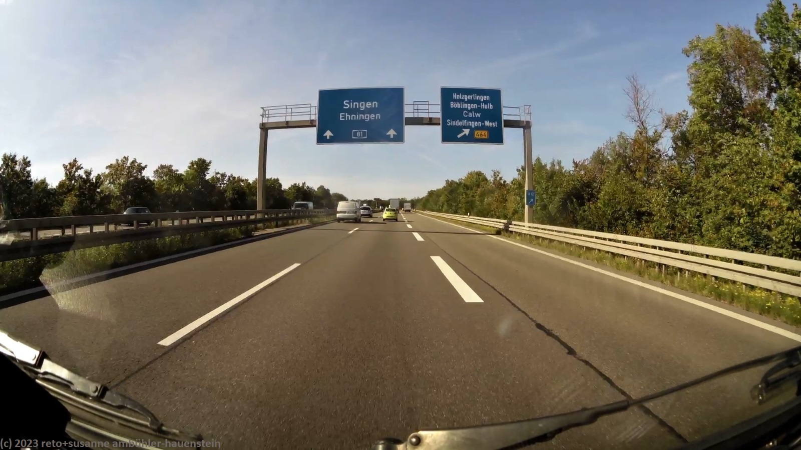 kurz vor 10 uhr nehmen wir die letzten kilometer dieser langen reise unter die räder. bevor wir in der stadt auf die B19 einfahren, tanken wir unseren wagen auf. schon bald sind wir auf der A3. das verkehrsaufkommen ist gering, wie in deutschland üblich sind vor allem lastwagen unterwegs. nach 7 km wechseln wir auf die A81 und fahren auf dieser südwärts. vor einem jahr war diese ausfahrt gesperrt und wir mussten über die landstrasse fahren, siehe tagebuch vom 14-aug-2022. auch hier ist das verkehrsaufkommen gering und die fahrt geht im eigenen tempo vorwärts. ab und zu hat es eine baustelle mit fahrbahn-reduktion oder -verengung, aber wir geraten nie in einen stau. einzig die komischen verkehrsmeldungen unserer navis sind etwas irritierend. sie behaupten hartnäckig, die A7 sei in unserem streckenverlauf gesperrt. nichts davon ist wahr, es läuft wie am schnürchen. in der weiteren umgebung von stuttgart sind einige ganz schnelle fahrzeuge unterwegs, aber auch das sind wir uns gewohnt. wir haben schon mehr schnellfahrer gesehen als heute. einige kilometer nach villingen-schwenningen will das navi auf die A864. unglücklicherweise folge ich diesem routenvorschlag und so geht es auf der erst vier- und dann zweispurigen B27 richtung landesgrenze. die landschaft ist allerdings sehr lieblich und der grenzübergang bei randen ist unbesetzt, so gelangen wir auch ganz locker in die schweiz. die ersparnis von 6 km gegenüber der fahrt über die autobahn hat sich wohl kaum gelohnt, aber so haben wir eine gegend gesehen, in der wir vorher meines wissens noch nie waren. ab schaffhausen geht es dann den gewohnten weg via winterthur ins zürcher oberland.