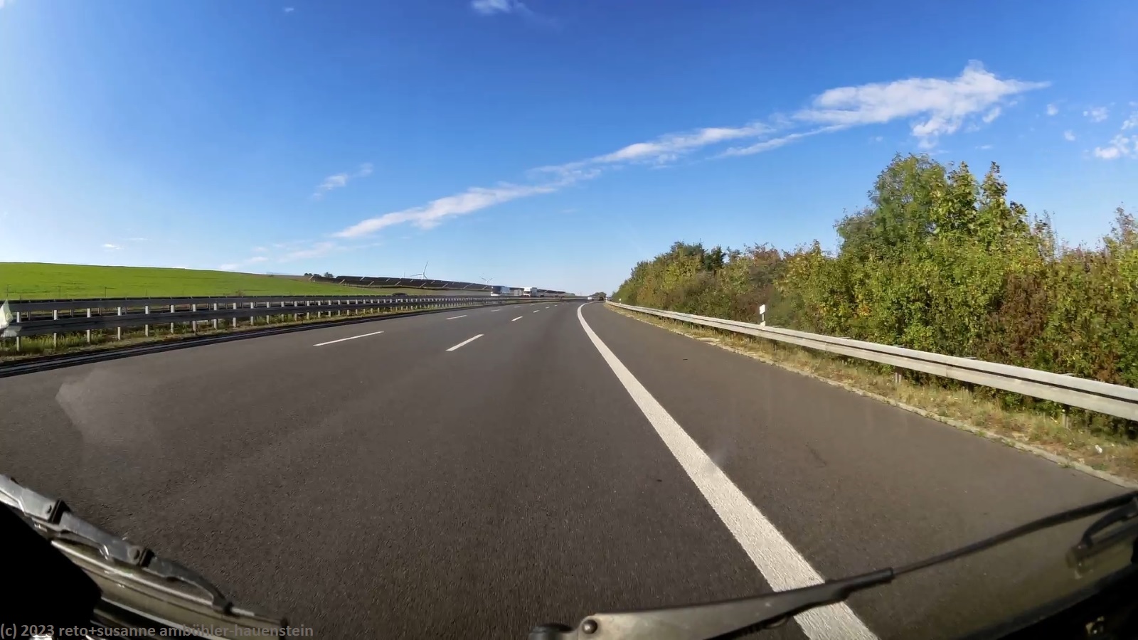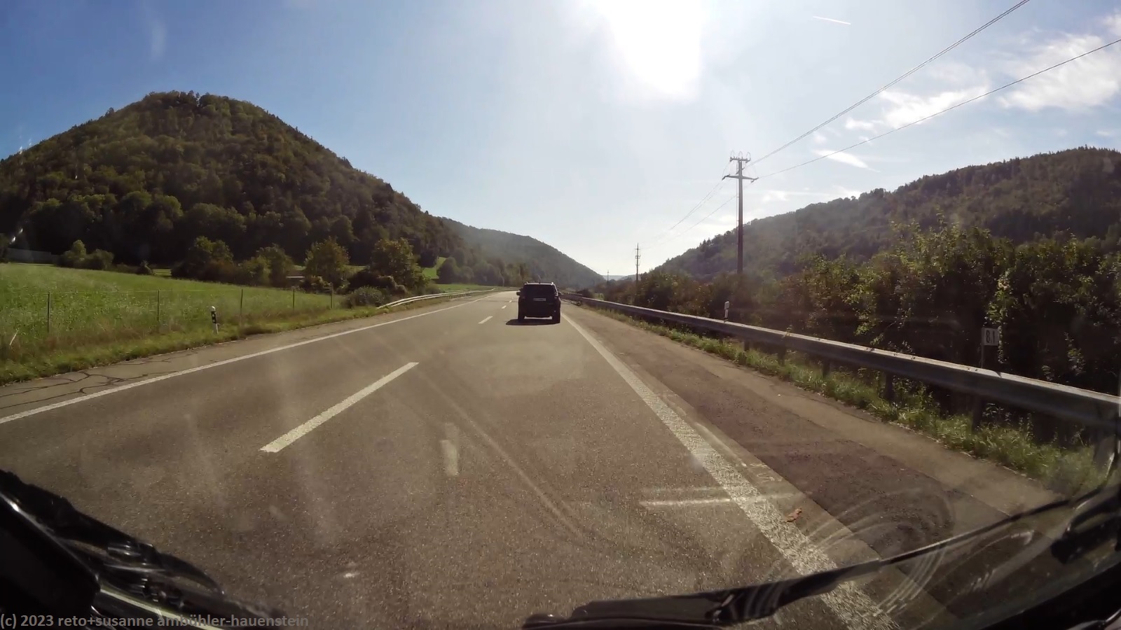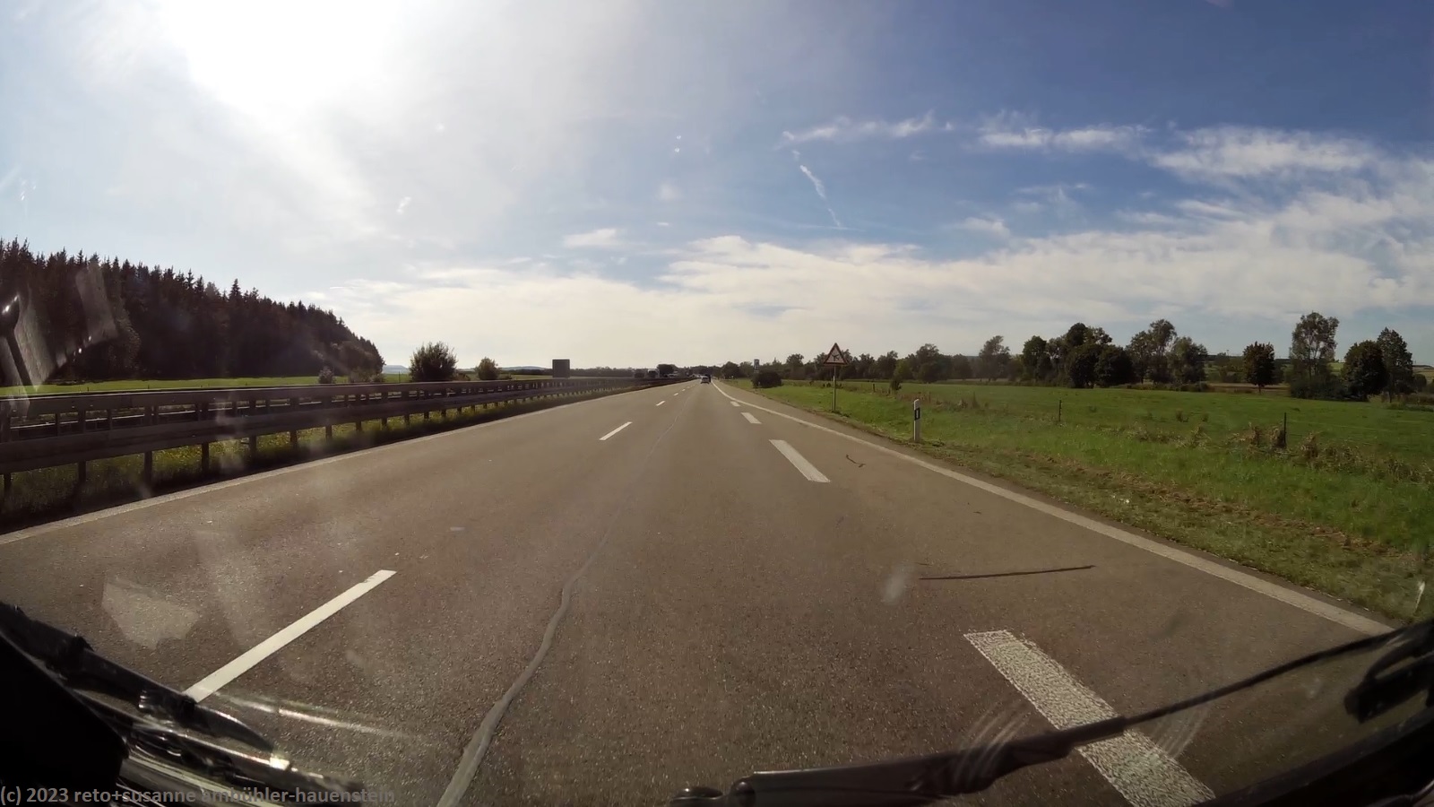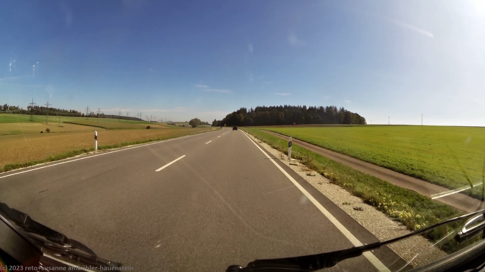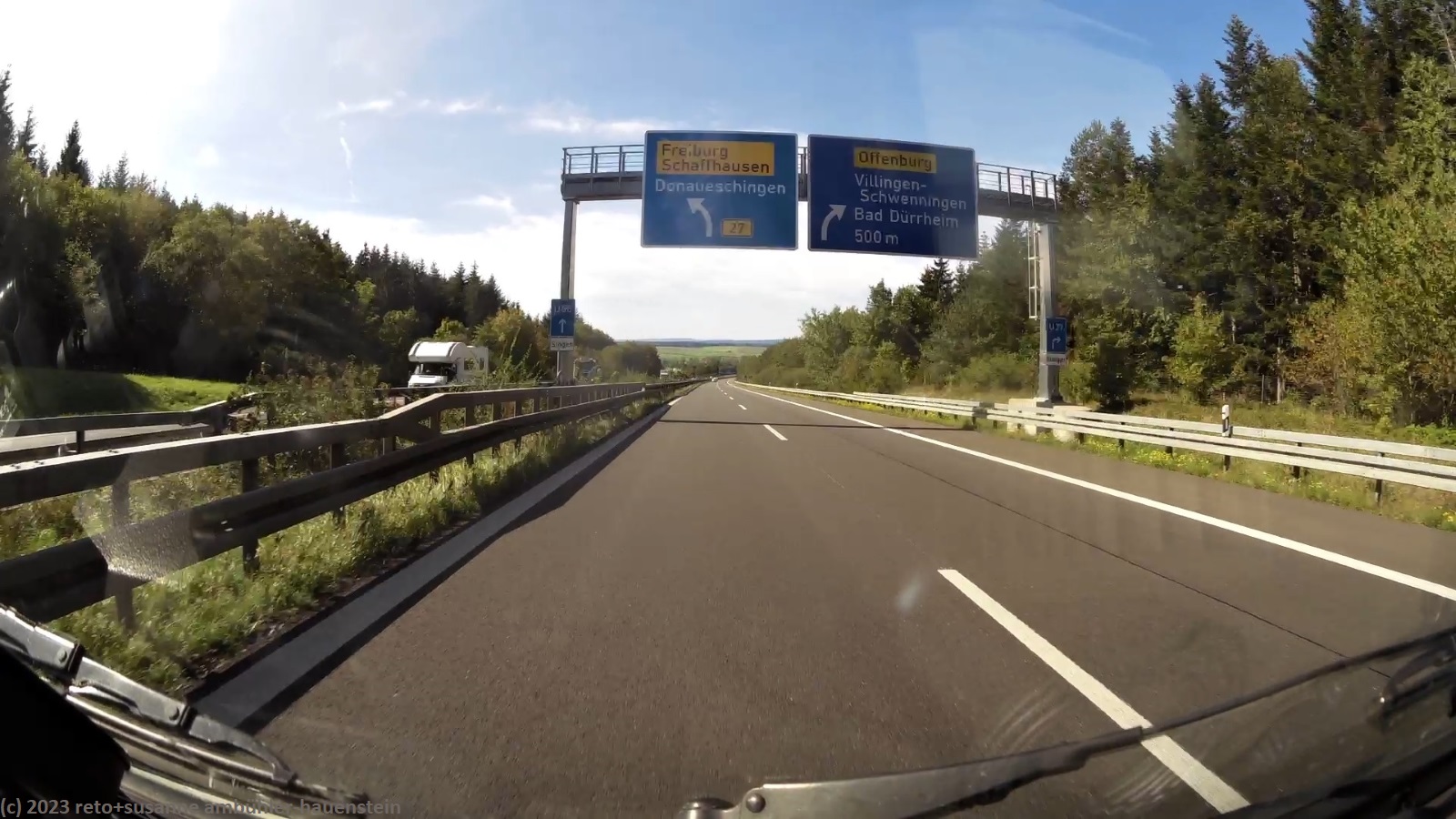 kurz vor 10 uhr nehmen wir die letzten kilometer dieser langen reise unter die räder. bevor wir in der stadt auf die B19 einfahren, tanken wir unseren wagen auf. schon bald sind wir auf der A3. das verkehrsaufkommen ist gering, wie in deutschland üblich sind vor allem lastwagen unterwegs. nach 7 km wechseln wir auf die A81 und fahren auf dieser südwärts. vor einem jahr war diese ausfahrt gesperrt und wir mussten über die landstrasse fahren, siehe tagebuch vom 14-aug-2022. auch hier ist das verkehrsaufkommen gering und die fahrt geht im eigenen tempo vorwärts. ab und zu hat es eine baustelle mit fahrbahn-reduktion oder -verengung, aber wir geraten nie in einen stau. einzig die komischen verkehrsmeldungen unserer navis sind etwas irritierend. sie behaupten hartnäckig, die A7 sei in unserem streckenverlauf gesperrt. nichts davon ist wahr, es läuft wie am schnürchen. in der weiteren umgebung von stuttgart sind einige ganz schnelle fahrzeuge unterwegs, aber auch das sind wir uns gewohnt. wir haben schon mehr schnellfahrer gesehen als heute. einige kilometer nach villingen-schwenningen will das navi auf die A864. unglücklicherweise folge ich diesem routenvorschlag und so geht es auf der erst vier- und dann zweispurigen B27 richtung landesgrenze. die landschaft ist allerdings sehr lieblich und der grenzübergang bei randen ist unbesetzt, so gelangen wir auch ganz locker in die schweiz. die ersparnis von 6 km gegenüber der fahrt über die autobahn hat sich wohl kaum gelohnt, aber so haben wir eine gegend gesehen, in der wir vorher meines wissens noch nie waren. ab schaffhausen geht es dann den gewohnten weg via winterthur ins zürcher oberland.