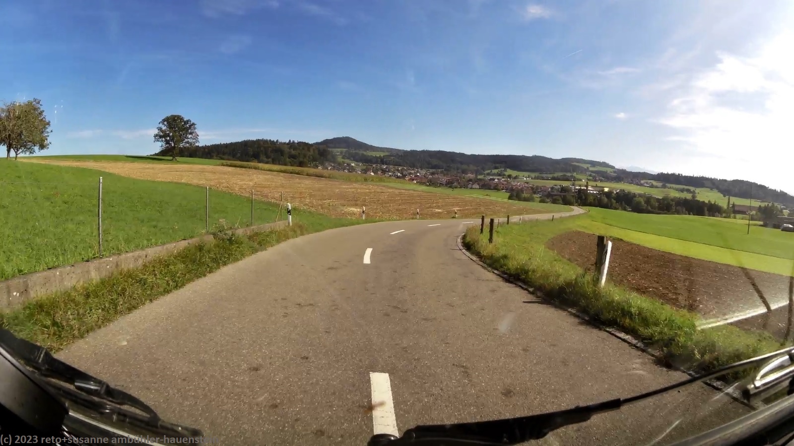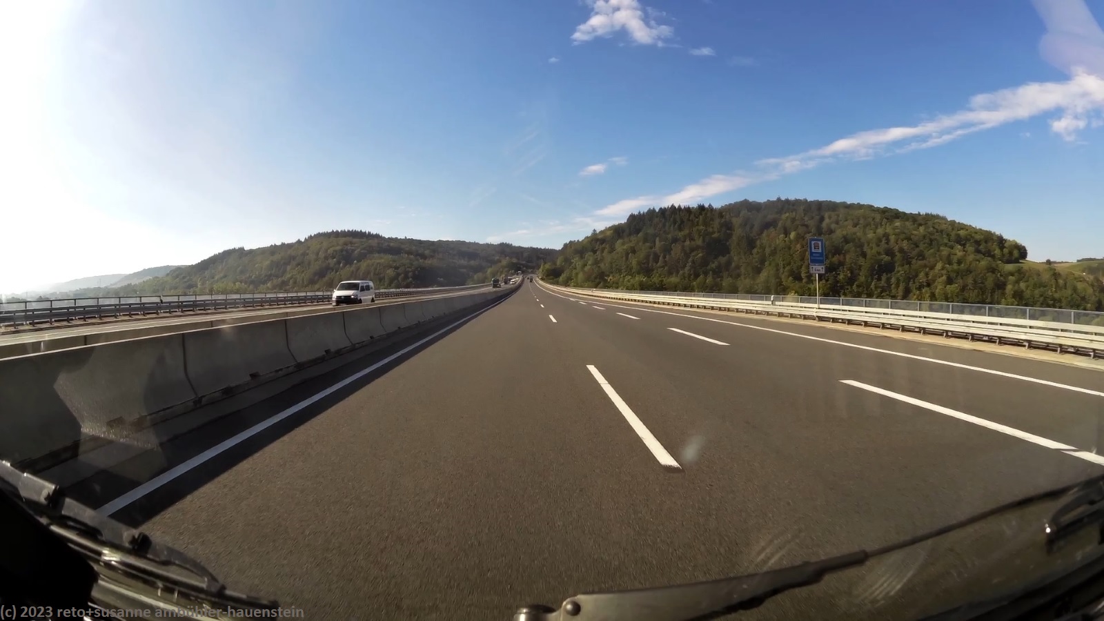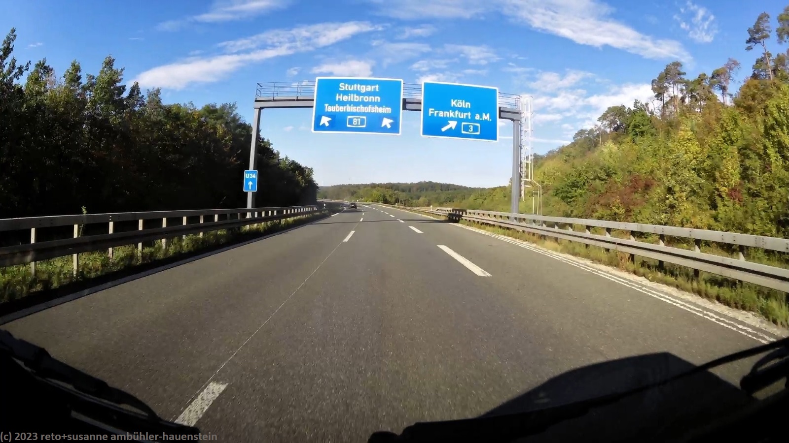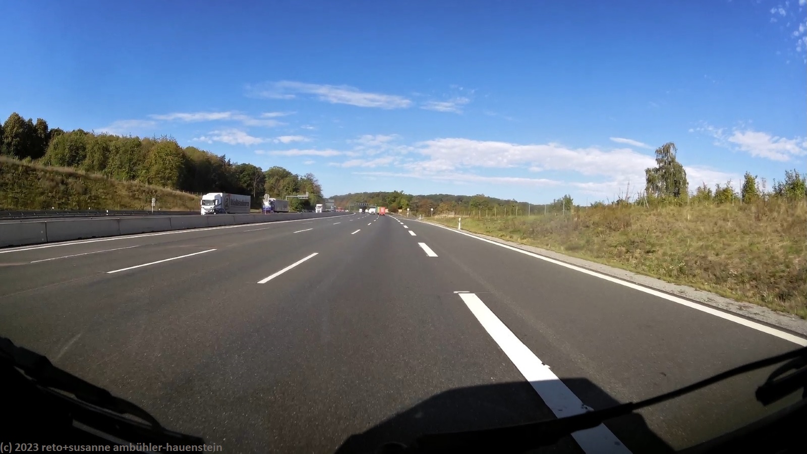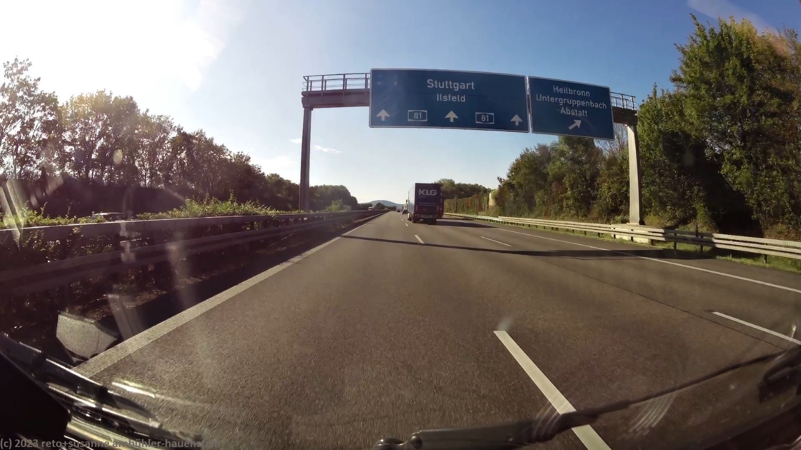 kurz vor 10 uhr nehmen wir die letzten kilometer dieser langen reise unter die räder. bevor wir in der stadt auf die B19 einfahren, tanken wir unseren wagen auf. schon bald sind wir auf der A3. das verkehrsaufkommen ist gering, wie in deutschland üblich sind vor allem lastwagen unterwegs. nach 7 km wechseln wir auf die A81 und fahren auf dieser südwärts. vor einem jahr war diese ausfahrt gesperrt und wir mussten über die landstrasse fahren, siehe tagebuch vom 14-aug-2022. auch hier ist das verkehrsaufkommen gering und die fahrt geht im eigenen tempo vorwärts. ab und zu hat es eine baustelle mit fahrbahn-reduktion oder -verengung, aber wir geraten nie in einen stau. einzig die komischen verkehrsmeldungen unserer navis sind etwas irritierend. sie behaupten hartnäckig, die A7 sei in unserem streckenverlauf gesperrt. nichts davon ist wahr, es läuft wie am schnürchen. in der weiteren umgebung von stuttgart sind einige ganz schnelle fahrzeuge unterwegs, aber auch das sind wir uns gewohnt. wir haben schon mehr schnellfahrer gesehen als heute. einige kilometer nach villingen-schwenningen will das navi auf die A864. unglücklicherweise folge ich diesem routenvorschlag und so geht es auf der erst vier- und dann zweispurigen B27 richtung landesgrenze. die landschaft ist allerdings sehr lieblich und der grenzübergang bei randen ist unbesetzt, so gelangen wir auch ganz locker in die schweiz. die ersparnis von 6 km gegenüber der fahrt über die autobahn hat sich wohl kaum gelohnt, aber so haben wir eine gegend gesehen, in der wir vorher meines wissens noch nie waren. ab schaffhausen geht es dann den gewohnten weg via winterthur ins zürcher oberland.