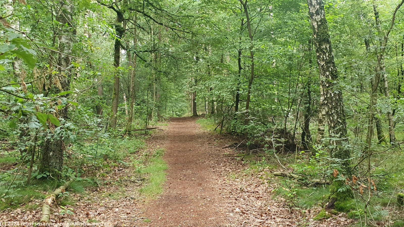 die nacht ist sehr ruhig. es regnet zumindest einmal ziemlich heftig. wir schlafen gut. als wir um 08:30 uhr aufstehen, fällt leichter nieselregen. wir gehen zu fuss zum bauernhof auf der anderen strassenseite und kaufen heidelbeeren für's frühstück. auf dem rückweg nehmen wir die bestellten brötchen mit. essen müssen wir im auto, denn der nieselregen hat sich ziemlich verstärkt. gegen 10:45 uhr fahren wir ins nahe schneverdingen und kaufen lebensmittel für die nächsten beiden tage ein. der regen hat inzwischen aufgehört. die kompakte wolkenschicht beginnt sich etwas aufzulockern, wir sehen winzig kleine blaue flecken am himmel. auf der suche nach dem parkplatz beim ausgangsort unserer heutigen wanderung fahren wir durch ein nettes einfamilienhaus-quartier. schliesslich werden wir beim heidegarten fündig und parkieren unseren wagen im schatten der bäume.